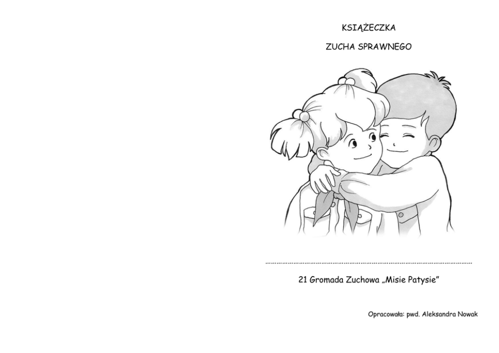 KSIĄŻECZKA ZUCHA SPRAWNEGO ………………………………………………………………………………………………… 21 Gromada Zuchowa „Misie Patysie” Opracowała: pwd. Aleksandra Nowak JA W przyszłości chciałabym być ……………………………………, opowiedziałam o tym na zbiórce. Nazywam się ………………………………… ………………………………………………………………… Urodziny obchodzę …………………… ……………………………………………………………… Narysowałam swój portret. Moje oczy są koloru ………………………………, a włosy są……………………………………………… Narysowałam swoje marzenie: W wolnym czasie lubię ……………………………………………………………………………… ………………………………………………………………………………………………………………………………… To jest mój ulubiony: *kolor *potrawa *zabawka Umiem rozpoznać emocje. Do każdego podpisu namalowałam odpowiednią minę. Radość Smutek Zdziwienie Gniew Strach MOJA GROMADA Zawsze schludnie noszę swój mundurek. Na zbiórce wytłumaczę dlaczego nie powinien być pomięty i wyjęty ze spodni. Narysowałam Moja gromada ma numer…… i nazywa się………………………....... siebie w mundurku zuchowym. W Kręgu Rady opowiedziałam co oznacza ta nazwa. Na zbiórce używamy dwóch okrzyków. Napisałam je: Na rozpoczęcie: „……………………………………………………………………………………………………………………………… …………………………………………………………………………..” Na zakończenie: „……………………………………………………………………………………………………………………………… ………………………………………………….” W kręgu rady opisałam z pamięci jak wygląda nasz totem oraz co oznaczają jego poszczególne elementy. Krąg Rady to miejsce gdzie: ……………………………………………………………………………………… ……………………………………………………………………………………… ……………………………………………………………………………………… Często się tam wypowiadam. Ostatnio zabrałam tam głos w sprawie……… ……………………………………………………………………………………… ………………………………………………………………………………………. Moja drużynowa ma na imię …………… i ma stopień………….………, a moja przyboczna to...........................i ma stopień………..................……. Pomogłam nowemu zuchowi w naszej gromadzie poznać wszystkie nasze obrzędy i zasady. Regularnie chodzę na zbiórki. Pokolorowałam jeden element piłki na zielono za każdą zbiórkę na której byłam, a na pomarańczowo za każdy biwak/imprezę. OBIETNICA, PRAWO ZUCHA, GWIAZDKI Znam treść obietnicy zuchowej: „………………………………………………………………………………………………………”. Tak wygląda mój znaczek zucha. Napisałam, Który element co oznacza. Biały orzeł…………………………………………………………………… Słońce………………………………………………………………………….. Napis „ZUCH”……………………………………………………………… Wiem co oznacza skrót: ZHP-……………………………………………………………………………………………………………………… Umiem prawo zucha. Uzupełniłam brakujące słowa. 1. Zuch …………………… Boga i …………………. 2. ………………… jest ……………………. 3. Zuch mówi ……………………. 4. Zuch ………………… o swoich ……………………………. 5. …………………………… jest z ……………………… dobrze. 6. Zuch ………………… się …………… coraz ………………………. Pierwszą gwiazdkę zdobyłam ………………………………… (data). Tak wyglądało moje nadanie gwiazdki: MOJA RODZINA I MÓJ DOM Narysowałam drzewo genealogiczne mojej rodziny (z dziadkami i najbliższymi ciociami, wujkami, kuzynostwem) Wiem kiedy moi najbliżsi mają urodziny i imieniny. Wypisałam je Kto? Urodziny Imieniny Mama Tata Rodzeństwo-………………. Rodzeństwo-………………. To są moje obowiązki domowe: Na Wiosnę W Lato Na Jesień W Zimę Poprosiłam mamę o podpis-potwierdzenie, że je wykonuje. SZKOŁA Często pomagam swoim kolegom i koleżanką. Np.: *w szkole…………………………………………………………………………………………………………… Nauczyłam się nowych słówek w języku angielskim. Napisałam je: Mama……………………………………………………Dom…………………………………………………… Tata………………………………………………………Brat…………………………………………………… Książka…………………………………………………Siostra……………………………………………… ……………………………………………………………………………………………………………………………… *na zbiórce…………………………………………………………………………………………………………… ………………………………………………………………………………………………………………………………… *na podwórku…………………………………………