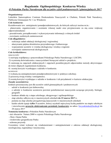 Regulamin Ogólnopolskiego Konkursu Wiedzy O Poleskim Parku Narodowym dla uczniów szkół podstawowych i gimnazjalnych 2017 Organizatorzy: Lubelskie Samorządowe Centrum Doskonalenia Nauczycieli w Chełmie, Poleski Park Narodowy, Publiczne Gimnazjum Nr 1 we Włodawie Cele konkursu: Kształtowanie tzw. umiejętności ponadprzedmiotowych, do których zaliczyć można m.in.: - planowanie, organizowanie i ocenianie własnej nauki oraz przyjmowanie za nią coraz większej odpowiedzialności - poszukiwanie, porządkowanie i wykorzystywanie informacji z różnych źródeł - rozwijanie osobistych zainteresowań Cele długofalowe: - realizacja zadań edukacji ekologicznej i regionalnej - ukazywanie piękna dziedzictwa przyrodniczego i kulturowego - wyposażenie uczniów w wiedzę ekologiczną i wiedzę o regionie - rozwijanie zainteresowań ekologicznych Cele krótkofalowe: nauczyciele: 1) nawiążą współpracę z pracownikami Poleskiego Parku Narodowego i LSCDN; 2) wymienią doświadczenia z nauczycielami biorącymi udział w projekcie; 3) zastosują na zajęciach edukacyjnych i zajęciach pozalekcyjnych odpowiednie metody aktywizujące do treści objętych regulaminem konkursu; 4) ocenią korzyści wynikające z udziału w konkursie. uczniowie: 1) wykażą się umiejętnościami ponadprzedmiotowymi w praktyce szkolnej; 2) poszerzą swoją wiedzę i umiejętności; 3) ocenią korzyści wynikające z udziału w konkursie i ich przydatność w karierze edukacyjne. Zasady uczestnictwa: konkurs przeznaczony jest dla uczniów szkół gimnazjalnych i podstawowych - udział w konkursie jest dobrowolny - o udziale w konkursie uczniowie powinni poinformować nauczyciela uczącego przyrody, biologii, geografii - konkurs składa się z etapu szkolnego, okręgowego i ogólnopolskiego - etap szkolny odbywa się w macierzystych szkołach do 23 marca 2017 r. - pytania na etap szkolny przygotowują nauczyciele w macierzystych szkołach - każda szkoła typuje tylko 3 uczniów, którzy uzyskali najwyższą liczbę punktów na etapie szkolnym i niezwłocznie przesyła elektronicznie protokoły konkursów na adres: [email protected] do 28 marca 2017 Tematyka konkursu o Poleskim Parku Narodowym - sieć obszarów Natura 2000 w rejonie Poleskiego Parku Narodowego - flora i fauna Parku - środowisko geograficzne Parku - ochrona przyrody Uczestnicy winni wykazać się wiadomościami i umiejętnościami z zakresu edukacji ekologicznej, sozologicznej, regionalnej i turystycznej. 1 Forma konkursu: Etap szkolny: -forma pisemna (test powinien składać się z zadań zamkniętych i otwartych) Etap okręgowy: -forma pisemna (test składa się z zadań zamkniętych i otwartych), zadania układa autor projektu przy współpracy z pracownikami PPN. Do etapu okręgowego kwalifikują się uczniowie, którzy otrzymali 80% prawidłowych odpowiedzi (szkoły gimnazjalne) i 70% (szkoły podstawowe) Etap ogólnopolski: - część teoretyczna (test z ww. tematyki składający się z zadań zamkniętych i otwartych). (uczniowie szkół podstawowych i gimnazjów) - część praktyczna: (tylko dla 10 najlepszych uczniów gimnazjum) uczniowie, którzy uzyskali najlepsze wyniki w części pisemnej odpowiadają na 3 wylosowane pytania. Uczniowie szkół podstawowych uczestniczą tylko w części teoretycznej. O zajętym miejscu przez ucznia gimnazjum i uzyskaniu tytułu laureata etapu ogólnopolskiego decyduje suma punktów z części praktycznej i teoretycznej. Laureatami zostaje 10 uczniów szkół podstawowych i 10 uczniów gimnazjum. Etap Szkolny Termin do 23 marca 2016 Godzina wg możliwości Okręgowy 26 kwietnia 2017 10.00 Ogólnopolski 07 czerwca 2017 10.00 Miejsce Macierzysta szkoła * Publiczne Gimnazjum nr 1 we Włodawie 22-200 Włodawa, ul. Szkolna 7 dla powiatu włodawskiego, parczewskiego i bialskopodlaskiego; * LSCDN ul. Waśniewskiego 17 22-100 Chełm dla powiatu chełmskiego, krasnostawskiego, zamojskiego, hrubieszowski, biłgorajskiego i pozostałych (zgodnie ze zgłoszeniem). LSCDN ul. Dominikańska 5 Lublin, dla pozostałych (zgodnie ze zgłoszeniem). Siedziba PPN w Urszulinie 22 - 234 Urszulin, ul Lubelska 3a W skład komisji etapu ogólnopolskiego wchodzą nauczyciele szkół podstawowych i gimnazjalnych uczniów biorących udział w konkursie. Komisja dopuszcza obniżenie kryteriów oceny oraz punktacji. Laureaci etapu ogólnopolskiego otrzymują zaświadczenia i nagrody rzeczowe. Wszyscy uczestnicy etapu ogólnopolskiego i ich opiekunowie otrzymują materiały wydawnicze Poleskiego Parku Narodowego. Nauczyciele otrzymują podziękowania za przygotowanie uczniów do konkursu. Informacje o konkursie ukażą się w prasie i na stronach internetowych: PPN www.poleskipn.pl; PG 1 www.pg1.wlodawa.pl; LSCDN www.lscdn.pl; www.lasypolskie.pl Literatura : - Przewodnik turystyczny. Chełmskie. Lublin 1998. Wyd. PROMOTOR. - W krainie jezior, moczarów i bagien”, Lublin 1992, TWWP. - Poleski Park Narodowy. Przewodnik. Historia-Przyroda-Turystyka. Lublin 1998. - Muzeum Poleskiego Parku Narodowego. PPN. Urszulin 1996. - Między Bugiem a Wisłą. Skarby przyrody i kultury. Lublin 2000. - Poleski Park Narodowy. Multico, 2002, przewodnik kieszonkowy. - Wydawnictwa ciągłe: „Parki Narodowe”, Przyroda Polska”, „Aura”. - Podręczniki do przyrody i biologii Wydawnictwa Poleskiego Parku Narodowego: - KSIĄŻKA O PPN (album); POLESKI PARK NARODOWY; Książka ilustrowana; Przewodniki po ścieżkach przyrodniczych i szlakach PPN: "DĄB DOMINIK", "PEREHOD", SPŁAWY", "MIETIUŁKA”, "NAŁĘCZ"; Przewodnik „MUZEUM PPN”; PRZEWODNIK POLESKIEGO PARKU NARODOWEGO; Foldery: „Edukacja”, „Cietrzew”, „Żółw błotny”, „Żuraw”, „Edukacja i zwiedzanie”. ZESZYT do ćwiczeń edukacyjnych; Pakiet edukacyjny z 2 filmem o PPN; MONOGRAFIA PRZYRODNICZA PPN; FILM Poleski Park Narodowy (film na kasecie lub płycie CD zrealizowany w latach 2001-2002 przez zespół Studio Beta); MAPA PPN; Monografia Rezerwat Biosfery „Polesie