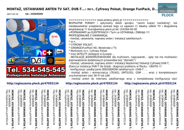MONTAŻ, USTAWIANIE ANTEN TV SAT, DVB-T...: nc+, Cyfrowy Polsat, Orange FunPack, D... tel.: 243649200 2017-02-24 http://ogloszenia.plock.pl/47055134 MONTAŻ, USTAWIANIE ANTEN T.. tel.: 243649200 http://ogloszenia.plock.pl/47055134 MONTAŻ, USTAWIANIE ANTEN T.. tel.: 243649200 http://ogloszenia.plock.pl/47055134 MONTAŻ, USTAWIANIE ANTEN T.. tel.: 243649200 http://ogloszenia.plock.pl/47055134 MONTAŻ, USTAWIANIE ANTEN T.. tel.: 243649200 http://ogloszenia.plock.pl/47055134 MONTAŻ, USTAWIANIE ANTEN T.. tel.: 243649200 http://ogloszenia.plock.pl/47055134 MONTAŻ, USTAWIANIE ANTEN T.. tel.: 243649200 http://ogloszenia.plock.pl/47055134 MONTAŻ, USTAWIANIE ANTEN T.. tel.: 243649200 http://ogloszenia.plock.pl/47055134 MONTAŻ, USTAWIANIE ANTEN T.. tel.: 243649200 http://ogloszenia.plock.pl/47055134 MONTAŻ, USTAWIANIE ANTEN T.. tel.: 243649200 http://ogloszenia.plock.pl/47055134 MONTAŻ, USTAWIANIE ANTEN T.. tel.: 243649200 http://ogloszenia.plock.pl/47055134 MONTAŻ, USTAWIANIE ANTEN T.. tel.: 243649200 http://ogloszenia.plock.pl/47055134 MONTAŻ, USTAWIANIE ANTEN T.. tel.: 243649200 http://ogloszenia.plock.pl/47055134 MONTAŻ, USTAWIANIE ANTEN T.. tel.: 243649200 http://ogloszenia.plock.pl/47055134 MONTAŻ, USTAWIANIE ANTEN T.. tel.: 243649200 http://ogloszenia.plock.pl/47055134 MONTAŻ, USTAWIANIE ANTEN T.. tel.: 243649200 http://ogloszenia.plock.pl/47055134 ============== www.anteny-plock.pl ============= BEZPŁATNE PORADY i optymalny dobór sprzętu: "zanim kupisz marketing", lub nieodpowiednie urządzenia zamiast tego co zapewni Ci idealny odbiór TV i długoletnią eksploatację !!! [email protected] tel: (24)364-92-00 >POPRAWIAMY po ELEKTRYKACH i Tych co USTAWIAJĄ i ZNIKAJĄ !!!! PROFESJONALNIE Z GWARANCJĄ: - montaż, ustawianie, naprawy anten i instalacji satelitarnych : * nc+, * CYFROWY POLSAT, * (ORANGE)FunPack HD, Neostrada z TV, * Multiroom nc+, Cyfrowy Polsat * Inne SATELITY dostępne w Europie ... - INSTALACJE JEDNOPRZEWODOWE dla multiroom, nagrywarek... (gdy nie ma możliwości poprowadzenia dodatkowych przewodów bez "demolki") - montaż, ustawianie, naprawy anten i instalacji Naziemnej Telewizji Cyfrowej DVB-T, Zbiorcza instalacja DVB-T źle działa : diagnoza problemu w Płocku - GRATIS !!! - konfiguracja i podłączanie DEKODERÓW satelitarnych i DVB-T .... - montaż anten i wzmacniaczy LTE(4G), UMTS(3G), GSM ... , wraz z kompleksowym uruchomieniem sieci Wi-Fi lub LAN - montaż anten do internetu satelitarnego wraz z kompleksową konfiguracja sieci komputerowej http://ogloszenia.plock.pl/47055134 http://ogloszenia.plock.pl/47055134 - montaż systemów MONITORINGU i ich integracja z instalacjami TV i TV-SAT ; "wideodomofon na każdym telewizorze" więcej na ** www.kamery-plock.pl ** ### Masz dość rdzy na swojej antenie satelitarnej - zapytaj nas o Aluminiowe Anteny Satelitarne - 15 lat gwarancji i szeroka gama kolorów....(Udostępniamy wzornik kolorów dla zainteresowanych doborem optymalnego koloru anteny do elewacji, dachu ...) *** Pomarańczowa antena satelitarna denerwuje Cię ? Rozwiążemy ten problem ZADZWOŃ *** UWAGA !!! Za pomocą wszystkich anten DVB-T i SATELITARNYCH możesz odebrać sygnał w jakości HD. Nie ma czegoś takiego jak "Antena HD", "Inteligentna antena", "Ustawienie anten do odbioru kanałów HD" ... - zapytaj dlaczego? * POMIARY SYGNAŁU DVB-T i TV SAT oraz ocena warunków technicznych montażu ANTEN na terenie PŁOCKA GRATIS !!! ============== www.anteny-plock.pl ============= >>> https://www.facebook.com/montazantenplock <<<<<