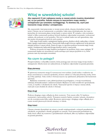 Till Nyanländ elev från 12 år, i de obligatoriska skolformerna Witaj w szwedzkiej szkole! Aby zapewnić Ci jak najlepszą naukę w naszej szkole musimy dowiedzieć się, co już potrafisz. Szkoła nazywa to tworzeniem mapy wiedzy i umiejętności (po szwedzku kartläggning). Tu dowiesz się, czym jest tworzenie mapy wiedzy i umiejętności. My, nauczyciele i inni pracownicy w twojej nowej szkole, chcemy dowiedzieć się kim jesteś. Chcemy się też zorientować, co potrafisz i jakie masz doświadczenia. Jest nam to potrzebne do stworzenia planu twojej nauki w naszej szkole. W związku z tym weźmiesz udział w kilku rozmowach, podczas których będziesz odpowiadać na pytania i wykonywać zadania, aby pokazać, co już potrafisz. Nie jest to jednak żaden test ani sprawdzian, więc nie musisz się przygotowywać do tych rozmów. Gdy mapa twojej wiedzy i umiejętności będzie gotowa, dyrektor szkoły zadecyduje, w której klasie i grupie rozpoczniesz naukę. Nauczyciele będą mogli wówczas zaplanować twoje pierwsze miesiące pobytu w naszej szkole. Zatem do tego, co opowiesz podczas tworzenia mapy twojej wiedzy i umiejętności, będą mieli dostęp dyrektor szkoły i nauczyciele. Podczas tworzenia tej mapy będziesz posługiwać się językiem, który znasz najlepiej. W rozmowach będzie też uczestniczyć osoba mówiąca tym samym językiem co ty, która pomoże nam się nawzajem zrozumieć. Na czym to polega? Przeprowadzimy z tobą kilka rozmów, które pomogą nam stworzyć mapę twojej wiedzy i umiejętności. Szkoła może też zadecydować, że będziesz odpowiadać na pytania pisemnie. Etap pierwszy W pierwszej rozmowie mogą Ci towarzyszyć twoi rodzice. Jeżeli żaden z rodziców nie może uczestniczyć w naszym spotkaniu, możesz zabrać ze sobą inną dorosłą osobę, która się Tobą opiekuje. Taka osoba w Szwecji nazywa się opiekunem (förmyndare) lub kuratorem (god man). Będziemy rozmawiać o tym, jakimi językami się posługujesz, o twojej wcześniejszej edukacji, doświadczeniach i zainteresowaniach. Będziesz też mieć możliwość opowiedzenia o tym, co myślisz o chodzeniu do szkoły. Nauczyciel opowie ci więcej o naszej szkole, otym jak to jest chodzić do szkoły w Szwecji. Etap drugi Podczas drugiego etapu odbędą się dwie rozmowy. Tym razem tylko Ty będziesz rozmawiać z personelem szkoły. Tematem rozmów będzie czytanie i pisanie, dostaniesz też do rozwiązywania kilka zadań. Rozmowy pierwszego i drugiego etapu odbędą się w czasie twoich pierwszych dwóch miesięcy w szkole. Etap trzeci Chcemy również dowiedzieć się więcej o twoich wiadomościach z różnych przedmiotów szkolnych, na przykład z chemii, geografii czy muzyki. Twój nauczyciel powiadomi cię, kiedy może odbyć się rozmowa o przedmiotach szkolnych, albo czy będziesz odpowiadać na pytania pisemnie. POL Polska Szwedzkie kuratorium oświaty Gdzie można znaleźć więcej informacji? www.omsvenskaskolan.se www.skolverket.se/nyanlanda POL Polska