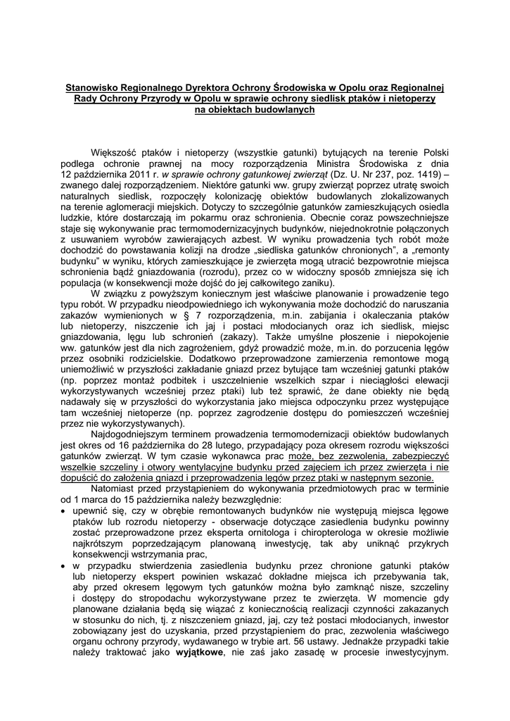 Stanowisko Regionalnego Dyrektora Ochrony Środowiska w Opolu oraz Regionalnej Rady Ochrony Przyrody w Opolu w sprawie ochrony siedlisk ptaków i nietoperzy na obiektach budowlanych Większość ptaków i nietoperzy (wszystkie gatunki) bytujących na terenie Polski podlega ochronie prawnej na mocy rozporządzenia Ministra Środowiska z dnia 12 października 2011 r. w sprawie ochrony gatunkowej zwierząt (Dz. U. Nr 237, poz. 1419) – zwanego dalej rozporządzeniem. Niektóre gatunki ww. grupy zwierząt poprzez utratę swoich naturalnych siedlisk, rozpoczęły kolonizację obiektów budowlanych zlokalizowanych na terenie aglomeracji miejskich. Dotyczy to szczególnie gatunków zamieszkujących osiedla ludzkie, które dostarczają im pokarmu oraz schronienia. Obecnie coraz powszechniejsze staje się wykonywanie prac termomodernizacyjnych budynków, niejednokrotnie połączonych z usuwaniem wyrobów zawierających azbest. W wyniku prowadzenia tych robót może dochodzić do powstawania kolizji na drodze „siedliska gatunków chronionych”, a „remonty budynku” w wyniku, których zamieszkujące je zwierzęta mogą utracić bezpowrotnie miejsca schronienia bądź gniazdowania (rozrodu), przez co w widoczny sposób zmniejsza się ich populacja (w konsekwencji może dojść do jej całkowitego zaniku). W związku z powyższym koniecznym jest właściwe planowanie i prowadzenie tego typu robót. W przypadku nieodpowiedniego ich wykonywania może dochodzić do naruszania zakazów wymienionych w § 7 rozporządzenia, m.in. zabijania i okaleczania ptaków lub nietoperzy, niszczenie ich jaj i postaci młodocianych oraz ich siedlisk, miejsc gniazdowania, lęgu lub schronień (zakazy). Także umyślne płoszenie i niepokojenie ww. gatunków jest dla nich zagrożeniem, gdyż prowadzić może, m.in. do porzucenia lęgów przez osobniki rodzicielskie. Dodatkowo przeprowadzone zamierzenia remontowe mogą uniemożliwić w przyszłości zakładanie gniazd przez bytujące tam wcześniej gatunki ptaków (np. poprzez montaż podbitek i uszczelnienie wszelkich szpar i nieciągłości elewacji wykorzystywanych wcześniej przez ptaki) lub też sprawić, że dane obiekty nie będą nadawały się w przyszłości do wykorzystania jako miejsca odpoczynku przez występujące tam wcześniej nietoperze (np. poprzez zagrodzenie dostępu do pomieszczeń wcześniej przez nie wykorzystywanych). Najdogodniejszym terminem prowadzenia termomodernizacji obiektów budowlanych jest okres od 16 października do 28 lutego, przypadający poza okresem rozrodu większości gatunków zwierząt. W tym czasie wykonawca prac może, bez zezwolenia, zabezpieczyć wszelkie szczeliny i otwory wentylacyjne budynku przed zajęciem ich przez zwierzęta i nie dopuścić do założenia gniazd i przeprowadzenia lęgów przez ptaki w następnym sezonie. Natomiast przed przystąpieniem do wykonywania przedmiotowych prac w terminie od 1 marca do 15 października należy bezwzględnie: upewnić się, czy w obrębie remontowanych budynków nie występują miejsca lęgowe ptaków lub rozrodu nietoperzy - obserwacje dotyczące zasiedlenia budynku powinny zostać przeprowadzone przez eksperta ornitologa i chiropterologa w okresie możliwie najkrótszym poprzedzającym planowaną inwestycję, tak aby uniknąć przykrych konsekwencji wstrzymania prac, w przypadku stwierdzenia zasiedlenia budynku przez chronione gatunki ptaków lub nietoperzy ekspert powinien wskazać dokładne miejsca ich przebywania tak, aby przed okresem lęgowym tych gatunków można było zamknąć nisze, szczeliny i dostępy do stropodachu wykorzystywane przez te zwierzęta. W momencie gdy planowane działania będą się wiązać z koniecznością realizacji czynności zakazanych w stosunku do nich, tj. z niszczeniem gniazd, jaj, czy też postaci młodocianych, inwestor zobowiązany jest do uzyskania, przed przystąpieniem do prac, zezwolenia właściwego organu ochrony przyrody, wydawanego w trybie art. 56 ustawy. Jednakże przypadki takie należy traktować jako wyjątkowe, nie zaś jako zasadę w procesie inwestycyjnym. Uzyskanie ww. zezwolenia nie jest wymagane w przypadku usuwania, w okresie od dnia 16 października do końca lutego, gniazd ptasich z obiektów budowlanych i terenów zieleni, jeżeli wymagają tego względy bezpieczeństwa lub sanitarne, jednak pod warunkiem, iż dla planowanych czynności brak rozwiązań alternatywnych oraz gdy nie będzie to szkodliwe dla zachowania we właściwym stanie ochrony populacji tych gatunków i ich siedlisk (§ 8 ust. 2 rozporządzenia). Powyższe zezwolenie może być wydane jedynie w przypadku wystąpienia łącznie trzech warunków, tj.: braku rozwiązań alternatywnych, jeżeli czynności te nie są szkodliwe dla zachowania we właściwym stanie ochrony dziko występujących populacji chronionych gatunków roślin, zwierząt lub grzybów oraz gdy zachodzi jedna z przesłanek wymieniona w art. 56 ust. 4 pkt od 1 do 7 ustawy. Brak spełnienia jednego z ww. warunków skutkuje odmową wydania zezwolenia, po przeprowadzeniu prac remontowych należy, w miarę możliwości, umożliwić ptakom i nietoperzom dalsze występowanie w obiektach budowlanych, poprzez stworzenie na remontowanych budynkach siedlisk zastępczych w postaci, np. budek lęgowych. Ich charakter, lokalizacja, parametry techniczne i zagęszczenie powinny być dobrane przez specjalistę ornitologa i chiropterologa odpowiednio do preferencji gatunków, które występowały tam wcześniej (przykładowe wymiary budek lęgowych oraz sposoby i miejsce ich umieszczenia zawierają załączniki nr 1, nr 2 i nr 3 do niniejszego pisma), w przypadkach, gdy obiekt budowlany wykorzystywany był przez jerzyki Apus apus, a w ramach remontu stropodach budynku ocieplono materiałami sypkimi (np. przy użyciu granulatu wełny mineralnej, granulatu styropianu fibry celulozowej), należy całkowicie zrezygnować z pozostawiania otwartych otworów do stropodachów, gdyż materiały uży