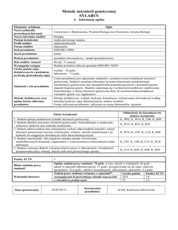 Metody inżynierii genetycznej SYLABUS - BIOL