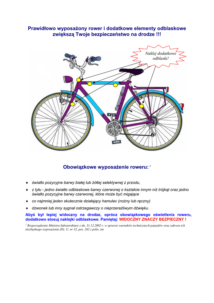 Prawidłowo wyposażony rower i dodatkowe elementy odblaskowe zwiększą Twoje bezpieczeństwo na drodze !!! Naklej dodatkowe odblaski! Obowiązkowe wyposażenie roweru: 1 ♦ światło pozycyjne barwy białej lub żółtej selektywnej z przodu, ♦ z tyłu - jedno światło odblaskowe barwy czerwonej o kształcie innym niż trójkąt oraz jedno światło pozycyjne barwy czerwonej, które może być migające ♦ co najmniej jeden skutecznie działający hamulec (nożny lub ręczny) ♦ dzwonek lub inny sygnał ostrzegawczy o nieprzeraźliwym dźwięku. Abyś był lepiej widoczny na drodze, oprócz obowiązkowego oświetlenia roweru, dodatkowo stosuj naklejki odblaskowe. Pamiętaj: WIDOCZNY ZNACZY BEZPIECZNY ! 1 Rozporządzenie Ministra Infrastruktury z dn. 31.12.2002 r. w sprawie warunków technicznych pojazdów oraz zakresu ich niezbędnego wyposażenia (Dz. U. nr 32, poz. 262 z późn. zm