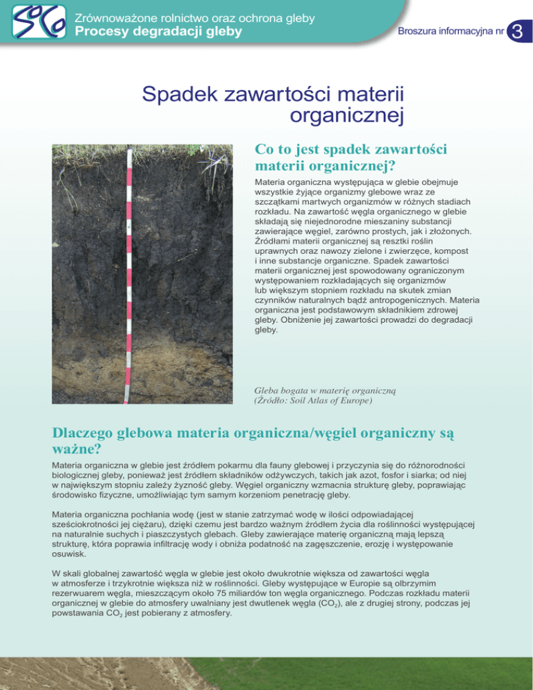 Zrównoważone rolnictwo oraz ochrona gleby Procesy degradacji gleby Broszura informacyjna nr Spadek zawartości materii organicznej Co to jest spadek zawartości materii organicznej? Materia organiczna występująca w glebie obejmuje wszystkie żyjące organizmy glebowe wraz ze szczątkami martwych organizmów w różnych stadiach rozkładu. Na zawartość węgla organicznego w glebie składają się niejednorodne mieszaniny substancji zawierające węgiel, zarówno prostych, jak i złożonych. Źródłami materii organicznej są resztki roślin uprawnych oraz nawozy zielone i zwierzęce, kompost i inne substancje organiczne. Spadek zawartości materii organicznej jest spowodowany ograniczonym występowaniem rozkładających się organizmów lub większym stopniem rozkładu na skutek zmian czynników naturalnych bądź antropogenicznych. Materia organiczna jest podstawowym składnikiem zdrowej gleby. Obniżenie jej zawartości prowadzi do degradacji gleby. Gleba bogata w materię organiczną (Źródło: Soil Atlas of Europe) Dlaczego glebowa materia organiczna/węgiel organiczny są ważne? Materia organiczna w glebie jest źródłem pokarmu dla fauny glebowej i przyczynia się do różnorodności biologicznej gleby, ponieważ jest źródłem składników odżywczych, takich jak azot, fosfor i siarka; od niej w największym stopniu zależy żyzność gleby. Węgiel organiczny wzmacnia strukturę gleby, poprawiając środowisko fizyczne, umożliwiając tym samym korzeniom penetrację gleby. Materia organiczna pochłania wodę (jest w stanie zatrzymać wodę w ilości odpowiadającej sześciokrotności jej ciężaru), dzięki czemu jest bardzo ważnym źródłem życia dla roślinności występującej na naturalnie suchych i piaszczystych glebach. Gleby zawierające materię organiczną mają lepszą strukturę, która poprawia infiltrację wody i obniża podatność na zagęszczenie, erozję i występowanie osuwisk. W skali globalnej zawartość węgla w glebie jest około dwukrotnie większa od zawartości węgla w atmosferze i trzykrotnie większa niż w roślinności. Gleby występujące w Europie są olbrzymim rezerwuarem węgla, mieszczącym około 75 miliardów ton węgla organicznego. Podczas rozkładu materii organicznej w glebie do atmosfery uwalniany jest dwutlenek węgla (CO2), ale z drugiej strony, podczas jej powstawania CO2 jest pobierany z atmosfery. 3 Broszura informacyjna nr 3: Spadek zawartości materii organicznej Co powoduje spadek zawartości materii organicznej? Zawartość węgla organicznego w glebie uzależniona jest przede wszystkim od klimatu, składu granulometrycznego gleby, hydrologii, sposobu użytkowania gruntów i roślinności. Klimat Rozkład materii organicznej następuje szybciej w wyższych temperaturach, tak więc gleby w cieplejszym klimacie zawierają mniej materii organicznej niż gleby w klimacie chłodniejszym. Skład granulometryczny gleby Gleby drobnoziarniste zawierają więcej materii organicznej niż gleby gruboziarniste; lepiej zatrzymują składniki odżywcze i wodę, dzięki czemu zapewniają dobre warunki do wzrostu roślin. Gleby gruboziarniste są lepiej napowietrzone i w związku z tym obecność tlenu powoduje szybszy rozkład materii organicznej. Hydrologia gleby (odwadnianie) Im wyższa jest zawartość wilgoci w glebie, tym mniej jest w niej tlenu potrzebnego do rozkładu materii organicznej, przez co ta ostatnia kumuluje się. Użytkowanie gruntów (uprawa) W wyniku uprawy gleby wprowadzany jest do niej tlen i wzrasta jej średnia temperatura, co prowadzi do szybszego rozkładu materii organicznej. Materia organiczna jest również tracona ponieważ w wyniku erozji wymywane są górna warstwa gleby i próchnica. Ogólnie rzecz biorąc rośliny uprawne oddają do gleby mniej materii organicznej niż rodzima roślinność. Roślinność Korzenie mają ogromny wpływ na zawartość materii organiczną organicznej w glebie. Rośliny porastające zbiorowiska trawiaste zapuszczają głęboko korzenie, które w niżej położonych warstwach gleby ulegają procesowi rozkładu. W przypadku gleb leśnych natomiast proces rozkładu, w wyniku którego powstaje materia organiczna, zachodzi na powierzchni ściółki. Rośliny uprawne wytwarzają więcej nadziemnej biomasy niż korzeni. Udział materii organicznej w ziemi uprawnej zależny od praktyk gospodarowania gruntami, w tym od tego, czy pozostałości po uprawach są usuwane czy pozostawiane na polu. Miejsce i zasięg Przykład przestrzennej zmienności zawartości węgla organicznego w glebie (Źródło: Soil Atlas of Europe) Obecne zmiany sposobu użytkowania gruntów i zmiana klimatu spowodowały spadek zawartości węgla organicznego w glebie w ilości odpowiadającej 10 % całkowitej emisji paliw kopalnych w całej Europie. Ogólnie rzecz biorąc gleby o niskiej zawartości węgla organicznego występują w ciepłym i suchym klimacie, natomiast gleby o wysokiej zawartości węgla są znamienne dla klimatu chłodniejszego i bardziej wilgotnego. Prawie połowa gleb Europy ma niską zawartość materii organicznej – przede wszystkim na południu Europy, ale także na niektórych obszarach Francji, Wielkiej Brytanii i Niemiec. Zrównoważone rolnictwo oraz ochrona gleby Procesy degradacji gleby Broszura informacyjna nr W t/ha <20 21 - 40 41 - 60 61 - 80 81 - 100 101 - 200 201 - 400 >400 Cypr 00 250 250 500 500 in t C/ha < 20 21 - 40 000 11000 11 500 500 000 22 000 km km This map shows the actual carbon content of mineral soils in agricultural areas. The actual soil organic carbon content (Act SOC) refers to the amount of carbon (kg/m2 or t C/ha) derived by pedotransfer rule for the Soil Typological Units. The Act SOC (in %) is calculated from the equation: The pedotransfer rule (Jones et al. , 2004) provides its results in four classes: very low < 1.0 %, Low 1.1-2.0 %, medium 2.1-6.0 % and high > 6 %. The actual amount of soil organic carbon (kg/m2 or t C/ha) can then be calculated 