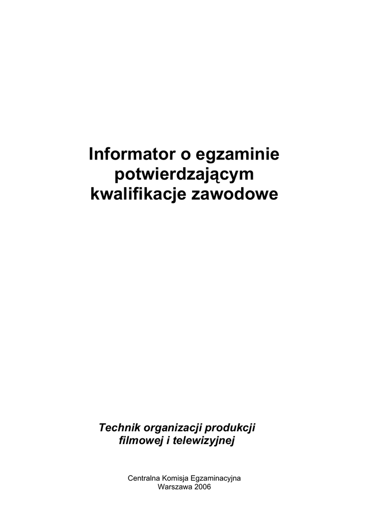 Informator o egzaminie potwierdzającym kwalifikacje zawodowe Technik organizacji produkcji filmowej i telewizyjnej Centralna Komisja Egzaminacyjna Warszawa 2006 Informator opracowała Centralna Komisja Egzaminacyjna w Warszawie we współpracy z Okręgową Komisją Egzaminacyjną w Jaworznie oraz Ministrem właściwym do spraw kultury i ochrony dziedzictwa narodowego ISBN 978-83-7400-178-6 –2– Wstęp Centralna Komisja Egzaminacyjna poleca czwartą edycję informatorów o egzaminie potwierdzającym kwalifikacje zawodowe1 skierowaną do absolwentów szkół ponadgimnazjalnych: techników i szkół policealnych. Edycja obejmuje 33 informatory, opublikowane w terminie do 31 sierpnia 2006 roku, dla zawodów, w których po raz pierwszy w roku 2007, odbędzie się egzamin dla absolwentów ww. typów szkół. Prezentowana publikacja składa się z odrębnych, dla poszczególnych zawodów, opracowań (informatorów), w których opisano wymagania egzaminacyjne. W każdym z informatorów omówiono: − strukturę egzaminu, jego organizację i przebieg, − wymagania, które należy spełnić żeby przystąpić do egzaminu i żeby zdać ten egzamin, − materiał egzaminacyjny z zakresu danego zawodu – wiadomości i umiejętności, które będą sprawdzane i oceniane na egzaminie, w etapie pisemnym i praktycznym, ilustrując go przykładami zadań egzaminacyjnych wraz z kryteriami oceniania. Informatory o egzaminie potwierdzającym kwalifikacje zawodowe kierujemy przede wszystkim do uczniów i nauczycieli szkół zawodowych, sądzimy jednak, że przedstawiony w nich syntetyczny materiał dotyczący sprawdzanych umiejętności stanowiących o kwalifikacjach zawodowych zainteresuje również innych czytelników, np.: przedstawicieli organów prowadzących szkoły i nadzorujących kształcenie, pracodawców i specjalistów ds. modelowania zawodów, kształcenia i doskonalenia zawodowego. 1 Podstawą prawną przeprowadzenia zewnętrznego egzaminu potwierdzającego kwalifikacje zawodowe, zwanego również egzaminem zawodowym, jest: − Rozporządzenie Ministra Edukacji Narodowej i Sportu z dnia 7 września 2004 r., w sprawie warunków i sposobu oceniania, klasyfikowania i promowania uczniów i słuchaczy oraz przeprowadzania sprawdzianów i egzaminów w szkołach publicznych (Dz. U. Nr 199, poz. 2046 oraz z 2005 r. Nr 218, poz 1840 i z 2006 r. Nr 69, poz. 487 i Nr 100, poz. 694), − Rozporządzenie Ministra Edukacji Narodowej i Sportu z dnia 8 maja 2004 r., w sprawie klasyfikacji zawodów szkolnictwa zawodowego (Dz. U. Nr 114, poz. 1195 oraz z 2005 r. Nr 116, poz.969), − Rozporządzenie Ministra Edukacji Narodowej i Sportu z dnia 29 marca 2005 r. zmieniające rozporządzenie w sprawie standardów wymagań będących podstawą przeprowadzania egzaminu potwierdzającego kwalifikacje zawodowe (Dz. U. Nr 66, poz. 580). Standardy, o których mowa w rozporządzeniu, stanowią oddzielny załącznik. –3– –4– SPIS TREŚCI 1. OGÓLNE INFORMACJE O EGZAMINIE POTWIERDZAJĄCYM KWALIFIKACJE ZAWODOWE................................................................ 6 1.1. Struktura egzaminu oraz formy sprawdzania wiadomości i umiejętności z zakresu zawodu .......................................................................................................................... 7 1.2. Wiadomości i umiejętności sprawdzane na egzaminie ................................................ 7 1.3. Wymagania, które trzeba spełnić, aby zdać egzamin ................................................... 9 1.4. Wymagania, które trzeba spełnić, aby przystąpić do egzaminu................................... 9 1.5. Szczegółowe informacje o egzaminie zawodowym................................................... 10 2. ETAP PISEMNY EGZAMINU ................................................................... 11 2.1. Organizacja i przebieg ................................................................................................ 11 2.2. Wymagania egzaminacyjne z przykładami zadań do części I.................................... 13 2.3. Wymagania egzaminacyjne z przykładami zadań do części II .................................. 23 2.4. Odpowiedzi do przykładowych zadań........................................................................ 27 3. ETAP PRAKTYCZNY EGZAMINU ......................................................... 28 3.1. Organizacja i przebieg ................................................................................................ 28 3.2. Wymagania egzaminacyjne i ogólne kryteria oceniania ............................................ 29 3.3. Komentarz do standardu wymagań egzaminacyjnych ............................................... 30 3.4. Przykład zadania praktycznego .................................................................................. 31 3.5. Komentarz do rozwiązania zadania wraz z kryteriami oceniania .............................. 34 4. ZAŁĄCZNIKI ............................................................................................... 37 4.1. Standard wymagań egzaminacyjnych dla zawodu ..................................................... 37 4.2. Przykład karty odpowiedzi do etapu pisemnego ........................................................ 40 4.3. Lista zawodów, dla których opublikowano informatory w 2005 r............................. 41 4.4. Lista zawodów, dla których opublikowano informatory w 2006 r............................. 42 –5– Ogólne informacje 1. OGÓLNE INFORMACJE O EGZAMINIE POTWIERDZAJĄCYM KWALIFIKACJE ZAWODOWE Egzamin potwierdzający kwalifikacje zawodowe jest formą oceny poziomu opanowania wiadomości i umiejętności z zakresu danego zawodu określonych w standardzie wymagań, ustalonym przez Ministra Edukacji Narodowej i Sportu. Egzamin ten, zwany również egzaminem zawodowym, jest egzaminem zewnętrznym. Umożliwia on uzyskanie porównywalnej i obiektywnej oceny poziomu osiągnięć zdającego poprzez zast