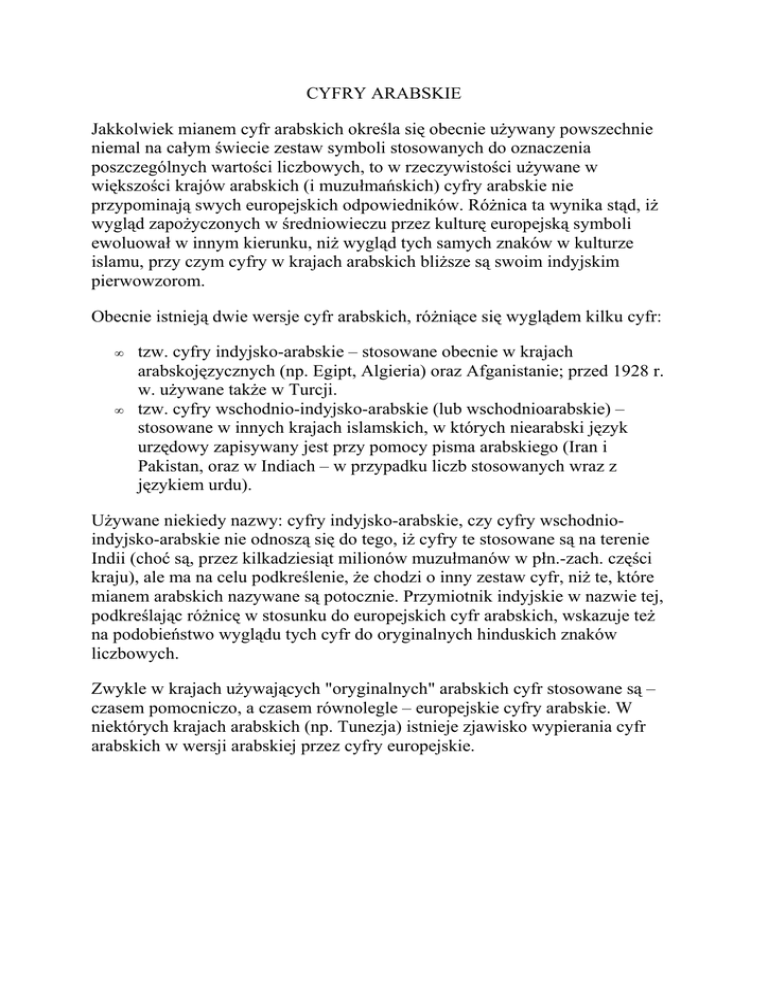 CYFRY ARABSKIE Jakkolwiek mianem cyfr arabskich określa się obecnie używany powszechnie niemal na całym świecie zestaw symboli stosowanych do oznaczenia poszczególnych wartości liczbowych, to w rzeczywistości używane w większości krajów arabskich (i muzułmańskich) cyfry arabskie nie przypominają swych europejskich odpowiedników. Różnica ta wynika stąd, iż wygląd zapożyczonych w średniowieczu przez kulturę europejską symboli ewoluował w innym kierunku, niż wygląd tych samych znaków w kulturze islamu, przy czym cyfry w krajach arabskich bliższe są swoim indyjskim pierwowzorom. Obecnie istnieją dwie wersje cyfr arabskich, różniące się wyglądem kilku cyfr: • • tzw. cyfry indyjsko-arabskie – stosowane obecnie w krajach arabskojęzycznych (np. Egipt, Algieria) oraz Afganistanie; przed 1928 r. w. używane także w Turcji. tzw. cyfry wschodnio-indyjsko-arabskie (lub wschodnioarabskie) – stosowane w innych krajach islamskich, w których niearabski język urzędowy zapisywany jest przy pomocy pisma arabskiego (Iran i Pakistan, oraz w Indiach – w przypadku liczb stosowanych wraz z językiem urdu). Używane niekiedy nazwy: cyfry indyjsko-arabskie, czy cyfry wschodnioindyjsko-arabskie nie odnoszą się do tego, iż cyfry te stosowane są na terenie Indii (choć są, przez kilkadziesiąt milionów muzułmanów w płn.-zach. części kraju), ale ma na celu podkreślenie, że chodzi o inny zestaw cyfr, niż te, które mianem arabskich nazywane są potocznie. Przymiotnik indyjskie w nazwie tej, podkreślając różnicę w stosunku do europejskich cyfr arabskich, wskazuje też na podobieństwo wyglądu tych cyfr do oryginalnych hinduskich znaków liczbowych. Zwykle w krajach używających "oryginalnych" arabskich cyfr stosowane są – czasem pomocniczo, a czasem równolegle – europejskie cyfry arabskie. W niektórych krajach arabskich (np. Tunezja) istnieje zjawisko wypierania cyfr arabskich w wersji arabskiej przez cyfry europejskie. Poniższe zestawienie prezentuje cyfry arabskie: u góry europejskie, powszechnie znane cyfry arabskie, poniżej cyfry indyjsko-arabskie, niżej zaś w wersji wschodnio-indyjsko-arabskiej. 0 1 2 3 4 5 6 7 8 9 ٠ ١ ٢ ٣ ٤ ٥ ٦ ٧ ٨ ٩ 0 1 2 3 4 5 6 7 8 9 ٠ ١ ٢ ٣ ٧ ٨ ٩