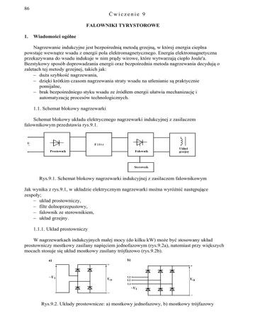 86 Ćwiczenie 9 FALOWNIKI TYRYSTOROWE 1. Wiadomości ogólne Nagrzewanie indukcyjne jest bezpośrednią metodą grzejną, w której energia cieplna powstaje wewnątrz wsadu z energii pola elektromagnetycznego. Energia elektromagnetyczna przekazywana do wsadu indukuje w nim prądy wirowe, które wytwarzają ciepło Joule'a. Bezstykowy sposób doprowadzania energii oraz bezpośrednia metoda nagrzewania decydują o zaletach tej metody grzejnej, takich jak: − duża szybkość nagrzewania, − dzięki krótkim czasom nagrzewania straty wsadu na utlenianie są praktycznie pomijalne, − brak bezpośredniego styku wsadu ze źródłem energii ułatwia mechanizację i automatyzację procesów technologicznych. 1.1. Schemat blokowy nagrzewarki Schemat blokowy układu elektrycznego nagrzewarki indukcyjnej z zasilaczem falownikowym przedstawia rys.9.1. Rys.9.1. Schemat blokowy nagrzewarki indukcyjnej z zasilaczem falownikowym Jak wynika z rys.9.1, w układzie elektrycznym nagrzewarki można wyróżnić następujące zespoły; − układ prostowniczy, − filtr dolnoprzepustowy, − falownik ze sterownikiem, − układ grzejny. 1.1.1. Układ prostowniczy W nagrzewarkach indukcyjnych małej mocy (do kilku kW) może być stosowany układ prostowniczy mostkowy zasilany napięciem jednofazowym (rys.9.2a), natomiast przy większych mocach stosuje się układ mostkowy zasilany trójfazowo (rys.9.2b). Rys.9.2. Układy prostownicze: a) mostkowy jednofazowy, b) mostkowy trójfazowy 87 Dla układu prostowniczego mostkowego jednofazowego (rys.9.2a); wartość średnia U0 i skuteczna U 0sk napięcia wyjściowego oraz wartość napięcia tętnień U T i współczynnika tętnień kT, wynoszą: U 2 U 0 = U m =0,9U 1 ; U 0 sk = m = U 1 π 2 (9.1) UT = 0,48 U0 (9.2) U T = U 02sk − U 02 ; kT = Dla układu mostkowego trójfazowego (rys.9.2b) wartości U0 i kT wynoszą; U 0 = 1,35 U1f = 1,35 U1 3 ; kT = 0,04 (9.3) gdzie: U1 - napięcie przewodowe trójfazowego zasilania prostownika. 1.1.2. Filtr dolnoprzepustowy Dla właściwej pracy falownika, napięcie tętnień na jego wejściu powinno zawierać się w określonych granicach (UT ≤ 0,1 Um). W celu zmniejszenia napięcia tętnień uzyskiwanego z prostownika, stosuje się filtr składający się z dławika włączonego szeregowo i kondensatora włączonego równolegle (rys.9.3). Wartości indukcyjności dławika i pojemności kondensatora są zależne od wartości napięcia i natężenia prądu falownika oraz od układu prostowniczego (wartość napięcia tętnień UT). Dla zapewnienia stałej reaktancji dławika rdzeń jego posiada szczelinę powietrzną. Dla zabezpieczenia zaworów prostownika przed dużym prądem udarowym w chwili włączenia układu do sieci, stosuje się rezystor R1 włączony szeregowo z dławikiem przed kondensatorem (rys.9.3) ograniczający początkowy prąd ładowania kondensatora C. Po rozruchu układu rezystor R1 jest zwierany. Rys. 9.3. Filtr elektryczny dolnoprzepustowy 1.1.3. Falownik Falownik zamienia prąd stały na przemienny o regulowanej zwykle częstotliwości. Układ elektryczny falownika szeregowego przedstawia rys.9.4. 88 Rys.9.4. Falownik szeregowy: a) z jednym kondensatorem rezonansowym, b) z dzieloną pojemnością rezonansową Rezonansowy obwód falownika (rys.9.4a) stanowi szeregowe połączenie kondensatora C, wzbudnika nagrzewarki o indukcyjności L0 i rezystancji R0 oraz dławika komutacyjnego Lk. Prąd i napięcie przemienne na obciążeniu otrzymuje się w wyniku cyklicznego przełączania tyrystorów VT1 i VT2 w obwodzie rezonansowym (rys.9.5). Dla falownika z jednym kondensatorem (rys.9.4a), po załączeniu tyrystora VT1, kondensator C ładuje się przez odbiornik i dławik komutacyjny Lk1. Prąd i płynący przez odbiornik początkowo narasta, uzyskuje wartość szczytową, następnie maleje do zera gdy napięcie na kondensatorze zrówna się z napięciem U zasilającym falownik. Gdy impuls prądowy (rys.9.5) osiągnie wartość równą zeru, wówczas tyrystor VT1 samoczynnie wyłącza się. Po załączeniu tyrystora VT2, następuje rozładowanie kondensatora C przez odbiornik, dławik Lk2 i przewodzący zawór. Czasy trwania impulsu ładowania i rozładowania są takie same, lecz w obu tych czasach prądy płynące przez wzbudnik mają kierunki przeciwne. Rys.9.5. Przebieg prądu w odbiorniku falownika szeregowego, gdzie: Ts - okres drgań własnych obwodu rezonansowego, T - okres załączania tyrystorów, tp - przerwa czasowa między dodatnią a ujemną półfalą prądu w odbiorniku Czas trwania impulsu prądowego Ts określa pulsacja drgań własnych obwodu rezonansowego, ω s = ω 20 − α 2 przy czym; ω0 = 1 LC ; α= (9.4) R0 2L (9.5) gdzie: ωs - pulsacja drgań własnych obwodu rezonansowego z uwzględnieniem tłumienia, ω0 - pulsacja drgań własnych obwodu rezonansowego, α - współczynnik tłumienia, L = L0 + Lk1 - sumaryczna indukcyjność obwodu szeregowego, C - pojemność kondensatora, L0, R0 - indukcyjność i rezystancja wzbudnika nagrzewarki. 89 Poprawna praca falownika jest możliwa przy spełnieniu warunku: t p + t w ≥ tq (9.6) T Ts − 2 2 (9.7) gdzie: tp - przerwa czasowa (rys.9.5), tp = tw - czas trwania napięcia wstecznego na wyłączonym tyrystorze, indukowanym w dławiku Lk, tq - katalogowy czas wyłączenia tyrystora. W falownikach szeregowych częstotliwość impulsowania tyrystorów fi jest zwykle mniejsza od częstotliwości fs drgań własnych obwodu rezonansowego. Dławik komutacyjny Lk przyspiesza wyłączanie tyrystorów z jednej strony, z drugiej zaś, ogranicza prąd zwarcia przy zakłóceniowym jednoczesnym załączaniu obu tyrystorów. Układ falownika z jednym kondensatorem pobiera energię ze źródła zasilania tylko w jednym półokresie pracy (gdy przewodzi tyrystor VT1). W falowniku szeregowym z dzieloną pojemnością (rys.9.4b) energia ze źródła jest pobierana w obu półokresach prądu obciążenia płynącego przez wzbudnik. Przy przewodzącym tyrystorze 