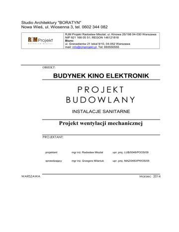 Studio Architektury "BORATYN" Nowa Wieś, ul. Wiosenna 3, tel. 0602 344 082 RJM Projekt Radosław Misztal, ul. Kinowa 25/198 04-030 Warszawa NIP 921 168 05 51; REGON 146121816 Biuro: ul. Grenadierów 21 lokal 9/10, 04-052 Warszawa mail: [email protected], Tel: 693550555 ΟΒΙΕΚΤ: BUDYNEK KINO ELEKTRONIK PROJEKT BUDOWLANY INSTALACJE SANITARNE Projekt wentylacji mechanicznej PROJEKTANT: WARSZAWA projektant mgr inż. Radosław Misztal upr. proj. LUB/0048/POOS/09 sprawdzający mgr inż. Grzegorz Milaniuk upr. proj. MAZ/0483/PWOS/05 Marzec 2014 SPIS TREŚCI I. INSTALACJE SANITARNE .................................................................................... 3 1. Instalacja wentylacji ......................................................................................................................... 3 2 I. 1. 1.1. • • • • • • • • • • • • • • 1.2. INSTALACJE SANITARNE Instalacja wentylacji Podstawa opracowania podkłady architektoniczno – budowlane, wytyczne przekazane przez Inwestora, uzgodnienia międzybranżowe, opinia SANEPIDU, BHP oraz PPOŻ, przepisów bezpieczeństwa przeciwpożarowego, Prawo Budowlane, Polskie Normy i uregulowania prawne obowiązujące w Polsce, a w szczególności: PN-78/B-03421 Parametry obliczeniowe powietrza wewnętrznego w pomieszczeniach dla stałego przebywania ludzi. PN-EN ISO 6946 Opór cieplny i współczynnik przenikania ciepła. PN-76/B-03420 Parametry obliczeniowe powietrza zewnętrznego. Zarządzenie Ministra Zdrowia i Opieki Społecznej z dnia 12 marca 1996r w sprawie dopuszczalnych stężeń i natężeń czynników szkodliwych dla zdrowia, wydzielanych przez materiały budowlane, urządzenia i elementy wyposażenia w pomieszczeniach przeznaczonych na pobyt ludzi (M.P. Nr 19, poz. 231). Rozporządzenie Ministra Pracy i Polityki Socjalnej z dnia 26 września 1997r. PN-87/B-02151/02 Dopuszczalne wartości poziomu dźwięku w pomieszczeniach. Wymagania Techniczne Cobrti Instal – zeszyt 5 „Warunki techniczne wykonania i odbioru instalacji wentylacyjnych”, Rozporządzenia Ministra Infrastruktury z dnia 12 kwietnia 2002r. w sprawie warunków technicznych, jakim powinny odpowiadać budynki i ich usytuowanie (Dz.U. Nr 75, poz. 690 wraz ze zmianą z dn. 13 lutego 2003r. Dz.U. Nr 33, poz. 270) z późniejszymi zmianami Przepisy i normy Do wykonania opracowania zastosowano normy i przepisy wg poniższego wykazu: Wykonawca będzie zobowiązany do realizacji robót zgodnie z obowiązującymi Polskimi Normami i przepisami Prawa Budowlanego, a w szczególności: 1. Rozporządzenie Ministra Infrastruktury z dnia 12 kwietnia 2002 r. w sprawie warunków technicznych, jakim powinny odpowiadać budynki i ich usytuowanie z późniejszymi zmianami. 2. Rozporządzenie Ministra Infrastruktury z dnia 7 kwietnia 2004 r zmieniające rozporządzenie w sprawie warunków technicznych, jakim powinny odpowiadać budynki i ich usytuowanie. 3. PN-83/B-03430 Wentylacja w budynkach mieszkalnych zamieszkania zbiorowego i użyteczności publicznej. Wymagania – wraz ze zmianą PN-83/B-03430/Az3;2000. 4. PN-72/B-03421 Wentylacja i klimatyzacja. Parametry obliczeniowe powietrza wewnętrznego w pomieszczeniach przeznaczonych do stałego przebywania ludzi. 5. PN-73/B-03431 Wentylacja mechaniczna w budownictwie. Wymagania. 6. PN-73/B-03432 Wentylacja naturalna w budownictwie przemysłowym. Wymagania techniczne. 7. Ustawa z dnia 26 czerwca 1974 r. - Kodeks pracy. (tekst jednolity: Dz.U. z 1998 r. Nr 21, poz. 94 z późniejszymi zmianami), 8. Ustawa z dnia 24 sierpnia 1991 r. o ochronie przeciwpożarowej. (Dz.U. z 1991 r. nr 81, poz. 351 z późniejszymi zmianami), 9. Ustawa z dnia 3 kwietnia 1993 r. o badaniach i certyfikacji. (Dz. U. z 1993 r. Nr 55, poz. 250), 10. Ustawa z dnia 3 kwietnia 1993 r. o normalizacji. (Dz.U. z 1993 r. Nr 55, poz. 251), 11. Ustawa z dnia 7 lipca 1994 r. - Prawo budowlane. (Dz.U. z 1994 r., Nr 89, poz. 414 z późniejszymi zmianami), 12. Ustawa z dnia 7 lipca 1994 r. o zagospodarowaniu przestrzennym. (Dz.U. z 1994 r. Nr 89, poz. 415 z późniejszymi zmianami). 1.3. Temat i zakres opracowania Przedmiotem opracowania jest projekt budowlany instalacji wentylacji mechanicznej oraz wentylacji pożarowej w budynku kina „Elektronik” zlokalizowanego w Warszawie przy ulicy Generała Zajączka 7. 1.4. Założenia projektowe Parametry powietrza zewnętrznego wyznaczono: • na podstawie PN-82/B-02403 dla potrzeb grzewczych – III strefa klimatyczna temp.= –20°C i 90% wilg. względnej. • według PN-76/B-03420 dla wentylacji i klimatyzacji dla II strefy klimatycznej w okresie letnim: te=+30°C; i =60,7kJ/kg; x=11,9g/kg; φ=45% oraz dla III strefy w okresie zimowym: temp. te=20°C; i =-18,4kJ/kg; x=0,8g/kg; φ=100% • dla doboru urządzeń grzewczo-chłodniczych i klimatyzacyjnych przyjęto ekstremalne parametry pracy dla okresu letniego +32°C. Ilość powietrza w Sali kinowej Sala kinowa Vos = 30 m³/h/osobę Ilość powietrza wywiewanego Minimalne ilości powietrza wywiewanego wynoszą: WC : Pralnia Pom. techniczne 1.5. Vw = 50 m3/h 2 w/h 1,5 - 3 w/h Opis instalacji Temperatura w lecie : +26+-2 [°C] Temperatura w zimie: +20+-2 [°C] Instalacja N1/W1 zapewnia nawiew i wyciąg powietrza z pomieszczenia Sali Kinowej podscenia, w ilości Vn= 12500m³/h oraz Vw= 12300m³/h. Zastosowano centralę wentylacyjną jak np. VS-100-RGHC firmy Klimor Parametry centrali AN2/AW2: Vn=12500m3/h dp=400Pa Vw=12300m3/h dp=400Pa Nagrzewnica wodna tz/tp=80/60 C moc =116,0kW Chłodnica freonowa moc =62kW moc elektryczna 13kW ciężar 534 kg nawiew 371 kg wywiew Centrala zlokalizowana zostanie w istniejącym pomieszczeniu techniczym. Centrala wyposażona będzie w odzysk glikolowy, filtry EU 4 nagrzewnicę wodna i chłodnicę freonową. Sekcja nawiewna i wyciągowa zostaną postawione osobno. Dokładna specyfikacja centrali wg załączonej karty katalogowej. Ze względu na rozprzestrzeniający się hałas instalację nawiewu wyposażono tłum