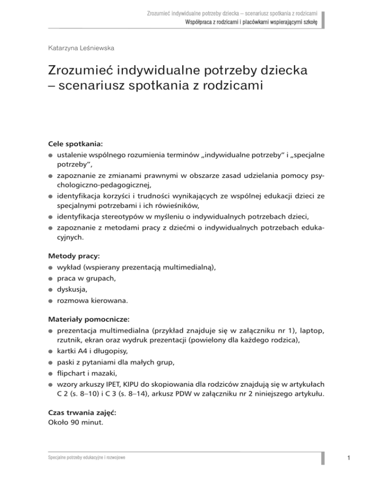 Zrozumieç indywidualne potrzeby dziecka – scenariusz spotkania z rodzicami Współpraca z rodzicami i placówkami wspierajàcymi szkoł´ Katarzyna LeÊniewska Zrozumieç indywidualne potrzeby dziecka – scenariusz spotkania z rodzicami Cele spotkania: l ustalenie wspólnego rozumienia terminów „indywidualne potrzeby” i „specjalne potrzeby”, l zapoznanie ze zmianami prawnymi w obszarze zasad udzielania pomocy psychologiczno-pedagogicznej, l identyfikacja korzyÊci i trudnoÊci wynikajàcych ze wspólnej edukacji dzieci ze specjalnymi potrzebami i ich rówieÊników, l identyfikacja stereotypów w myÊleniu o indywidualnych potrzebach dzieci, l zapoznanie z metodami pracy z dzieçmi o indywidualnych potrzebach edukacyjnych. Metody pracy: l wykład (wspierany prezentacjà multimedialnà), l praca w grupach, l dyskusja, l rozmowa kierowana. Materiały pomocnicze: l prezentacja multimedialna (przykład znajduje si´ w załàczniku nr 1), laptop, rzutnik, ekran oraz wydruk prezentacji (powielony dla ka˝dego rodzica), l kartki A4 i długopisy, l paski z pytaniami dla małych grup, l flipchart i mazaki, l wzory arkuszy IPET, KIPU do skopiowania dla rodziców znajdujà si´ w artykułach C 2 (s. 8–10) i C 3 (s. 8–14), arkusz PDW w załàczniku nr 2 niniejszego artykułu. Czas trwania zaj´ç: Około 90 minut. Specjalne potrzeby edukacyjne i rozwojowe 1 Zrozumieç indywidualne potrzeby dziecka – scenariusz spotkania z rodzicami Współpraca z rodzicami i placówkami wspierajàcymi szkoł´ Wykorzystanie scenariusza l Niniejszy scenariusz mo˝e byç wykorzystany jako temat zebrania z rodzicami lub odr´bnego spotkania warsztatowego. l Kontynuacjà tego spotkania mo˝e byç cykl rozmów o funkcjonowaniu dziecka z ró˝nego rodzaju specjalnymi potrzebami wÊród pozostałych dzieci z klasy, np. Zrozumieç dziecko z ADHD, Czy dyslektycy obni˝ajà „poziom” w klasie?, Uczeƒ z niepełnosprawnoÊcià ruchowà jako członek społecznoÊci klasowej. Te czy podobne tematy warto poruszaç, jeÊli w klasie (lub w innych klasach, z którymi uczniowie utrzymujà kontakt) uczà si´ dzieci z danà trudnoÊcià lub gdy przygotowujemy społecznoÊç klasowà na przyj´cie takiego dziecka. l Krzesła w czasie spotkania warto ustawiç w kràg lub podkow´. Wa˝ne jest, aby rodzice mogli w sposób swobodny przemieszczaç si´ w czasie proponowanych çwiczeƒ i dobrze widzieç przedstawianà prezentacj´. Przebieg zaj´ç 1. Rozpocz´cie spotkania. Nauczyciel wita rodziców i przedstawia im cele spotkania (slajd nr 2). Wa˝ne jest, aby zaznaczył, ˝e poruszany temat dotyczy ka˝dego dziecka z klasy, bo wszyscy – niezale˝nie od tego, jakie mamy potrzeby – uczymy si´ ˝yç razem. 2. Nasze potrzeby. Nauczyciel prezentuje rodzicom slajd nr 3 i omawia, czym sà potrzeby. Wa˝ne jest, aby posługiwał si´ prostym j´zykiem i przykładami. Np. odnoszàc si´ do potrzeb obiektywnych, mo˝e powiedzieç, ˝e sà to te potrzeby, na których powstawanie nie mamy wpływu, bo nikt z nas nie ma wpływu na to, ˝e potrzebuje np. jeÊç (zaspokajaç głód), spaç (wypoczywaç), czuç si´ bezpiecznie (nie mieç poczucia zagro˝enia ˝ycia czy zdrowia). W podstawowym wymiarze to nasze potrzeby wspólne. Jednak jeÊli ktoÊ ma potrzeb´ jedzenia w gronie rodziny, to mo˝emy mówiç, ˝e jest to jego wa˝na subiektywna potrzeba (bo wykracza ju˝ poza sam fakt zaspokajania głodu). Ró˝nie te˝ zaspokajamy swoje potrzeby. Sà np. dzieci, które idàc do pierwszej klasy, aby zaspokoiç swojà potrzeb´ bezpieczeƒstwa, potrzebujà zapewnienia rodzica, ˝e przyjdzie po nie o okreÊlonej porze. Sà te˝ takie, które potrzebujà przynieÊç ze sobà maskotk´, która jest „przedłu˝eniem” domu, albo takie, które, ˝eby si´ czuç bezpiecznie, przez pierwsze dni chcà nie odst´powaç nauczyciela, bo jako dorosły daje im poczucie bezpieczeƒstwa itd. Na zaspokajanie naszych potrzeb majà równie˝ wpływ nasze ograniczenia. Dla przykładu realizacja potrzeby samodzielnoÊci mo˝e byç ograniczona niepełnosprawnoÊcià fizycznà. Wówczas potrzebujemy wsparcia osób trzecich. Dziecko, które ma pora˝enie czterokoƒczynowe, b´dzie miało np. kłopot w zakresie samoobsługi – b´dzie 2 Specjalne potrzeby edukacyjne i rozwojowe Zrozumieç indywidualne potrzeby dziecka – scenariusz spotkania z rodzicami Współpraca z rodzicami i placówkami wspierajàcymi szkoł´ wymagało albo bezpoÊredniej pomocy osób trzecich przy czynnoÊciach samoobsługowych, albo wsparcia w postaci dodatkowych oddziaływaƒ (rehabilitacji, odpowiedniej stymulacji, motywowania do podejmowania wysiłku itp.). 3. Podwójny kràg. Nauczyciel zaprasza rodziców do çwiczenia (opis na slajdzie nr 4). Przesuni´cia w kr´gu trwajà tak długo, a˝ ka˝dy rodzic z kr´gu zewn´trznego porozmawia z ka˝dym rodzicem z kr´gu wewn´trznego. Nast´pnie nauczyciel prosi, aby rodzice usiedli i pyta ich o refleksje: l Czy potrzeba Paƒstwa dziecka i te potrzeby, o których mówili rodzice innych dzieci, były takie same? l Na czym polegały podobieƒstwa i ró˝nice? Warto, aby podsumowujàc, nauczyciel zaznaczył, ˝e obecne zmiany w prawie oÊwiatowym majà na celu wyjÊcie naprzeciw indywidualnym potrzebom uczniów. 4. Co mówi prawo o potrzebach dzieci?* Przedstawienie fragmentu prezentacji dotyczàcego zaspokajania indywidualnych potrzeb (slajdy 5–10). Komentarze do slajdów mogà byç nast´pujàce: Slajd nr 5 – Nauczyciele w wi´kszym stopniu skoncentrujà si´ na indywidualnoÊci ka˝dego dziecka. Naszym zadaniem, jako osób uczàcych, jest uwa˝ne obserwowanie tego, co dziecko potrafi, z czym ma jeszcze trudnoÊci i takie przekazywanie wiedzy i kształtowanie umiej´tnoÊci, ˝eby mogło sobie lepiej radziç w szkole, czyli indywidualizacja pracy. Nie oznacza to, ˝e teraz nauczyciele podzielà lekcj´ na kilkuminutowe „odcinki” i b´dà po kolei pracowaç z ka˝dym dzieckiem. Taki sposób pracy byłby zupełnie nieefe