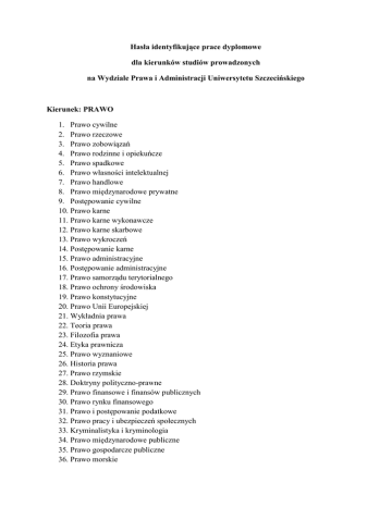 Hasła identyfikujące prace dyplomowe dla kierunków studiów prowadzonych na Wydziale Prawa i Administracji Uniwersytetu Szczecińskiego Kierunek: PRAWO 1. Prawo cywilne 2. Prawo rzeczowe 3. Prawo zobowiązań 4. Prawo rodzinne i opiekuńcze 5. Prawo spadkowe 6. Prawo własności intelektualnej 7. Prawo handlowe 8. Prawo międzynarodowe prywatne 9. Postępowanie cywilne 10. Prawo karne 11. Prawo karne wykonawcze 12. Prawo karne skarbowe 13. Prawo wykroczeń 14. Postępowanie karne 15. Prawo administracyjne 16. Postępowanie administracyjne 17. Prawo samorządu terytorialnego 18. Prawo ochrony środowiska 19. Prawo konstytucyjne 20. Prawo Unii Europejskiej 21. Wykładnia prawa 22. Teoria prawa 23. Filozofia prawa 24. Etyka prawnicza 25. Prawo wyznaniowe 26. Historia prawa 27. Prawo rzymskie 28. Doktryny polityczno-prawne 29. Prawo finansowe i finansów publicznych 30. Prawo rynku finansowego 31. Prawo i postępowanie podatkowe 32. Prawo pracy i ubezpieczeń społecznych 33. Kryminalistyka i kryminologia 34. Prawo międzynarodowe publiczne 35. Prawo gospodarcze publiczne 36. Prawo morskie Kierunek: ADMINISTRACJA 1. Prawo administracyjne 2. Postępowanie administracyjne 3. Prawo samorządu terytorialnego 4. Prawo ochrony środowiska 5. Prawo własności intelektualnej 6. Prawo cywilne 7. Postępowanie cywilne 8. Prawo karne 9. Postępowanie karne 10. Prawo konstytucyjne 11. Prawo Unii Europejskiej 12. Prawo finansowe i finansów publicznych 13. Prawo i postępowanie podatkowe 14. Prawo rynku finansowego 15. Prawo pracy i ubezpieczeń społecznych 16. Prawo gospodarcze publiczne 17. Prawo międzynarodowe publiczne 18. Kryminalistyka i kryminologia 19. Prawo karne skarbowe 20. Prawo wykroczeń 21. Historia administracji 22. Doktryny polityczno-prawne 23. Prawo morskie 24. Teoria prawa 25. Ekonomia Kierunek: EKONOMICZNO-PRAWNY 1. Prawo cywilne 2. Prawo administracyjne 3. Postępowanie administracyjne 4. Prawo samorządu terytorialnego 5. Prawo ochrony środowiska 6. Prawo finansowe i finansów publicznych 7. Prawo i postępowanie podatkowe 8. Prawo rynku finansowego 9. Prawo gospodarcze publiczne 10. Prawo własności intelektualnej 11. Historia prawa 12. Prawo karne skarbowe 13. Prawo Unii Europejskiej 14. Prawo handlowe