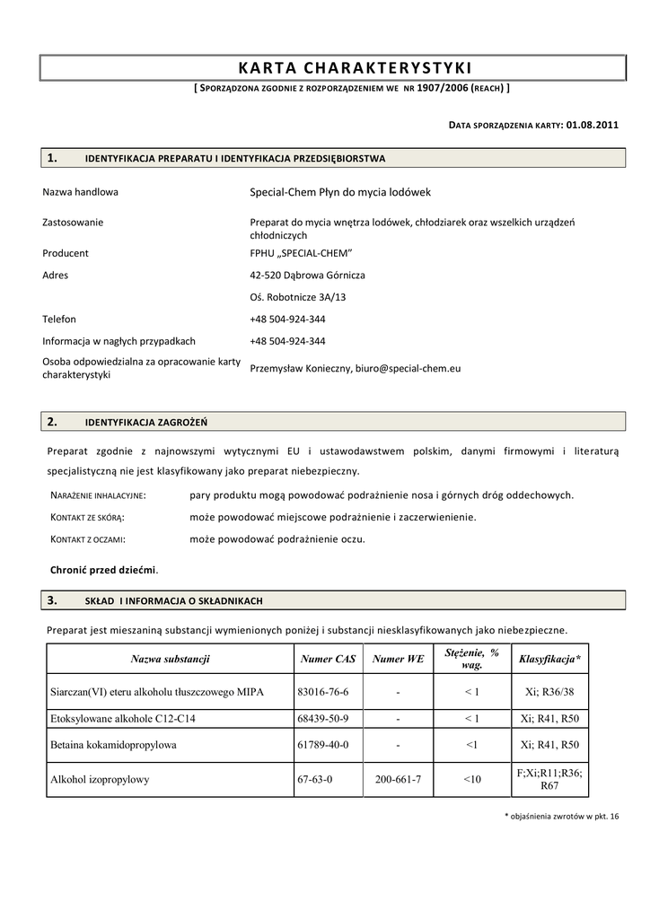 KARTA CHARAKTERYSTYKI [ SPORZĄDZONA ZGODNIE Z ROZPORZĄDZENIEM WE NR 1907/2006 (REACH ) ] DATA SPORZĄDZENIA KARTY: 01.08.2011 1. IDENTYFIKACJA PREPARATU I IDENTYFIKACJA PRZEDSIĘBIORSTWA Nazwa handlowa Special-Chem Płyn do mycia lodówek Zastosowanie Preparat do mycia wnętrza lodówek, chłodziarek oraz wszelkich urządzeń chłodniczych Producent FPHU „SPECIAL-CHEM” Adres 42-520 Dąbrowa Górnicza Oś. Robotnicze 3A/13 Telefon +48 504-924-344 Informacja w nagłych przypadkach +48 504-924-344 Osoba odpowiedzialna za opracowanie karty Przemysław Konieczny, [email protected] charakterystyki 2. IDENTYFIKACJA ZAGROŻEŃ Preparat zgodnie z najnowszymi wytycznymi EU i ustawodawstwem polskim, danymi firmowymi i literaturą specjalistyczną nie jest klasyfikowany jako preparat niebezpieczny. NARAŻENIE INHALACYJNE: pary produktu mogą powodować podrażnienie nosa i górnych dróg oddechowych. KONTAKT ZE SKÓRĄ: może powodować miejscowe podrażnienie i zaczerwienienie. KONTAKT Z OCZAMI: może powodować podrażnienie oczu. Chronić przed dziećmi. 3. SKŁAD I INFORMACJA O SKŁADNIKACH Preparat jest mieszaniną substancji wymienionych poniżej i substancji niesklasyfikowanych jako niebezpieczne. Nazwa substancji Numer CAS Numer WE Stężenie, % wag. Klasyfikacja* Siarczan(VI) eteru alkoholu tłuszczowego MIPA 83016-76-6 - <1 Xi; R36/38 Etoksylowane alkohole C12-C14 68439-50-9 - <1 Xi; R41, R50 Betaina kokamidopropylowa 61789-40-0 - <1 Xi; R41, R50 Alkohol izopropylowy 67-63-0 200-661-7 <10 F;Xi;R11;R36; R67 * objaśnienia zwrotów w pkt. 16 4. PIERWSZA POMOC DROGI ODDECHOWE: Wyprowadzić na świeże powietrze; w przypadku trudności z oddychaniem skontaktować się z lekarzem. KONTAKT Z OCZAMI : Przemywać wielokrotnie dużą ilością czystej wody trzymając szeroko otwarte powieki przez 10 min. Skontaktować się z lekarzem. KONTAKT ZE SKÓRĄ: Zdjąć zanieczyszczoną odzież. Skórę przemyć wodą. SPOŻYCIE: Nie wymuszać wymiotów. Przepłukać usta wodą. Pić wodę. Skontaktować się z lekarzem. Osobie nieprzytomnej nie podawać niczego do ust. 5. POSTĘPOWANIE W PRZYPADKU POŻARU Preparat zawiera niewielką ilość składnika wysoce łatwopalnego w roztworze wodnym. Nie został sklasyfikowany jako preparat łatwopalny. ŚRODKI GAŚNICZE ZALECANE: Piana, agregaty CO2 , proszek lub rozpryskujący się strumień wody ŚRODKI GAŚNICZE NIEODPOWIEDNIE: brak NIEBEZPIECZNE PRODUKTY ROZKŁADU W wyniku rozkładu w czasie spalanie mogą powstawać toksyczne gazy ŚRODKI OCHRONY OSOBISTEJ : Odzież ognioodporna i aparat izolujący do oddychania. 6. POSTĘPOWANIE W PRZYPADKU NIEZAMIERZONEGO UWOLNIENIA DO ŚRODOWISKA INDYWIDUALNE ŚRODKI OSTROŻNOŚCI: Należy przestrzegać ogólnych zasad bezpieczeństwa. Zadbać o dobrą wentylacje. ŚRODKI OSTROŻNOŚCI W ODNIESIENIU DO ŚRODOWISKA: Nie należy dopuścić do przedostania się produktu do wód gruntowych lub powierzchniowych. W przypadku uwolnienia większych ilości powiadomić odpowiednie służby ratownicze. METODY OCZYSZCZANIA: Zapewnić odpowiednią wentylację. Wylany materiał usunąć mechanicznie, resztę zebrać do pojemnika na odpady za pomocą substancji adsorbującej ciecz (np. mączka drzewna, ziemia okrzemkowa, piasek, trociny). Dalsze informacje na temat usuwania odpadów patrz rozdział. 13. Zanieczyszczone powierzchnie spłukać wodą. 7. POSTĘPOWANIE Z PREPARATEM I JEGO MAGAZYNOWANIE Podczas stosowania i przechowywania produktu przestrzegać ogólnie obowiązujące przepisy BHP POSTĘPOWANIE Z PREPARATEM: Postępować tak jak w przypadku preparatów chemicznych; zapewnić dobrą wentylację pomieszczeń. Nie rozpylać nad otwartym płomieniem lub żarzącym materiałem. Nie palić w czasie aplikacji. Nie mieszać zawartości pojemników z innymi chemikaliami. MAGAZYNOWANIE: Przechowywać z dala od źródeł zapłonu w pomieszczeniach wentylowanych. Nie palić tytoniu. Nie przechowywać razem z mocnymi kwasami, zasadami i środkami utleniającymi lub redukującymi, gumą, plastikami, aluminium i metalami lekkimi. Magazynować w suchym i dobrze wentylowanym miejscu w oryginalnych pojemnikach w pozycji pionowej. Po otwarciu opakowanie należy zamykać. Chronić przed bezpośrednim światłem słonecznym i wysoką temperaturą. Nie przechowywać z żywnością, napojami i paszą. Chronić przed dziećmi. 8. KONTROLA NARAŻENIA I ŚRODKI OCHRONY INDYWIDUALNEJ Preparat zawiera składnik szkodliwy dla zdrowia w środowisku pracy (wg regulacji o najwyższych dopuszczalnych stężeniach w zależności od czasu narażenia w ciągu zmiany roboczej zawartych w Dz. U. Nr 217 poz. 1833 z 29.11.2002 oraz zmianami Dz. U. Nr 212 poz. 1769 z 10.10.2005 r.) IZOPROPANOL NDS – 900 MG/M3 NDSCH – 1200 MG/M3 ZALECENIA OGÓLNE: W miejscu pracy należy zapewnić punkt do mycia i płukania oczu. Sprzęt ochronny osobistej powinien znajdować się w miejscu pracy. OCHRONA DRÓG ODDECHOWYCH: Preparat nie stwarza zagrożenia podczas normalnego użytkowania preparatu i przestrzeganiu zaleceń bezpieczeństwa. OCHRONA OCZU: Stosować okulary ochronne. OCHRONA RĄK: Rękawice ochronne OCHRONA SKÓRY: Odzież robocza, buty robocze. HIGIENA PRACY: Stanowiska do przemywania oczu i prysznice w miejscach zagrożenia. ROZWIĄZANIA TECHNICZNE: Podczas pracy w kontakcie z produktem stosować odpowiednie środki mające na celu zminimalizowanie kontaktu z produktem i poprawę stanu BHP. 9. WŁAŚCIWOŚCI FIZYCZNE I CHEMICZNE INFORMACJE OGÓLNE Postać Kolor Zapach WAŻNE INFORMACJE DOTYCZĄCE ZDROWIA, BEZPIECZEŃSTWA I ŚRODOWISKA pH Temperatura wrzenia Temperatura zapłonu Palność Właściwości wybuchowe Właściwości utleniające Prężność par Gęstość względna Rozpuszczalność w wodzie Współczynnik podziału: n-oktanol/woda Gęstość par Szybkość parowania INNE INFORMACJE rozpuszczalność w tłuszczach przewodnictwo elektryczne temperatura topnienia temperatura samozapłonu 10. mieszanina cieczy mleczno-biały charakterystyczny dla 