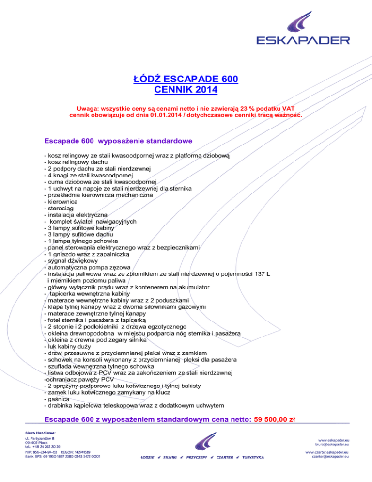 ŁÓDŹ ESCAPADE 600 CENNIK 2014 Uwaga: wszystkie ceny są cenami netto i nie zawierają 23 % podatku VAT cennik obowiązuje od dnia 01.01.2014 / dotychczasowe cenniki tracą ważność. Escapade 600 wyposażenie standardowe - kosz relingowy ze stali kwasoodpornej wraz z platformą dziobową - kosz relingowy dachu - 2 podpory dachu ze stali nierdzewnej - 4 knagi ze stali kwasoodpornej - cuma dziobowa ze stali kwasoodpornej - 1 uchwyt na napoje ze stali nierdzewnej dla sternika - przekładnia kierownicza mechaniczna - kierownica - sterociąg - instalacja elektryczna - komplet świateł nawigacyjnych - 3 lampy sufitowe kabiny - 3 lampy sufitowe dachu - 1 lampa tylnego schowka - panel sterowania elektrycznego wraz z bezpiecznikami - 1 gniazdo wraz z zapalniczką - sygnał dźwiękowy - automatyczna pompa zęzowa - instalacja paliwowa wraz ze zbiornikiem ze stali nierdzewnej o pojemności 137 L i miernikiem poziomu paliwa - główny wyłącznik prądu wraz z kontenerem na akumulator - tapicerka wewnętrzna kabiny - materace wewnętrzne kabiny wraz z 2 poduszkami - klapa tylnej kanapy wraz z dwoma siłownikami gazowymi - materace zewnętrzne tylnej kanapy - fotel sternika i pasażera z tapicerką - 2 stopnie i 2 podłokietniki z drzewa egzotycznego - okleina drewnopodobna w miejscu podparcia nóg sternika i pasażera - okleina z drewna pod zegary silnika - luk kabiny duży - drzwi przesuwne z przyciemnianej pleksi wraz z zamkiem - schowek na konsoli wykonany z przyciemnianej pleksi dla pasażera - szuflada wewnętrzna tylnego schowka - listwa odbojowa z PCV wraz za zakończeniem ze stali nierdzewnej -ochraniacz pawęży PCV - 2 sprężyny podporowe luku kotwicznego i tylnej bakisty - zamek luku kotwicznego zamykany na klucz - gaśnica - drabinka kąpielowa teleskopowa wraz z dodatkowym uchwytem Escapade 600 z wyposażeniem standardowym cena netto: 59 500,00 zł Opcje wyposażenia dodatkowego : - pełne cabrio - hydrauliczny układ sterujący - instalacja wodna z umywalką - instalacja wodna z umywalką i prysznicem - 2 okna boczne kabiny - radio z czterema głośnikami - lodówka - kuchenka - reflektor - uchwyt na wędki mocowany na relingu dachowym 1 szt. - stolik w kolorze pokładu wraz z aluminiową nogą teleskopową - dodatkowa kanapa tylna rozkładana wraz z materacami - dwa materace na dach - akumulator 100Ah (Marine) - kotwica ze stali nierdzewnej wraz z łańcuchem i elektryczną wyciągarką wyciągarka elektryczna łańcuch ze stali nierdzewnej 20mb krętlik kotwicy kotwica ze stali nierdzewnej 7,5kg winda kotwiczna ze stali nierdzewnej - kotwica ocynkowana wraz z łańcuchem i elektryczną wyciągarką wyciągarka elektryczna łańcuch ocynkowany 20mb krętlik kotwicy kotwica ze stali ocynkowanej 7,5kg. - dziobowe włączniki nożne kotwicy - system ogrzewania postojowego - system ładowania portowego - 2 platformy rufowe wraz z relingami - dziobowa drabinka wyjściowa - Echosonda Garmin z montażem - TV HD + DVD + montaż - antena TV Glomex z montażem - dodatkowe gniazdo zapalniczki - akumulator dodatkowy wraz z pojemnikiem - toalety WC Jabsco Zapraszamy do współpracy Eskapader Team Polska +48 797 600 590 +48 515 061 422 [email protected] www.eskapader.eu 4 150,00 zł 3 550,00 zł 1 620,00 zł 2 100,00 zł 1 940,00 zł 1 575,00 zł 3 255,00 zł 1 260,00 zł 1 730,00 zł 160,00 zł 820,00 zł 1 197,00 zł 820,00 zł 870,00 zł 6 520,00zł 4 470,00 zł 850,00 zł 7 970,00 zł 1 840,00 zł 2 800,00 zł 840,00 zł 3 300,00 zł 3 850,00 zł 1 100,00 zł 100,00 zł 600,00 zł 2 900,00 zł