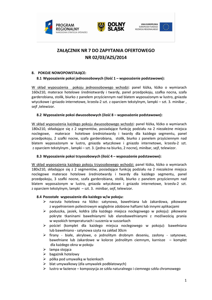ZAŁĄCZNIK NR 7 DO ZAPYTANIA OFERTOWEGO NR 02/03/AZS/2014 8. POKOJE NOWOPOWSTAJĄCE: 8.1 Wyposażenie pokoi jednoosobowych (ilość 1 – wyposażenie podstawowe): W skład wyposażenia pokoju jednoosobowego wchodzi: panel łóżka, łóżko o wymiarach 160x210, materace hotelowe średniotwardy i twardy, panel przedpokoju, szafka nocna, szafa garderobiana, stolik, biurko z panelem przyściennym nad blatem wyposażonym w lustro, gniazda wtyczkowe i gniazdo internetowe, krzesła-2 szt. z oparciem tekstylnym, lampki – szt. 3. minibar , sejf ,telewizor. 8.2 Wyposażenie pokoi dwuosobowych (ilość 8 – wyposażenie podstawowe): W skład wyposażenia każdego pokoju dwuosobowego wchodzi: panel łóżka, łóżko o wymiarach 180x210, składające się z 2 segmentów, posiadające funkcję podziału na 2 niezależne miejsca noclegowe, materace hotelowe średniotwardy i twardy dla każdego segmentu, panel przedpokoju, 2 szafki nocne, szafa garderobiana, stolik, biurko z panelem przyściennym nad blatem wyposażonym w lustro, gniazda wtyczkowe i gniazdo internetowe, krzesła-2 szt. z oparciem tekstylnym , lampki – szt. 3. (jedna na biurko, 2 nocne), minibar, sejf, telewizor. 8.3 Wyposażenie pokoi trzyosobowych (ilość 4 – wyposażenie podstawowe): W skład wyposażenia każdego pokoju trzyosobowego wchodzi: panel łóżka, łóżko o wymiarach 180x210, składające się z 2 segmentów, posiadające funkcję podziału na 2 niezależne miejsca noclegowe materace hotelowe średniotwardy i twardy dla każdego segmentu, panel przedpokoju, 3 szafki nocne, szafa garderobiana, stolik, biurko z panelem przyściennym nad blatem wyposażonym w lustro, gniazda wtyczkowe i gniazdo internetowe, krzesła-2 szt. z oparciem tekstylnym, lampki – szt. 3. minibar, sejf, telewizor. 8.4 Pozostałe wyposażenie dla każdego w/w pokoju: narzuta hotelowa na łóżko: satynowa, bawełniana lub żakardowa, pikowane z wypełnieniem poliestrowym względnie zdobione haftami lub innymi aplikacjami poduszka, jasiek, kołdra (dla każdego miejsca noclegowego w pokoju): pikowane pokryte tkaninami bawełnianymi lub elanobawełnianymi z możliwością prania w wysokich temperaturach i suszenia w suszarkach pościel (komplet dla każdego miejsca noclegowego w pokoju): bawełniana lub bawełniano - satynowa szyta na zakład 30cm firany - białe, akrylowe, o jednolitym drobnym deseniu, zasłony - satynowe, bawełniane lub żakardowe w kolorze jednolitym ciemnym, karnisze – komplet dla każdego okna w pokoju lampa stojąca bagażnik hotelowy pólka pod umywalką w łazienkach blat umywalkowy (dla umywalek podblatowych) lustro w łazience – kompozycja ze szkła naturalnego i ciemnego szkła chromowego 1 deska toaletowa – twarda wolnoopadająca suszarka do włosów. Kolor biały lub chrom z koncentratorem nadmuchu co najmniej dwoma prędkościami pracy, wbudowanym czujnikiem temperatury zapobiegającym przegrzaniu suszarki oraz przyciskiem bezpieczeństwa umożliwiającym pozostawienie włączonej suszarki bez nadzoru: moc 1200-1400W pojemnik na mydło - kolor biały lub jasny kremowy kubek (2 na pokój) - kolor biały lub jasny kremowy hotelowy ręcznik kąpielowy, ręcznik do rąk – komplet dla każdej osoby w pokoju pojemnik na torebki higieniczne wieszak na ręczniki kosz na odpadki półka w kabinie prysznicowej wieszak na drzwi wieszak na papier szczotka toaletowa mocowana do ściany koło ustępu Dodatkowo dla każdego z w/w pokoju trzyosobowego: sofa rozkładana, tapicerowana, z podłokietnikami na brzegach w wersji złożonej 2 – osobowa, rozłożona do spania dla 1 osoby, wymiary sofy rozłożonej: 120x200 (bez oparcia i bez podłokietników) 9. POKOJE ISTNIEJĄCE MODERNIZOWANE: Wyposażenie pokoi jednoosobowych: W skład wyposażenia każdego pokoju jednoosobowego wchodzi: panel łóżka, łóżko o wymiarach 160x210, materace hotelowe średniotwardy i twardy, panel przedpokoju, szafka nocna, szafa garderobiana, stolik, biurko z panelem przyściennym nad blatem wyposażonym w lustro, gniazda wtyczkowe i gniazdo internetowe, lampki – szt. 3. minibar, sejf ,telewizor. Wyposażenie pokoi dwuosobowych: W skład wyposażenia każdego pokoju dwuosobowego wchodzi: panel łóżka, łóżko o wymiarach 180x210 składające się z 2 segmentów, posiadające funkcję podziału na 2 niezależne miejsca noclegowe, materace hotelowe średniotwardy i twardy dla każdego segmentu, panel przedpokoju, 2 szafki nocne, szafa garderobiana, stolik, biurko z panelem przyściennym nad blatem wyposażonym w lustro, gniazda wtyczkowe i gniazdo internetowe, lampki – szt. 3. minibar, sejf, telewizor. Wyposażenie pokoi trzyosobowych: W skład wyposażenia każdego pokoju trzyosobowego wchodzi: panel łóżka, łóżko o wymiarach 180x210 składające się z 2 segmentów, posiadające funkcję podziału na 2 niezależne miejsca noclegowe, materace hotelowe średniotwardy i twardy dla każdego segmentu, panel przedpokoju, 3 szafki nocne, szafa garderobiana, stolik, biurko z panelem przyściennym nad blatem wyposażonym w lustro, gniazda wtyczkowe i gniazdo internetowe , lampki – szt. 3. minibar, sejf, telewizor, sofa rozkładana, tapicerowana, z podłokietnikami na brzegach w wersji złożonej 2 – osobowa, rozłożona do spania dla 1 osoby, wymiary sofy rozłożonej: 120x200 (bez oparcia i bez podłokietników). 2 Pozostałe wyposażenie dla każdego w/w pokoju: narzuta hotelowa na łóżko: satynowa, bawełniana lub żakardowa, pikowane z wypełnieniem poliestrowym względnie zdobione haftami lub innymi aplikacjami poduszka, jasiek, kołdra (dla każdego miejsca noclegowego w pokoju): pikowane pokryte tkaninami bawełnianymi lub elanobawełnianymi z możliwością prania w wysokich temperaturach i suszenia w suszarkach pościel (komplet dla każdego miejsca noclegowego w pokoju): bawełniana lub bawełniano - satynowa szyta na zakład 30cm firany - białe, akrylowe, o jednolitym drobnym deseniu, zasłony - satynowe, bawełnia