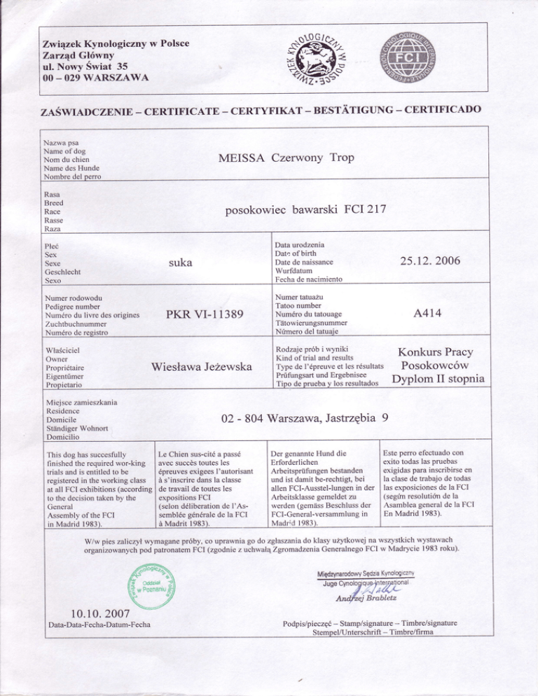 Zw iązek Kyno lo gic zny w Po ls ce Zarząd Główny ul. Nowy Swiat 35 OO- 029 WARSZAWA ZAŚWIADCZENIE - CERTIFICATE - CERTYFIKAT - BESTIiTIGUNG _ CERTIFICADO Nazwa psa Name of dog MEISSA Nomduchien CzerwonY TroP Name des Hunde Nombrę del perro Rasa Bręed posokowiecbawarskiFCI 217 Race Rasse Raza Data urodzenia Datę of bińh Płeć Sex Sexe Geschlecht Sexo 25.12. f006 Datedenaissance Wurfdatum SUka Fecha de nacimiento Numer rodowodu Pedigree number Num?rodulivredesorigines PKR VI- 1 1389 Zuchtbuchnummer Numćro dę reeistro Numertatuażu Tatoonumber Numćrodu tatouage Tżitowierungsnummer Nrimerodęl tatuaie A4I4 Rodzajepróbi wyniki Właściciel Owner Proprićtaire Wiesława Jezewska Eigentrimer Prooietario Miejsce zamięszkania Residence Konkurs Kind of trial and ręsults Pracy etlęsrćsultats Posokowców Typedel'ópreuve DyplomII stopnia łil}l5;T.ilo"T*..,xx'j'.,:u", 02 - 804 Warszawa,Jastrzębia 9 Domicile StżindigerWohnort Domicilio This dog has succesfully finishedthe requiredwor-king trials and is entitledto be registeredin the working class at all FCI eńibitions (according to the decision taken by the General Assembly of the FCI in Madrid 1983). Lę Chien sus-citć a passó avęc succćs toutes les ćpreuves exigees l' autorisanl d s,inscrire dans la classę de travail de toutes lęs expositionsFCI (selon dćliberationde l'Assemblćęgónórale de la FCI d Madrit 1983). Der genannteHund die Erforderlichen Arbeitsprtfu ngen bestanden und ist damit be-rechtigt.bei allen FCI-Ausstel-lungenin der Arbeitsklasse gemeldet zu Beschluss der werden (gemżiss lung in FCI -General-versamm Madrrtl 1983). Este perro efectuado con ęxito todas las pruebas exigidaspara inscribirseen la clase de trabajo de todas las exposicionesdę la FCI (segtn resolutiÓn de la Asamblea generalde la FCI En Madrid 1983). W/w pies za|iczył,wymagane próby, co uprawnia go do zgłaszaniado klasy uiy.tkowej na wszystkich wystawach Generalnego FCl w Madrycie l983 roku). organizowanych pod patronatem FCl (zgodnie z'uchw,ał.ąZgromadzenia ciffi"*.' ,r \] .Ą/ ;i rl u.\ 'l'i-kl:; : 1 ,. r ,. , , , , *j't]]l ,j J j " i/! ,.ri1 10.10.2007 Data-Data-Fecha-Datum-Fecha Kynologicznr SędzIa Miedzynarodowy Juge Cynologiqu Ąter 9alonat J '.,/'id+Ł- An,dłzejBrabletz : Timbre/signature - Stamp/signature Podpis/pieczęó * Timb r ęlftrma Stemoelfunterschrift