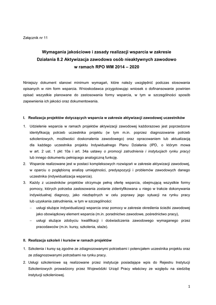 Załącznik nr 11 Wymagania jakościowe i zasady realizacji wsparcia w zakresie Działania 8.2 Aktywizacja zawodowa osób nieaktywnych zawodowo w ramach RPO WM 2014 – 2020 Niniejszy dokument stanowi minimum wymagań, które należy uwzględnić podczas stosowania opisanych w nim form wsparcia. Wnioskodawca przygotowując wniosek o dofinansowanie powinien opisać wszystkie planowane do zastosowania formy wsparcia, w tym w szczególności sposób zapewnienia ich jakości oraz dokumentowania. I. Realizacja projektów dotyczących wsparcia w zakresie aktywizacji zawodowej uczestników 1. Udzielenie wsparcia w ramach projektów aktywizacji zawodowej każdorazowo jest poprzedzone identyfikacją potrzeb uczestnika projektu (w tym m.in. poprzez diagnozowanie potrzeb szkoleniowych, możliwości doskonalenia zawodowego) oraz opracowaniem lub aktualizacją dla każdego uczestnika projektu Indywidualnego Planu Działania (IPD, o którym mowa w art. 2 ust. 1 pkt 10a i art. 34a ustawy o promocji zatrudnienia i instytucjach rynku pracy) lub innego dokumentu pełniącego analogiczną funkcję. 2. Wsparcie realizowane jest w postaci kompleksowych rozwiązań w zakresie aktywizacji zawodowej, w oparciu o pogłębioną analizę umiejętności, predyspozycji i problemów zawodowych danego uczestnika (indywidualizacja wsparcia). 3. Każdy z uczestników projektów otrzymuje pełną ofertę wsparcia, obejmującą wszystkie formy pomocy, których potrzeba zastosowania zostanie zidentyfikowana u niego w trakcie dokonywania indywidualnej diagnozy, jako niezbędnych w celu poprawy jego sytuacji na rynku pracy lub uzyskania zatrudnienia, w tym w szczególności: usługi służące indywidualizacji wsparcia oraz pomocy w zakresie określenia ścieżki zawodowej jako obowiązkowy element wsparcia (m.in. poradnictwo zawodowe, pośrednictwo pracy), usługi służące zdobyciu kwalifikacji i doświadczenia zawodowego wymaganego przez pracodawców (m.in. kursy, szkolenia, staże). II. Realizacja szkoleń i kursów w ramach projektów 1. Szkolenia i kursy są zgodne ze zdiagnozowanymi potrzebami i potencjałem uczestnika projektu oraz ze zdiagnozowanymi potrzebami na rynku pracy. 2. Usługi szkoleniowe są realizowane przez instytucje posiadające wpis do Rejestru Instytucji Szkoleniowych prowadzony przez Wojewódzki Urząd Pracy właściwy ze względu na siedzibę instytucji szkoleniowej. 1 3. Szkolenia otwarte, tzn. takie na które prowadzony jest otwarty nabór uczestników, o zdefiniowanym z góry programie lub ramach merytorycznych, grupie docelowej, celach szkoleniowych i cenie, mogą być realizowane jedynie w uzasadnionych przypadkach, w odniesieniu do osób, u których zidentyfikowano konieczność nabycia w taki sposób niezbędnych umiejętności czy kwalifikacji zawodowych. 4. Szkolenie zamknięte to szkolenie dedykowane jednej ściśle określonej grupie docelowej czy uczestnikom danego projektu, tzw. „szyte na miarę”. 5. Usługi szkoleniowe w ramach projektów muszą spełniać poniższe minimalne wymagania jakościowe: 1) Szkolenie dopasowane do poziomu uczestników – obowiązkowe jest zbadanie wyjściowego poziomu kompetencji rozwijanych w trakcie szkolenia i dostosowanie do nich programu szkoleniowego oraz wykorzystywanych metod. 2) Program szkoleniowy jest opisany w języku efektów uczenia się. 3) Materiały szkoleniowe muszą zawierać podsumowanie treści szkolenia i odwołania do źródeł wiedzy, na której zostało ono oparte, z poszanowaniem praw autorskich. 4) Podczas szkolenia wykorzystywane muszą być różnorodne, angażujące uczestników metody kształcenia oraz środki i materiały dydaktyczne, dostosowane do specyfiki i sytuacji osób uczących się. Metody te są adekwatne do deklarowanych rezultatów, treści szkolenia oraz specyfiki grupy. 5) Dokumentacja szkoleniowa musi obejmować: a) raporty podsumowujące ocenę efektów uczenia się, b) program szkolenia (z uwzględnieniem tematów zajęć, harmonogram wraz z wymiarem czasowym, metody szkoleniowe), c) materiały szkoleniowe, d) listy obecności. 6) Trenerzy prowadzący szkolenie muszą posiadać łącznie: a) wykształcenie wyższe/zawodowe lub inne certyfikaty/zaświadczenia umożliwiające przeprowadzenie danego szkolenia, b) doświadczenie umożliwiające przeprowadzenie danego szkolenia, przy czym minimalne doświadczenie zawodowe w danej dziedzinie nie jest krótsze niż 2 lata, c) kompetencje społeczne i metodyczne związane z kształceniem osób dorosłych. 7) Szkolenie odbywa się w warunkach zapewniających komfort uczenia się, sale szkoleniowe spełniają warunki BHP oraz odpowiadają potrzebom grupy docelowej, zwłaszcza w przypadku udziału osób niepełnosprawnych. 6. Efektem każdego szkolenia/kursu realizowanego w ramach projektu jest nabycie kwalifikacji zawodowych lub nabycie kompetencji 7. Uzyskanie kwalifikacji należy rozumieć jako formalny wynik oceny i walidacji, uzyskany w momencie potwierdzenia przez właściwy organ, że dana osoba osiągnęła efekty uczenia się spełniające określone standardy. Tym samym uczestnika można uwzględnić we wskaźniku dotyczącym liczby 2 osób, które uzyskały kwalifikacje po opuszczeniu programu, jeżeli zda formalny egzamin potwierdzający zdobyte kwalifikacje. Uczestnicy, którzy po ukończeniu kursu otrzymają jedynie zaświadczenie o ukończeniu szkolenia nie będą mogły być ujmowane w powyższym wskaźniku. Egzamin musi zostać przeprowadzony przez uprawnioną do tego instytucję. Tym samym zdanie egzaminu wewnętrznego, przeprowadzonego przez organizatora i otrzymanie zaświadczenia o ukończeniu kursu, nie jest tożsame z uzyskaniem kwalifikacji. Minimum 12% uczestników projektu skierowanych na szkolenia powinno uzyskać certyfikat potwierdzający uzyskanie kwalifikacji. 8. W przypadku szkoleń/kursów prowadzących do nabycia kompetencji, Wnioskodawca jest zobligowany do zawarcia we wniosku o dofinansowanie projektu opisu kompetencji zawieraj