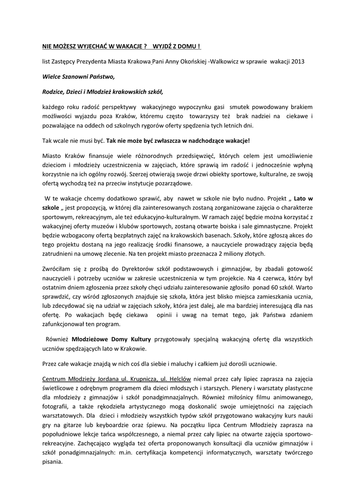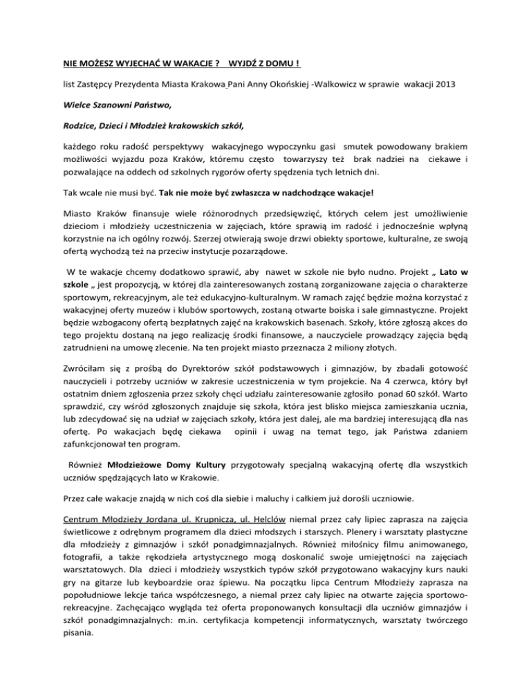 NIE MOŻESZ WYJECHAĆ W WAKACJE ? WYJDŹ Z DOMU ! list Zastępcy Prezydenta Miasta Krakowa Pani Anny Okońskiej -Walkowicz w sprawie wakacji 2013 Wielce Szanowni Państwo, Rodzice, Dzieci i Młodzież krakowskich szkół, każdego roku radość perspektywy wakacyjnego wypoczynku gasi smutek powodowany brakiem możliwości wyjazdu poza Kraków, któremu często towarzyszy też brak nadziei na ciekawe i pozwalające na oddech od szkolnych rygorów oferty spędzenia tych letnich dni. Tak wcale nie musi być. Tak nie może być zwłaszcza w nadchodzące wakacje! Miasto Kraków finansuje wiele różnorodnych przedsięwzięć, których celem jest umożliwienie dzieciom i młodzieży uczestniczenia w zajęciach, które sprawią im radość i jednocześnie wpłyną korzystnie na ich ogólny rozwój. Szerzej otwierają swoje drzwi obiekty sportowe, kulturalne, ze swoją ofertą wychodzą też na przeciw instytucje pozarządowe. W te wakacje chcemy dodatkowo sprawić, aby nawet w szkole nie było nudno. Projekt „ Lato w szkole „ jest propozycją, w której dla zainteresowanych zostaną zorganizowane zajęcia o charakterze sportowym, rekreacyjnym, ale też edukacyjno-kulturalnym. W ramach zajęć będzie można korzystać z wakacyjnej oferty muzeów i klubów sportowych, zostaną otwarte boiska i sale gimnastyczne. Projekt będzie wzbogacony ofertą bezpłatnych zajęć na krakowskich basenach. Szkoły, które zgłoszą akces do tego projektu dostaną na jego realizację środki finansowe, a nauczyciele prowadzący zajęcia będą zatrudnieni na umowę zlecenie. Na ten projekt miasto przeznacza 2 miliony złotych. Zwróciłam się z prośbą do Dyrektorów szkół podstawowych i gimnazjów, by zbadali gotowość nauczycieli i potrzeby uczniów w zakresie uczestniczenia w tym projekcie. Na 4 czerwca, który był ostatnim dniem zgłoszenia przez szkoły chęci udziału zainteresowanie zgłosiło ponad 60 szkół. Warto sprawdzić, czy wśród zgłoszonych znajduje się szkoła, która jest blisko miejsca zamieszkania ucznia, lub zdecydować się na udział w zajęciach szkoły, która jest dalej, ale ma bardziej interesującą dla nas ofertę. Po wakacjach będę ciekawa opinii i uwag na temat tego, jak Państwa zdaniem zafunkcjonował ten program. Również Młodzieżowe Domy Kultury przygotowały specjalną wakacyjną ofertę dla wszystkich uczniów spędzających lato w Krakowie. Przez całe wakacje znajdą w nich coś dla siebie i maluchy i całkiem już dorośli uczniowie. Centrum Młodzieży Jordana ul. Krupnicza, ul. Helclów niemal przez cały lipiec zaprasza na zajęcia świetlicowe z odrębnym programem dla dzieci młodszych i starszych. Plenery i warsztaty plastyczne dla młodzieży z gimnazjów i szkół ponadgimnazjalnych. Również miłośnicy filmu animowanego, fotografii, a także rękodzieła artystycznego mogą doskonalić swoje umiejętności na zajęciach warsztatowych. Dla dzieci i młodzieży wszystkich typów szkół przygotowano wakacyjny kurs nauki gry na gitarze lub keyboardzie oraz śpiewu. Na początku lipca Centrum Młodzieży zaprasza na popołudniowe lekcje tańca współczesnego, a niemal przez cały lipiec na otwarte zajęcia sportoworekreacyjne. Zachęcająco wygląda też oferta proponowanych konsultacji dla uczniów gimnazjów i szkół ponadgimnazjalnych: m.in. certyfikacja kompetencji informatycznych, warsztaty twórczego pisania. Staromiejskie Centrum Kultury Młodzieży ul. Wietora, ul. Dietla, ul. Szeroka proponuje w tym roku ofertę wakacyjną o intrygującym haśle „ Bezgrzeczne lato”. W pierwszych dniach lipca organizatorzy zapraszają przede wszystkim na warsztaty interdyscyplinarne mające na celu połączenie formuły wypoczynku z aktywnością twórczą, która otwiera w młodym człowieku nowe przestrzenie wrażliwości i odczuwania, stwarza możliwość wszechstronnego rozwoju. Cały lipiec upłynie w klimacie muzyki – warsztatów gitarowych, instrumentów klawiszowych i jazzu. W sierpniu rozpoczną się zajęcia w ramach Letniej Akademii Sztuk Walki. W ofercie znajdziecie też Państwo sporo ciekawych zajęć tematycznych, plenerowych, a także propozycje wycieczek. Młodzieżowy Dom Kultury przy al. 29 Listopada przez cały lipiec czeka na „łowców przygód”, którzy w ramach tego projektu będą oczywiście poszukiwać skarbu, łowić dźwięki i w kręgu tajemnic przygotują ekspedycję w nieznane. W sierpniu organizatorzy zapraszają na obóz artystyczno-rekreacyjny w Sianożętach. MDK „Dom Harcerza” ul. Lotnicza obiecuje swoją ofertą objąć ok.3000 dzieci i młodzieży. Przez cały lipiec, a także drugą połowę sierpnia będzie tu można ciekawie spędzić czas m.in. na warsztatach rękodzielniczych, plastycznych, gitarowych. Organizatorzy zadbali też o zajęcia sportowe, spotkania z interesującymi ludźmi i wyjścia do ciekawych miejsc. Młodzieżowy Dom Kultury przy ul. Grunwaldzkiej będzie pracował dla dzieci i młodzieży nieprzerwanie cały okres wakacji. Upłyną one tutaj pod znakiem plastyki, muzyki i tańca. Propozycje obejmują też cieszące się dużym zainteresowaniem „Spotkania z fantastyką”, wyjścia i wyjazdy w malownicze plenery. Nie zabraknie też różnorodnych zajęć o charakterze świetlicowym. Młodzieżowy Dom Kultury „Dom Harcerza” ul. Reymonta, Olszanica postawił w tym roku na organizację wyjazdów poza Kraków. W ofercie znajdą Państwo kolonie, obozy jeździecko-rowerowe, rehabilitacyjne, plastyczno-rekreacyjne, modelarsko- rekreacyjne. Można też miło spędzić czas na półkolonii, którą organizatorzy poprowadzą przez cały lipiec. Młodzieżowy Dom Kultury ul. Beskidzka, ul. Na Wrzosach Kieruje swoją ofertę głównie do dzieci w wieku 8 – 12 lat. Oprócz szerokiego wachlarza zajęć stacjonarnych i wycieczek po Krakowie, przewidziano też warsztaty letnie w Mrzeżynie, warsztaty taneczne w Murzasichlu, a także obóz sportowy w Gardiejach. Młodzieżowy Dom Kultury