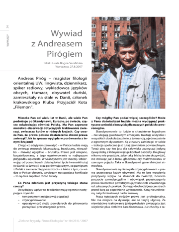 34 WYWIADY Wywiad z Andreasem Pirógiem tekst: Jurata Bogna Serafińska Warszawa, 27.8.2007 Andreas Piróg – magister filologii orientalnej UW, lingwista, dziennikarz, spiker radiowy, wykładowca języków obcych, tłumacz, obywatel duński, zamieszkały na stałe w Danii, członek krakowskiego Klubu Przyjaciół Kota „Filemon”. Mieszka Pan od wielu lat w Danii, ale wiele Pan podróżuje po Skandynawii, Europie, po świecie, często odwiedzając również Polskę. Ma Pan zapewne mnóstwo obserwacji dotyczących traktowania zwierząt, zwłaszcza kotów w różnych krajach. Czy uważa Pan, że prawo polskie dostatecznie chroni prawa zwierząt? Jak ta sprawa wygląda w porównaniu z innymi krajami? Z tego co zdążyłem zauważyć – w Polsce ludzie mają do zwierząt stosunek lekceważący, bezduszny, nierzadko – mówiąc oględnie – brutalny. Prawo jest omijane, bagatelizowane, a jego egzekwowanie w najlepszym przypadku opieszałe. W Skandynawii jest inaczej. Obserwując od ponad trzech dziesięcioleci życie i warunki tutaj (w Danii i w Szwecji) oraz porównując z tym, co pamiętam z Polski z zamierzchłej przeszłości – a także z tym, co widzę w Polsce obecnie, wyciągam następującą konkluzję – to są dwa zupełnie różne światy. Co Pana zdaniem jest przyczyną takiego stanu rzeczy? Decydujący wpływ na te różnice mają wg mnie następujące czynniki: – temperament miejscowej populacji – zdyscyplinowanie – operatywność służb powołanych do pilnowania porządku i przestrzegania prawa. „Zielone Brygady. Pismo Ekologów” nr 10 (231) / 2007 Czy mógłby Pan podać więcej szczegółów? Może z Pana doświadczeń będzie można wyciągnąć praktyczne wnioski z korzyścią dla naszych polskich czworonogów. Skandynawowie to ludzie o charakterze łagodnym – nie ulegają gwałtownym emocjom, traktują wszystko i wszystkich dookoła życzliwie, z tolerancją, a jednocześnie z ogromnym dystansem. Są z natury zamknięci w sobie – izolacja społeczna jest tutaj zjawiskiem powszechnym. Toteż pies czy kot jest dla człowieka zazwyczaj jedyną żywą istotą, z którą nawiązuje kontakt osobisty. Do głowy nikomu nie przyjdzie, żeby taką bliską istotę skrzywdzić, nie mówiąc już o biciu, głodzeniu czy maltretowaniu w szerszym pojęciu. Taka w Skandynawii generalnie jest atmosfera. Skandynawowie są niezwykle zdyscyplinowani – prawa przestrzega każdy obywatel. Ma to bez wątpienia pozytywny wpływ na stosunek do zwierząt, bowiem poczucie samodyscypliny i obowiązek przestrzegania prawa skutecznie powstrzymują właściciela czworonoga od zakazanych praktyk. Do tego dochodzi jeszcze strach przed karą za popełnione wykroczenie. Karą nieuniknioną, natychmiastową i nader surową. Praca tutejszych stróżów prawa jest profesjonalna. Nie ma miejsca na dyskusje, ani na taryfę ulgową. Za niewłaściwe traktowanie jakiegokolwiek zwierzęcia jest więzienie plus dotkliwa kara finansowa. Już choćby z ra- Wiem, że podróżuje Pan często ze swoim czworonożnym przyjacielem. Jakie trudności trzeba pokonać przekraczając granice lub lecąc samolotem z psem lub kotem? Czy to prawda, że w samolocie nie można mieć prze sobie swojego czworonoga? Przepisy stanowią, iż przewożony w kabinie samolotu czworonóg nie może przekroczyć 8 kg wagi (wraz z transporterem) – w przeciwnym wypadku zostanie umieszczony w sekcji cargo (bagażowej). Zwierzę powinno być również małe. Torba/pojemnik dopuszczony do przewozu zwierząt w kabinie pasażerskiej samolotu winien mieć wymiary 20x30x45 cm. Jak zapewnia Pan swojemu pupilowi właściwe wyżywienie w czasie trwania podróży? Przecież chyba nie wszędzie można dostać potrawy, do których jest przyzwyczajony. Mój kot na przykład dopominał się codziennie o rybę, ale jadał tylko jeden jej gatunek i to specjalnie przyrządzony. Miałam z tym zawsze dużo kłopotu. W podróży nie daję kotce żadnego pokarmu – nawet przez cały dzień. Nie zaszkodzi, jeśli się trochę przegłodzi. Mam jednak zawsze pojemnik z wodą, by móc dać jej się napić. Jakie bariery napotykają czworonogi w Danii w życiu codziennym? W Danii istnieje kategoryczny zakaz wprowadzania zwierząt do sklepów – przy wejściach widnieją wszędzie duże ikony z wizerunkiem psa i wyraźnym tekstem: Jeg maa ikke ind. W praktyce jednak wchodzę z moją kotką do sklepów, do magazynów gdzie robię zakupy i jak do- Jaki zakres wolności wyznaczył Pan dla swojego kota? Daję mej kotce całkowitą i absolutną wolność w domu, toleruję jej dzikie ekscesy. Z drugiej strony nigdy nie wypuszczam jej samej na zewnątrz. Na spacer chodzi tylko ze mną – w szeleczkach i na smyczy. Gdy już się zmęczy chodzeniem – wskakuje mi na ramię i tam potrafi siedzieć godzinami, spoglądając z wysoka na otaczający świat. Wiem, że nie podaje Pan kotce leków hormonalnych. U kotki okres rui jest przeważnie bardzo uciążliwy i męczący zarówno dla niej samej, jak i dla otoczenia. Jaką metodę uważa Pan za najlepszą do zastosowania, aby kotka nie cierpiała w czasie rui? W tej sprawie przyszły mi z pomocą własne obserwacje. Tak się kilka razy złożyło, że gdy moja kotka miała ruję, musiałem udać się w podróż, nie bacząc na jej niefortunną kondycję. Otóż zauważyłem, że jak tylko znalazła się w pociągu, w samolocie, na statku, itd., objawy rui natychmiast ustępowały! Co więcej – nie powracały po zakończeniu podróży. Wywnioskowałem, że to silne zewnętrzne bodźce musiały odwracać jej uwagę na tyle, że zapominała o rui. Problem pozostał w przypadku, gdy żadna podróż w okresie rui nie była planowana. Ale i tutaj obserwacje kolejny raz mi pomogły. Zauważyłem, że w okresie rui kotka jest szalenie podekscytowana, niespokojna, skłonna do nieustannego przemieszczania się. Zakładam jej przeto szeleczki i na smyczy wyprowadzam na bardzo daleki spacer. Kotka biegnie jak nakręc