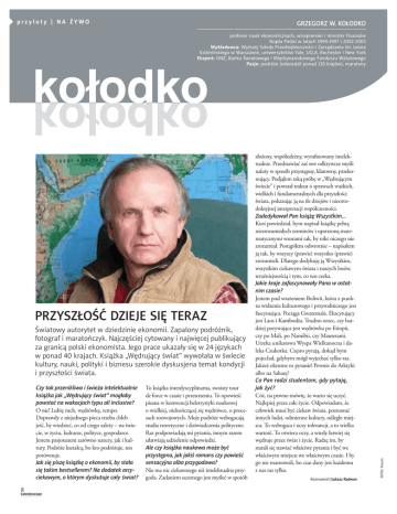 s hr zoyplpoitnyg | | NDAE ŻLYUW XO E p GRZEGORZ W. KOŁODKO profesor nauk ekonomicznych, wicepremier i minister finansów Rządu Polski w latach 1994-1997 i 2002-2003 Wykładowca: Wyższej Szkoły Przedsiębiorczości i Zarządzania im. Leona Koźmińskiego w Warszawie, uniwersytetów Yale, UCLA, Rochester i New York Ekspert: ONZ, Banku Światowego i Międzynarodowego Funduszu Walutowego Pasje: podróże (odwiedził ponad 130 krajów), maratony PRZYSZŁOŚĆ DZIEJE SIĘ TERAZ Światowy autorytet w dziedzinie ekonomii. Zapalony podróżnik, fotograf i maratończyk. Najczęściej cytowany i najwięcej publikujący za granicą polski ekonomista. Jego prace ukazały się w 24 językach w ponad 40 krajach. Książka „Wędrujący świat” wywołała w świecie kultury, nauki, polityki i biznesu szerokie dyskusjena temat kondycji i przyszłości świata. Czy tak przenikliwa i świeża intelektualnie książka jak „Wędrujący świat” mogłaby powstać na wakacjach typu all inclusive? O nie! Lubię ruch, wędrówkę, tempo. Doprawdy z niejednego pieca trzeba chleb jeść, by wiedzieć, co od czego zależy – na świecie, w życiu, kulturze, polityce, gospodarce. Jestem pasjonatem zarówno natury, jak i kultury. Podróże kształcą, bo kto podróżuje, ten porównuje. Jak się piszę książkę o ekonomii, by stała się takim bestsellerem? Na dodatek arcyciekawym, o którym dyskutuje cały świat? 8kaleidoscope To książka interdyscyplinarna, swoisty tour de force w czasie i przestrzeniu. To opowieść pisana w konwencji beletrystyki naukowej o wielkiej, niekończącej się wędrówce, o procesach rozwojowych. Moje podróże wzbogacają studia teoretyczne i doświadczenia polityczne. Raz podpowiadają mi pytania, innym razem ułatwiają udzielenie odpowiedzi. Ale czy książka naukowa może być przystępna, jak jakiś romans czy powieść sensacyjna albo przygodowa? Nie ma nic ciekawszego niż intelektualna przygoda. Zadaniem uczonego jest myśleć w sposób złożony, współzależny, wyrafinowany intelektualnie. Przedstawiać zaś swe odkrywcze myśli należy w sposób przystępny, klarowny, przekonujący. Podjąłem taką próbę w „Wędrującym świecie” i powstał traktat o sprawach ważkich, wielkich i fundamentalnych dla przyszłości świata, pokazując ją na tle dziejów i nieortodoksyjnej interpretacji współczesności. Zadedykował Pan książę Wszystkim… Ktoś powiedział, bym napisał książkę pełną niezrozumiałych terminów i upstrzoną matematycznymi wzorami tak, by nikt niczego nie zrozumiał. Postąpiłem odwrotnie – napisałem ją tak, by wszyscy (prawie) wszystko (prawie) zrozumieli. Dlatego dedykuję ją Wszystkim, wszystkim ciekawym świata i naszych losów, teraźniejszością i tym, co nas czeka. Jakie kraje zafascynowały Pana w ostatnim czasie? Jestem pod wrażeniem Boliwii, która z punktu widzenia kulturowego i przyrodniczego jest fascynująca. Pociąga Gwatemala. Ekscytujący jest Laos i Kambodża. Trudno orzec, czy bardziej porywająca jest wędrówka po Etiopii, czy po Mali, po Namibii, czy Mauretanii. Urzeka unikatowa Wyspa Wielkanocna i daleka Czukotka. Często pytają, dokąd bym pojechał, gdybym mógł wyjechać tylko raz. Jakżeż okrutne to pytanie! Pewnie do Arktyki albo na Saharę? Co Pan radzi studentom, gdy pytają, jak żyć? Cóż, na pewno mówię, że warto się uczyć. Najlepiej przez całe życie. Odpowiadam, że człowiek musi być ciekaw świata, poznawać innych ludzi, odmienne kultury, odległe miejsca. To wzbogaca i uczy tolerancji, a to wielka wartość. To otwiera oczy, a wtedy łatwiej się wędruje przez świat i życie. Radzę im, by starali się stawiać właściwe pytania i być we właściwym miejscu we właściwym czasie. I by go nie marnowali, bo czas dany jest każdemu z nas raz tylko. Rozmawiał | Łukasz Radwan FOTO: Forum ko!odko