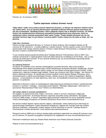 Poznań, dn. 24 czerwca, 2008 r. Tyskie zaprasza- zobacz browar nocą! Tylko latem i tylko nocą moŜna poznać tajemnice browaru, w którym od czterech wieków warzy się Tyskie piwo. A to za sprawą plenerowych spektakli podczas których goście przeniosą się sto lat w przeszłość. Spotkają postaci, które odegrały waŜną rolę w dziejach browaru. Ze świata historii do współczesności przeniosą wszystkich przewidywania Ŝony piwowara, która ze słodowych ziaren odczyta przyszłość jaka czeka Tyskie. Trzeba będzie pilnować się, by nie zdradzić duchom tego co juŜ wiemy o uznaniu jakim Tyskie cieszy się nie tylko w kraju, ale i za granicą. Całe lato z duchami Oferta nocnego zwiedzania Browaru w Tychach to letnia atrakcja, która dostępna będzie od 28 czerwca do 30 sierpnia br., w kaŜdy piątkowy i sobotni wieczór. Oprócz spaceru przez nocny Browar goście będą mieli okazję zwiedzić jedyne w Polsce Tyskie Muzeum Piwowarstwa, a następnie napić się piwa w pubie w podziemiach Muzeum. To juŜ czwarta edycja popularnej letniej akcji Tyskiego Muzeum Piwowarstwa, która w 2007 roku zdobyła wyróŜnienie w ogólnopolskim konkursie Złote Spinacze na Najlepszy Event Roku. Jak co roku szykują się atrakcyjne nowości. W tym sezonie dowiemy się, czy Ŝona piwowara naprawdę potrafi przewidywać przyszłość... Co zobaczą Goście? W trakcie 19 spektakli w tym sezonie zwiedzających przywita Klucznik, który przez kolejne kilkadziesiąt minut będzie prowadził gości wśród zabytkowych budynków Browaru KsiąŜęcego. Goście z latarniami ruszą na teren Browaru gdzie czekać na nich będzie szereg tajemniczych postaci, ściśle związanych z dawnymi dziejami tego zakładu. Pojawi się na pewno sam Stary KsiąŜę - Jan Henryk XI, dawny właściciel browaru. W zabytkowej warzelni spotkać moŜna będzie Starego Piwowara, który wprowadzi gości w tajniki piwowarskiego kunsztu, dzieląc się przy tym wieloma anegdotami. Będzie jeszcze... to pozostawmy na razie tajemnicą, dość rzec, Ŝe kawalkada browarowych duchów wyjdzie gościom na spotkanie. Natomiast w Muzeum czeka na zwiedzających stała ekspozycja poświęcona historii i współczesności browaru w Tychach i Tyskiego - ulubionego piwa Polaków, "Naszego najlepszego", które jest m.in. sponsorem Reprezentacji Polski oraz Trenera Leo Beenhakkera. Jak wziąć udział w nocnym zwiedzaniu? Ze względu na ograniczoną ilość miejsc i terminów, udział w nocnym zwiedzaniu objęty jest specjalnym konkursem, do którego Muzeum zaprasza wszystkie osoby pełnoletnie. Szczegóły konkursu SMS-owego, w którym nagrodami będą podwójne wejściówki na nocne spektakle poznać moŜna odwiedzając począwszy od niedzieli 22czerwca stronę www.nocnezwiedzanie.kp.pl. Na stronie znaleźć będzie moŜna równieŜ zdjęcia, ciekawostki i wiele praktycznych informacji na temat Nocnego Zwiedzania Tyskich Browarów KsiąŜęcych. Będzie tam równieŜ dział dla mediów. Aktualne statystyki i ciekawostki znaleźć będzie moŜna natomiast na stronie Tyskiego Muzeum Piwowarstwa w dziale aktualności: www.tyskiemuzeumpiwowarstwa.pl Pierwszy konkurs SMS-owy w którym stawką będą podwójne wejściówki na sobotę 28 czerwca ruszy juŜ 22 czerwca. W sprawie szczegółów zachęcamy do zaglądania na www.nocnezwiedzanie.kp.pl ! Patronami medialnymi akcji są: Polskie Radio Katowice oraz Polska Dziennik Zachodni. Więcej na www.nocnezwiedzanie.kp.pl *** Tyskie. Nasze najlepsze. Od 2005 roku Tyskie wspiera zawodników Reprezentacji Polski (umowa jest kontynuacją, zapoczątkowanej w 1998 roku, współpracy z Reprezentacją Polski w piłce noŜnej), jej trenera Leo Beenhakkera oraz kibiców, którzy z wiarą i oddaniem towarzyszom zmaganiom naszej "jedenastki". W związku z Mistrzostwami Świata w Niemczech marka Tyskie zorganizowała akcję "Wywieśmy flagi. PomóŜmy Naszym". Kibice solidaryzowali się z Reprezentacją Polski podczas Mudialu wywieszając spontanicznie w oknach i na balkonach swoich domów przygotowane specjalnie dla nich flagi kibica. Akcję kibicowania naszej reprezentacji wspierały czołowe polskie media, jak równieŜ znane osobistości świata kultury i sztuki. W czasie mundialu rozdano milion flag dla kibiców - akcja zakończyła się pełnym sukcesem. Tyskie to równieŜ czołowa marka Kompanii Piwowarskiej - jest niekwestionowanym liderem wśród wszystkich polskich marek piwa pod względem zarówno wielkości sprzedaŜy, jak i wygenerowanych wpływów. Tyskie wielokrotnie zostało uhonorowane najbardziej prestiŜowymi nagrodami branŜy piwnej na całym świecie - w 2005 roku m.in. Złotym Medalem oraz Grand Prix podczas Międzynarodowego Konkursu BranŜy Piwowarskiej (The Brewing Industry International Awards), przeprowadzanego od roku 1886. Tyskie powtórzyło swój sukces z roku 2002 jako zdobywca tych obu wyjątkowych nagród. Tyskie Muzeum Piwowarstwa Otwarte w listopadzie 2004 roku. Od tamtego czasu odwiedziło je ponad 130 000 zwiedzających, w tym kilkanaście tysięcy gości z zagranicy. Oprócz stałej oferty zwiedzania Browaru oraz Muzeum w ofercie są inne imprezy. Pośród nich największym hitem od trzech sezonów są letnie spektakle Nocnego Zwiedzania Browaru, które zdobyły wyróŜnienie w kategorii "Najlepszy Event 2007" w konkursie projektów public relations "Złote Spinacze" Funkcjonowanie Muzeum zostało dostrzeŜone i nagrodzone w kilku innych konkursach. Projektanci: Tomasz Konior i Krzysztof Barysz odebrali w czerwcu 2005 roku. z rąk Wojewody Śląskiego nagrodę za najlepsze wnętrze w ramach konkursu na Architekturę Roku, jak równieŜ wyróŜnienie w konkursie Marszałka Województwa na najlepszą przestrzeń publiczną regionu. We wrześniu 2005 roku Muzeum wywalczyło nagrodę i certyfikat Najlepszego Produktu Turystycznego przyznane przez Polską Organizację Turystyczną, oraz honorową nagrodę Kompas 2005 za produkt turystyczny od Polskiej Izby Turystyki Kompania