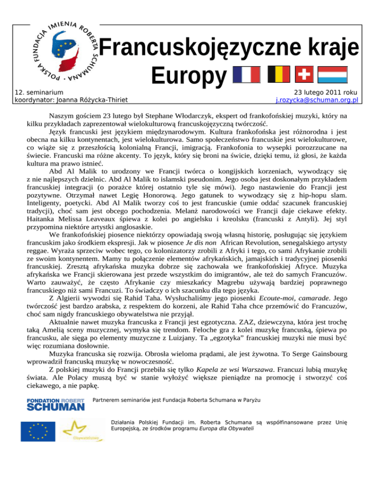 Francuskojęzyczne kraje Europy 12. seminarium koordynator: Joanna Różycka-Thiriet 23 lutego 2011 roku [email protected] Naszym gościem 23 lutego był Stephane Włodarczyk, ekspert od frankofońskiej muzyki, który na kilku przykładach zaprezentował wielokulturową francuskojęzyczną twórczość. Język francuski jest językiem międzynarodowym. Kultura frankofońska jest różnorodna i jest obecna na kilku kontynentach, jest wielokulturowa. Samo społeczeństwo francuskie jest wielokulturowe, co wiąże się z przeszłością kolonialną Francji, imigracją. Frankofonia to wysepki porozrzucane na świecie. Francuski ma różne akcenty. To język, który się broni na świcie, dzięki temu, iż głosi, że każda kultura ma prawo istnieć. Abd Al Malik to urodzony we Francji twórca o kongijskich korzeniach, wywodzący się z nie najlepszych dzielnic. Abd Al Malik to islamski pseudonim. Jego osoba jest doskonałym przykładem francuskiej integracji (o porażce której ostatnio tyle się mówi). Jego nastawienie do Francji jest pozytywne. Otrzymał nawet Legię Honorową. Jego gatunek to wywodzący się z hip-hopu slam. Inteligenty, poetycki. Abd Al Malik tworzy coś to jest francuskie (umie oddać szacunek francuskiej tradycji), choć sam jest obcego pochodzenia. Melanż narodowości we Francji daje ciekawe efekty. Haitanka Melissa Leaveaux śpiewa z kolei po angielsku i kreolsku (francuski z Antyli). Jej styl przypomina niektóre artystki anglosaskie. We frankofońskiej piosence niektórzy opowiadają swoją własną historię, posługując się językiem francuskim jako środkiem ekspresji. Jak w piosence Je dis non African Revolution, senegalskiego artysty reggae. Wyraża sprzeciw wobec tego, co kolonizatorzy zrobili z Afryki i tego, co sami Afrykanie zrobili ze swoim kontynentem. Mamy tu połączenie elementów afrykańskich, jamajskich i tradycyjnej piosenki francuskiej. Zresztą afrykańska muzyka dobrze się zachowała we frankofońskiej Afryce. Muzyka afrykańska we Francji skierowana jest przede wszystkim do imigrantów, ale też do samych Francuzów. Warto zauważyć, że często Afrykanie czy mieszkańcy Magrebu używają bardziej poprawnego francuskiego niż sami Francuzi. To świadczy o ich szacunku dla tego języka. Z Algierii wywodzi się Rahid Taha. Wysłuchaliśmy jego piosenki Ecoute-moi, camarade. Jego twórczość jest bardzo arabska, z respektem do korzeni, ale Rahid Taha chce przemówić do Francuzów, choć sam nigdy francuskiego obywatelstwa nie przyjął. Aktualnie nawet muzyka francuska z Francji jest egzotyczna. ZAZ, dziewczyna, która jest trochę taką Amelią sceny muzycznej, wymyka się trendom. Feloche gra z kolei muzykę francuską, śpiewa po francusku, ale sięga po elementy muzyczne z Luizjany. Ta „egzotyka” francuskiej muzyki nie musi być więc rozumiana dosłownie. Muzyka francuska się rozwija. Obrosła wieloma prądami, ale jest żywotna. To Serge Gainsbourg wprowadził francuską muzykę w nowoczesność. Z polskiej muzyki do Francji przebiła się tylko Kapela ze wsi Warszawa. Francuzi lubią muzykę świata. Ale Polacy muszą być w stanie wyłożyć większe pieniądze na promocję i stworzyć coś ciekawego, a nie papkę. Partnerem seminariów jest Fundacja Roberta Schumana w Paryżu Działania Polskiej Fundacji im. Roberta Schumana są współfinansowane przez Unię Europejską, ze środków programu Europa dla Obywateli