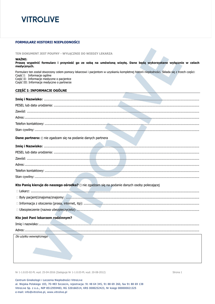 FORMULARZ HISTORII NIEPŁODNOŚCI TEN DOKUMENT JEST POUFNY - WYŁĄCZNIE DO WIEDZY LEKARZA WAŻNE: Proszę wypełnić formularz i przynieść go ze sobą na umówioną wizytę. Dane będą wykorzystane wyłącznie w celach medycznych. Formularz ten został stworzony celem pomocy lekarzowi i pacjentom w uzyskaniu kompletnej historii niepłodności. Składa się z trzech części: Część I: Informacje ogólne Część II: Informacje medyczne o pacjentce Część III: Informacje medyczne o partnerze CZĘŚĆ I: INFORMACJE OGÓLNE Imię i Nazwisko: ............................................................................................................................................................ PESEL lub data urodzenia: .................................................................................................................................................. Zawód: ............................................................................................................................................................................. Adres: ............................................................................................................................................................................... Telefon kontaktowy: ........................................................................................................................................................... Stan cywilny: ..................................................................................................................................................................... Dane partnera: nie zgadzam się na podanie danych partnera Imię i Nazwisko: ............................................................................................................................................................ PESEL lub data urodzenia: .................................................................................................................................................. Zawód: ............................................................................................................................................................................. Adres: ............................................................................................................................................................................... Telefon kontaktowy: ........................................................................................................................................................... Stan cywilny: ..................................................................................................................................................................... Kto Panią kieruje do naszego ośrodka? nie zgadzam się na podanie danych osoby polecającej Lekarz: ......................................................................................................................................................................... Były pacjent/znajoma/znajomy: ...................................................................................................................................... Informacja z otoczenia (prasa, internet, itp): .................................................................................................................... Ubezpieczenie (nazwa ubezpieczyciela): ........................................................................................................................... Kto jest Pani lekarzem rodzinnym? Imię i nazwisko: ................................................................................................................................................................. Adres: ............................................................................................................................................................................... Do użytku wewnętrznego Nr 1-1.0.03-02-PL wyd. 25-04-2016 (Zastępuje Nr 1-1.0.03-PL wyd. 20-08-2012) Centrum Ginekologii i Leczenia Niepłodności VitroLiv e al. Wojska Polskiego 103, 70 -483 Szczecin, rejestracja: 91 48 64 345, 91 88 69 260, fax 91 88 69 138 VitroLive Sp. z o.o., NIP 8512959483, RG 320166514, KRS 0000252423, Nr księgi 000000021325 e-mail: [email protected], www.vitrolive.pl Strona 1 CZĘŚĆ II: INFORMACJA MEDYCZNA O PACJENTCE Na jakie pytania chce Pani uzyskać odpowiedzi w trakcie tej wizyty? ....................................................................... ........................................................................................................................................................................................ ........................................................................................................................................................................................ ........................................................................................................................................................................................ Czy ma Pani jakiś wątpliwości natury osobistej, etycznej lub religijnej dotyczące badań lub metod leczenia takich jak: inseminacje, zapłodnienie in vitro, dawca komórek jajowych, dawca nasienia, masturbacja celem oddania próbki nasienia, etc.? Nie Tak Jak długo współżyje Pani bez stosowania antykoncepcji? .......................................................................................... Przebyte ciąże: Całkowita liczba ciąż: ...................................................................................................................................................... Liczba poronień (utrat ciąż przed 22 tygodniem): ............................................................................................................... Liczba ciąż pozamacicznych: ............................................................................................................................................ Liczba porodów w 