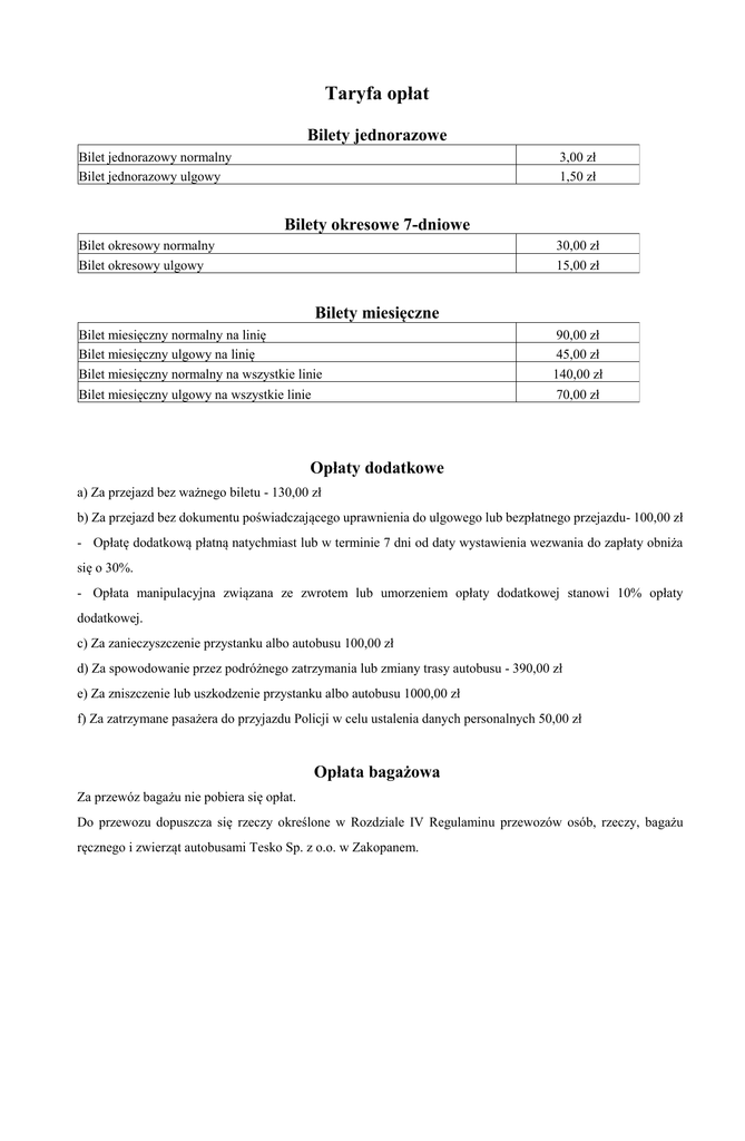 Taryfa opłat Bilety jednorazowe 3,00 zł 1,50 zł Bilet jednorazowy normalny Bilet jednorazowy ulgowy Bilety okresowe 7-dniowe 30,00 zł 15,00 zł Bilet okresowy normalny Bilet okresowy ulgowy Bilety miesięczne Bilet miesięczny normalny na linię Bilet miesięczny ulgowy na linię 90,00 zł 45,00 zł Bilet miesięczny normalny na wszystkie linie Bilet miesięczny ulgowy na wszystkie linie 140,00 zł 70,00 zł Opłaty dodatkowe a) Za przejazd bez ważnego biletu - 130,00 zł b) Za przejazd bez dokumentu poświadczającego uprawnienia do ulgowego lub bezpłatnego przejazdu- 100,00 zł - Opłatę dodatkową płatną natychmiast lub w terminie 7 dni od daty wystawienia wezwania do zapłaty obniża się o 30%. - Opłata manipulacyjna związana ze zwrotem lub umorzeniem opłaty dodatkowej stanowi 10% opłaty dodatkowej. c) Za zanieczyszczenie przystanku albo autobusu 100,00 zł d) Za spowodowanie przez podróżnego zatrzymania lub zmiany trasy autobusu - 390,00 zł e) Za zniszczenie lub uszkodzenie przystanku albo autobusu 1000,00 zł f) Za zatrzymane pasażera do przyjazdu Policji w celu ustalenia danych personalnych 50,00 zł Opłata bagażowa Za przewóz bagażu nie pobiera się opłat. Do przewozu dopuszcza się rzeczy określone w Rozdziale IV Regulaminu przewozów osób, rzeczy, bagażu ręcznego i zwierząt autobusami Tesko Sp. z o.o. w Zakopanem. Uprawnienia do zwolnień i ulg w opłatach za przejazdy w komunikacji miejskiej w Zakopanem. 1. Do korzystania z bezpłatnych i ulgowych przejazdów - na podstawie przepisów szczególnych ustanawiających powszechnie obowiązujące ulgi i zwolnienia za przejazdy w komunikacji miejskiej w Zakopanem (ulgi ustawowe) uprawnieni są: Uprawnienia do przejazdów bezpłatnych ( 100% ulga) Dokument potwierdzający uprawnienia do ulgi Uprawnieni - podstawa prawna Posłowie i senatorowie RP art. 43 ust.1 ustawy z dnia 09.05 1996 roku o wykonywaniu mandatu posła i senatora ( Dz. U. z 2015 r. poz. 1605) Legitymacja posła lub senatora Inwalidzi wojenni i wojskowi oraz przewodnicy towarzyszący inwalidzie zaliczonemu do I grupy inwalidzkiej art. 16 ust. 1 i 2 i art. 41 ustawy z dnia 29 maja 1974 roku o zaopatrzeniu inwalidów wojennych i wojskowych oraz ich rodzin ( t. j. Dz.U. 2015 r. poz. 846 Książeczka inwalidy wojennego lub wojskowego, przez wskazanie ) Osoby represjonowane, będące inwalidami, oraz przewodnicy towarzyszący osobie represjonowanej zaliczonej do I grupy inwalidzkiej art. 4 w zw. Z art. 12 ust. 1 i 2 i ust. 5 ustawy z dnia 24 stycznia 1991r. o kombatantach oraz niektórych osobach będących ofiarami represji wojennych i okresu powojennego ( Dz. U. z 2014r. poz. 1206) i art. 16 ust. 1 i 2 ustawy z 29 maja 1974r. o zaopatrzeniu inwalidów wojennych i wojskowych i ich rodzin (tj. Dz.U. 2015 r. Legitymacja osoby represjonowanej, poz. 846) wystawiona przez organ rentowy ( ZUS) Uprawnienia do przejazdów ulgowych ( 50% ulga) Uprawnieni - podstawa prawna Dokument potwierdzający uprawnienia do ulgi Studenci art. 188 Prawo o szkolnictwie wyższym z dnia 27 lipca 2005 Legitymacja studencka r. ( Dz.U. z 2012 r. poz. 572) Legitymacja słuchacza kolegium Słuchacze kolegiów nauczycielskich i kolegiów języków obcych art. 77 ust. 4 ustawy z dnia 7 września 1991 r. o systemie oświaty; (Dz.U. 2015 r., poz. 2156) Kombatanci i osoby represjonowane nie będące inwalidami Art. 20 Legitymacja lub zaświadczenie o uprawnieniach kombatanta ust. 1 ustawy z dnia 24 stycznia 1991r. o kombatantach oraz niektórych osobach będących ofiarami represji wojennych i okresu powojennego (Dz U. z 2014 r. poz. 1206) Legitymacja weterana poszkodowanego Weterani poszkodowani pobierający rentę inwalidzką z tytułu urazów lub chorób powstałych w związku z udziałem w działaniach wraz z legitymacją emeryta rencisty. poza granicami państwa art.30 ust.1 pkt 1 i art. 9 ust.1 ustawy z dnia19 sierpnia 2011 roku o weteranach działań poza granicami państwa (Dz. U. Nr 205, poz.1203) 2. Do korzystania z bezpłatnych i ulgowych przejazdów - na podstawie przepisów gminnych ustanawiających obowiązujące ulgi i zwolnienia za przejazdy w komunikacji miejskiej w Zakopanem uprawnieni są: Uprawnienia do ulgowych przejazdów w komunikacji miejskiej w Zakopanem obsługiwanej przez Tesko Sp. z o. o. - podstawa prawna uchwała Rady Miasta Zakopane (ulga 100%) Uprawnieni- podstawa prawna Dokument potwierdzający uprawnienia do ulgi Dzieci do lat 4, w przypadku jeżeli pasażer, rodzic nie żąda Na podstawie oświadczenia rodzica lub opiekuna dla nich miejsca siedzącego - bez biletu Mieszkańcy Miasta Zakopane, którzy ukończyli 65 lat życia Uczniowie szkół podstawowych i gimnazjum uczęszczających do szkół, dla których organem prowadzącym jest Gmina Miasto Zakopane oraz opiekun dziecka do 7 lat, podstawa prawna art. 17 ustawy o systemie oświaty z dnia 07.09.1991 r. (Dz.U. z 2015 r., poz. 2156 z późn. zm.) Posiadacze dowodów rejestracyjnych samochodów osobowych. Na podstawie dowodu osobistego Na podstawie identyfikatora wydanego przez Burmistrza Miasta Zakopane Ważny dowód rejestracyjny pojazdu osobowego z opłaconym ubezpieczeniem OC, okazany tylko i wyłącznie w trakcie przejazdu Dzieci i młodzież, będące osobami niepełnosprawnymi do Orzeczenie właściwego zespołu orzekającego o ukończenia 21 roku życia, a w przypadku realizacji umiarkowanym lub lekkim stopniu obowiązku szkolnego i obowiązku nauki do ukończenia 25 niepełnosprawności wraz z dokumentem roku życia potwierdzającym tożsamość osoby uprawnionej Inwalidzi I grupy z ogólnego stanu zdrowia, osoby Legitymacja rencisty z wpisem o całkowitej całkowicie niezdolne do pracy oraz niezdolne do niezdolności do pracy i samodzielnej egzystencji lub I samodzielnej egzystencji, osoby zaliczone do znacznego grupy inwalidzkiej wraz z dokumentami stopnia niepełnosprawności. potwierdzającymi tożsamość pasażera; lub orzeczenia wydanego przez ZUS lub KRUS z określeniem całkow