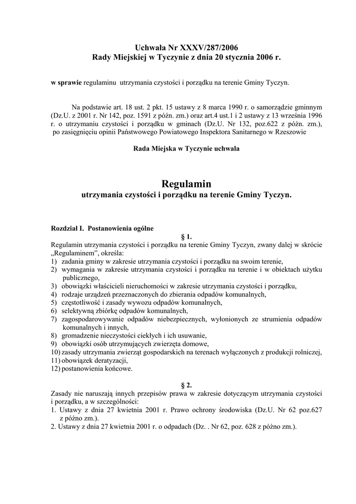 Uchwała Nr XXXV/287/2006 Rady Miejskiej w Tyczynie z dnia 20 stycznia 2006 r. w sprawie regulaminu utrzymania czystości i porządku na terenie Gminy Tyczyn. Na podstawie art. 18 ust. 2 pkt. 15 ustawy z 8 marca 1990 r. o samorządzie gminnym (Dz.U. z 2001 r. Nr 142, poz. 1591 z późn. zm.) oraz art.4 ust.1 i 2 ustawy z 13 września 1996 r. o utrzymaniu czystości i porządku w gminach (Dz.U. Nr 132, poz.622 z późn. zm.), po zasięgnięciu opinii Państwowego Powiatowego Inspektora Sanitarnego w Rzeszowie Rada Miejska w Tyczynie uchwala Regulamin utrzymania czystości i porządku na terenie Gminy Tyczyn. Rozdział I. Postanowienia ogólne § 1. Regulamin utrzymania czystości i porządku na terenie Gminy Tyczyn, zwany dalej w skrócie „Regulaminem”, określa: 1) zadania gminy w zakresie utrzymania czystości i porządku na swoim terenie, 2) wymagania w zakresie utrzymania czystości i porządku na terenie i w obiektach użytku publicznego, 3) obowiązki właścicieli nieruchomości w zakresie utrzymania czystości i porządku, 4) rodzaje urządzeń przeznaczonych do zbierania odpadów komunalnych, 5) częstotliwość i zasady wywozu odpadów komunalnych, 6) selektywną zbiórkę odpadów komunalnych, 7) zagospodarowywanie odpadów niebezpiecznych, wyłonionych ze strumienia odpadów komunalnych i innych, 8) gromadzenie nieczystości ciekłych i ich usuwanie, 9) obowiązki osób utrzymujących zwierzęta domowe, 10) zasady utrzymania zwierząt gospodarskich na terenach wyłączonych z produkcji rolniczej, 11) obowiązek deratyzacji, 12) postanowienia końcowe. § 2. Zasady nie naruszają innych przepisów prawa w zakresie dotyczącym utrzymania czystości i porządku, a w szczególności: 1. Ustawy z dnia 27 kwietnia 2001 r. Prawo ochrony środowiska (Dz.U. Nr 62 poz.627 z późno zm.). 2. Ustawy z dnia 27 kwietnia 2001 r. o odpadach (Dz. . Nr 62, poz. 628 z późno zm.). Rozdział II. Zadania gminy w zakresie utrzymania czystości i porządku na swoim terenie § 3. Gmina ma obowiązek tworzyć warunki do wykonywania prac związanych z utrzymaniem czystości i porządku poprzez: 1. Zapewnienie wywozu i odbioru odpadów komunalnych poprzez wydanie zezwoleń, podpisanie umów z jednostkami zapewniającymi ich składowanie, wykorzystywanie i unieszkodliwianie, bądź też tworzenie odpowiednich jednostek organizacyjnych realizujących te zadania. 2. Organizowanie i prowadzenie na terenie całej gminy selektywnej zbiórki odpadów komunalnych z wyłanianiem odpadów niebezpiecznych przydatnych do odzysku oraz współdziałanie z przedsiębiorstwami prowadzącymi działalność w zakresie gospodarowania tego rodzaju odpadami. 3. Budowę, utrzymanie i eksploatację wspólnych z innymi gminami: - stacji zlewnych, w przypadku, gdy podłączenie wszystkich nieruchomości do sieci kanalizacyjnej jest niemożliwe lub powoduje nadmierne koszty, - instalacji i urządzeń do zbierania, transportu i unieszkodliwiania zwłok zwierzęcych lub ich części, - szaletów publicznych. 4. Zapewnienie zbierania, transport i unieszkodliwianie zwłok bezdomnych zwierząt lub ich części oraz współdziałanie z przedsiębiorcami podejmującymi działalność w tym zakresie. 5. Utrzymywanie czystości na terenach ulic, chodnikach, placach, terenach zieleni, parkach, drogach publicznych, których zarządcą jest gmina. 6. Organizowanie ochrony przed bezdomnymi zwierzętami na zasadach określonych w odrębnych przepisach. 7. Znakowania obszarów dotkniętych lub zagrożonych chorobą zakaźną. 8. Utworzenie ewidencji zbiorników bezodpływowych i oczyszczalni przydomowych w celu opracowania planu rozwoju sieci kanalizacyjnej. 9. Prowadzenie ewidencji umów zawartych na odbieranie odpadów komunalnych od właścicieli nieruchomości w celu kontroli wykonywania przez właścicieli nieruchomości i przedsiębiorców obowiązków wynikających z ustawy. Rozdział III. Wymagania w zakresie otrzymania czystości i porządku na terenie i w obiektach użytku publicznego § 4. Osobom korzystającym z terenów i obiektów użyteczności publicznej zabrania się: 1. Wyrzucania i wylewania odpadów do rowów przydrożnych, cieków i terenów użytku publicznego. 2. Niszczenia znajdujących się na tych terenach elementów infrastruktury technicznej takich jak: koszy na śmieci, ławek, instalacji oświetleniowej, tablic informacyjnych i innych urządzeń. 3. Niszczenia zieleni. 4. Hałasowania i zachowywania się w sposób wykraczający poza ogólnie przyjęte normy. 5. Spalania odpadów gromadzonych w koszach ulicznych i pojemnikach specjalnie do tego celu przeznaczonych. 6. Rozmieszczania ogłoszeń, plakatów, itp. w miejscach nie przeznaczonych do tego celu, a przede wszystkim na drzewach, słupach, przystankach autobusowych, elewacjach budynków, ogrodzeń innych obiektów stanowiących własność komunalną. 2 7. Zabrania się gromadzenia w koszach ulicznych odpadów komunalnych powstających w lokalach handlowych, gastronomicznych, usługowych i mieszkalnych. § 5. 1. Na terenach użytku publicznego (drogach, placach, parkach, obiektach sportowych) rozmieszcza się kosze uliczne. 2. Obowiązek utrzymania czystości wokół koszy oraz usuwanie zgromadzonych w nich odpadów ciąży na zarządcy drogi, a na innych nieruchomościach na ich właścicielach. 3. Ustala się częstotliwość opróżniania koszy ulicznych: „w miarę potrzeb” oraz w okresie wiosenno-letnim co roku przynajmniej 2 razy w miesiącu. Rozdział IV. Obowiązki właścicieli nieruchomości w zakresie utrzymania czystości i porządku § 6. 1. Właściciele nieruchomości są obowiązani do utrzymania porządku, czystości oraz należytego stanu sanitarno – higienicznego nieruchomości. 2. Właściciele nieruchomości oraz najemcy/właściciele lokali zapewniają utrzymanie czystości i porządku na terenie nieruchomości poprzez: 1) wyposażenie nieruchomości w urządzenia służące do zbierania odpadów komunalnych (z obowiązku groma