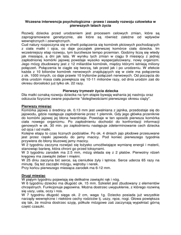 Wczesna interwencja psychologiczna - prawa i zasady rozwoju człowieka w pierwszych latach życia Rozwój dziecka przed urodzeniem jest procesem celowych zmian, które są zaprogramowane genetycznie, ale które są również zależne od wpływów wewnętrznych i zewnętrznych. Cud natury rozpoczyna się w chwili połączenia się komórek płciowych pochodzących z ciała matki i ojca, co daje początek pierwszej komórce ciała dziecka. Im wcześniejszy etap rozwoju, tym burzliwsze tempo przemian. Godziny liczą się wtedy jak miesiące, a dni jak lata. W wyniku tych zmian w ciągu 9 miesięcy z jednej zapłodnionej komórki jajowej powstaje wysoko wyspecjalizowany, nowy organizm. Jego mózg zbudowany jest z 12 miliardów komórek, między którymi istnieją miliony połączeń. Połączenia te ciągle się tworzą, tak przed jak i po urodzeniu. W efekcie każda z 10 bilionów komórek nerwowych znajdujących się w ciele ma połączenia z ok. 1000 innych, co daje prawie 10 trylionów połączeń nerwowych. Od poczęcia do dnia urodzin masa ciała powiększa się 10-11 milionów razy, od dnia urodzin zaś do okresu dorosłości już tylko ok. 22 razy. Pierwszy trymestr życia dziecka Dla matki oznaką rozwoju dziecka na tym etapie bywają wahania jej nastroju oraz odczucia fizyczne zwane popularnie "dolegliwościami pierwszego okresu ciąży". Pierwszy miesiąc Komórka jajowa o średnicy ok. 0.13 mm jest uwalniana z jajnika, przedostaje się do jajowodu, gdzie następuje zapłodnienie przez 1 plemnik. Gdy jego główka przeniknie do komórki jajowej jej błona twardnieje. Powstaje w ten sposób pierwsza komórka ciała nowego organizmu. Po zapłodnieniu dochodzi do konfrontacji informacji genowych w ok. 30 min. po zapłodnieniu następuje zdeterminowanie cech dziecka od ojca i od matki. Kolejne etapy to czas licznych podziałów. Po ok. 4 dniach jajo płodowe przesuwane jest przez rzęski jajowodu do jamy macicy. Pod koniec pierwszego tygodnia przywiera do błony śluzowej jamy macicy. W 2 tygodniu zaczyna rozwijać się łożysko umożliwiające wymianę energii i materii, stanowiąc barierę, która chroni go przed toksynami. W 3 tygodniu zarodek ma 2.5 mm, mózg składa się z 2 płatów. Pierwotny rdzeń kręgowy ma zawiązki żeber i mięśni. W 25 dniu zaczyna bić serce, są cieniutkie żyły i tętnice. Serce uderza 65 razy na minutę. Są też zaczątki mózgu, wątroby i nerek. Przy końcu pierwszego miesiąca zarodek ma 6-12 mm. Drugi miesiąc W piątym tygodniu pojawiają się delikatne zawiązki rąk i nóg. W 6 tygodniu dziecko ma długość ok. 15 mm. Szkielet jest zbudowany z elementów chrzęstnych. Funkcjonuje pępowina. Można dostrzec uwypuklenie, z którego rozwiną się uszy, usta, oczy i nos. W 7 tygodniu długość sięga ok. 2 cm, waga 1g. Dziecko posiada już wszystkie narządy wewnętrzne i niektóre cechy rodziców tj. uszy, ręce, nogi. Głowa powiększa się tak, że można dostrzec szyję, półkule mózgowe zaś zaczynają wypełniać górną część czaszki. W 43 dniu odnotowano pierwsze oznaki fal mózgowych, będących fizjologicznym podłożem tworzącej się świadomości dziecka. Dziecko ćwiczy ruchy, czasem przykłada palec do ust, skóra okolicy warg staje się wrażliwa na dotyk. W 8 tygodniu powstały już wszystkie zawiązki narządów dziecka. Głowa stanowi 1 długości jego ciała. Część twarzowa jest wyraźnie rozwinięta, ręce maja dłonie, palce, kciuk. Rozwijają się narządy płciowe. Rytm bicia serca pozwala na pełny obraz EKG, żołądek wytwarza soki trawienne, nerki usuwają kwas moczowy. Kończąc drugi miesiąc życia, dziecko osiąga wzrost 3 cm. Trzeci miesiąc W 9 tygodniu dziecko prostuje plecy, jego głowa nie opada na brzuszek. Doskonali się zmysł dotyku. Tworzy się nerw węchowy. Dziecko ma ok. 4 g wagi i 4 cm długości. W 10 tygodniu powstaje 3-krotnie więcej połączeń nerwowo-mięśniowych niż w 9 tygodniu. Dziecko szybko rośnie, osiągając ok. 6 cm długości a ważąc ok. 7 g. W 11 tygodniu zaczynają kształtować się struny głosowe, zawiązki zębów (20). Nadal rozwija się wrażliwość dotykowa, drażnienie jednego miejsca powoduje ciąg reakcji uogólnionych. W połowie tego tygodnia dziecko zamykając dłoń, zaczyna używać kciuka. W 12 tygodniu dziecko zaczyna połykać wody płodowe i reagować na ich smak. Pojawiają się pierwsze próby ruchów oddechowych klatki piersiowej jak też spontaniczny ruch podciągania górnej wargi. Intensywnie kształtuje się aktywność ruchowa - dziecko podciąga i wyprostowuje ręce i nogi, macha nimi, porusza dłonią i stopą, obraca głowę, kołysze biodrami, otwiera i zamyka usta, rusza gałkami ocznymi, ściąga brwi, robi grymasy twarzy przeciwstawia kciuk pozostałym palcom co jest bardzo istotnym elementem umiejętności chwytania. Ruchliwość dziecka jest wyrazem jego temperamentu. Opracowanie teoretyczne: Renata Smoleń - psycholog, logopeda, pracownik PPPP w Tarnowie. Drugi trymestr życia dziecka Czwarty miesiąc Dziecko waży ok. 28 g, od czubka głowy do siedzenia mierzy ok. 9 cm Wzrasta objętość płynu owodniowego, który łagodzi wstrząsy, dziecko może w nim ćwiczyć swoje ruchy, zmysł równowagi; połykanie płynu zapewnia ćwiczenie mięśni potrzebnych po porodzie do jedzenia, oddychania i wydawania głosu; dziecko połyka ok. 1 litra wód płodowych dziennie i jest wrażliwe na ich smak, matka może zacząć odczuwać ruchy dziecka. W 13 tygodniu zaczynają się spontaniczne ruchy klatki piersiowej. W 14 i 15 tygodniu ciało dziecka staje się wrażliwe na dotyk, dojrzewa dynamicznie mózg dziecka, rozwijają się ciągle nowe połączenia nerwowe. Piąty miesiąc Dziecko waży ok. 40 dag i mierzy ok. 25 cm, rosną paznokcie, pojawiają się włosy, ruchy dziecka są wyraźnie wyczuwalne przez matkę; można dokładnie powiedzieć, kiedy maluch śpi, ma czkawkę, kopie, obraca się lub przeciąga. Od 17 tygodnia dziecko uwyp