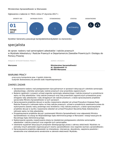 Ministerstwo Sprawiedliwości w Warszawie Ogłoszenie o naborze nr 7910 z dnia 27 stycznia 2017 r. OFERTY DO 01 lutego 2017 WYMIAR ETATU STANOWISKA 1 1 STATUS DODATKOWE archiwalny Dyrektor Generalny poszukuje kandydatów\kandydatek na stanowisko: specjalista do spraw: nadzoru nad samorządami adwokatów i radców prawnych w Wydziale Adwokatury i Radców Prawnych w Departamencie Zawodów Prawniczych i Dostępu do Pomocy Prawnej MIEJSCE WYKONYWANIA PRACY: ADRES URZĘDU: Warszawa Ministerstwo Sprawiedliwości Al. Ujazdowskie 11 00-950 Warszawa WARUNKI PRACY - praca przy komputerze pow. 4 godzin dziennie, - budynek dostosowany do potrzeb osób niepełnosprawnych. ZAKRES ZADAŃ Sprawowanie nadzoru nad postępowaniem dyscyplinarnym w sprawach dotyczących członków samorządu adwokackiego, członków samorządu radców prawnych oraz prawników zagranicznych. Badanie zgodności z prawem uchwał organów samorządu adwokackiego i radców prawnych w przedmiocie wpisu na listę adwokatów i listę radców prawnych oraz listę prawników zagranicznych prowadzone przez okręgowe rady adwokackie i rady okręgowych izb radców prawnych, a także opracowywanie projektów sprzeciwów Ministra Sprawiedliwości w tych sprawach. Opracowywanie projektów decyzji w wyniku rozpoznania odwołań od uchwał Prezydium Krajowej Rady Radców Prawnych o odmowie wpisu na listę radców prawnych, uchwał w przedmiocie zawieszenia prawa do wykonywania zawodu radcy prawnego oraz skreślenia z listy radców prawnych, a także opracowywanie projektów decyzji w wyniku rozpoznania odwołań od uchwał Prezydium Naczelnej Rady Adwokackiej o odmowie wpisu na listę adwokatów. Przygotowywanie projektów decyzji i postanowień Ministra Sprawiedliwości oraz odpowiedzi Ministra Sprawiedliwości na skargi do Wojewódzkiego Sądu Administracyjnego w Warszawie i skargi kasacyjne do Naczelnego Sądu Administracyjnego. Nadzorowanie sposobu rozpatrywania skarg na niewłaściwe postępowanie członków samorządów adwokatów i radców prawnych oraz organów tych samorządów. Udzielanie wyjaśnień dotyczących przepisów obowiązującego prawa z zakresu właściwości Wydziału na potrzeby innych jednostek organizacyjnych resortu sprawiedliwości oraz organów wymiaru sprawiedliwości. Opracowywanie projektów odpowiedzi na interpelacje, interwencje, dezyderaty, zapytania poselskie i senatorskie oraz oświadczenia senatorskie w zakresie właściwości Wydziału. WYMAGANIA NIEZBĘDNE Wykształcenie: wyższe prawnicze doświadczenie zawodowe: 6 miesięcy w pracy w jednostkach sektora finansów publicznych znajomość Konstytucji Rzeczypospolitej Polskiej, znajomość ustawy o radcach prawnych i ustawy - Prawo o adwokaturze, znajomość Kodeksu postępowania administracyjnego i Kodeksu postępowania karnego, znajomość ustawy o dostępie do informacji publicznej, znajomość zasad techniki prawodawczej, znajomość struktur, organizacji pracy i zasad funkcjonowania wymiaru sprawiedliwości, umiejętność obsługi programów komputerowych MS Office, zorientowanie na osiąganie celów, doskonalenie zawodowe, identyfikacja z misją urzędu, pozytywne podejście do klienta, otwartość na zmiany, podejmowanie decyzji i odpowiedzialność, asertywność, myślenie analityczne, Posiadanie obywatelstwa polskiego Korzystanie z pełni praw publicznych Nieskazanie prawomocnym wyrokiem za umyślne przestępstwo lub umyślne przestępstwo skarbowe DOKUMENTY I OŚWIADCZENIA NIEZBĘDNE Życiorys/CV i list motywacyjny Kopie dokumentów potwierdzających spełnienie wymagania niezbędnego w zakresie wykształcenia Kopie dokumentów potwierdzających spełnienie wymagania niezbędnego w zakresie doświadczenia zawodowego / stażu pracy Oświadczenie o posiadaniu obywatelstwa polskiego albo kopia dokumentu potwierdzającego posiadanie polskiego obywatelstwa Oświadczenie o wyrażeniu zgody na przetwarzanie danych osobowych do celów naboru Oświadczenie o korzystaniu z pełni praw publicznych Oświadczenie o nieskazaniu prawomocnym wyrokiem za umyślne przestępstwo lub umyślne przestępstwo skarbowe DOKUMENTY I OŚWIADCZENIA DODATKOWE kopia dokumentu potwierdzającego niepełnosprawność - w przypadku kandydatek/kandydatów, zamierzających skorzystać z pierwszeństwa w zatrudnieniu w przypadku, gdy znajdą się w gronie najlepszych kandydatek/kandydatów TERMINY I MIEJSCE SKŁADANIA DOKUMENTÓW Dokumenty należy złożyć do: 01 lutego 2017 r. Decyduje data: stempla pocztowego / osobistego dostarczenia oferty do urzędu Miejsce składania dokumentów: Ministerstwo Sprawiedliwości Biuro Dyrektora Generalnego Wydział Zarządzania Zasobami Ludzkimi Al. Ujazdowskie 11 00-950 Warszawa Z podaniem na kopercie numeru ogłoszenia INNE INFORMACJE: W miesiącu poprzedzającym datę upublicznienia ogłoszenia wskaźnik zatrudnienia osób niepełnosprawnych w urzędzie, w rozumieniu przepisów o rehabilitacji zawodowej i społecznej oraz zatrudnianiu osób niepełnosprawnych, nie wynosi co najmniej 6%. Nasz urząd jest pracodawcą równych szans i wszystkie aplikacje są rozważane z równą uwagą bez względu na płeć, wiek, niepełnosprawność, rasę, narodowość, przekonania polityczne, przynależność związkową, pochodzenie etniczne, wyznanie, orientację seksualną czy też jakąkolwiek inną cechę prawnie chronioną. Proponowane wynagrodzenie zasadnicze brutto: do 3372,91 zł (mnożnik kwoty bazowej do wysokości 1,8). Kandydatki/kandydaci, których oferty spełnią wymagania formalne zostaną powiadomieni o terminie kolejnego etapu naboru mailem lub telefonicznie. Etapy naboru: test wiedzy, sprawdzian umiejętności, rozmowa kwalifikacyjna. Oferty przesłane po terminie nie będą rozpatrywane (decyduje data stempla pocztowego). Oferty nie spełniające wymagań formalnych zostaną zniszczone komisyjnie w terminie 14 dni od zakończenia naboru. Zainteresowanych zachęcamy do zapoznania się z załącznikiem nr 2 do Zarządzenia Dyrektora G
