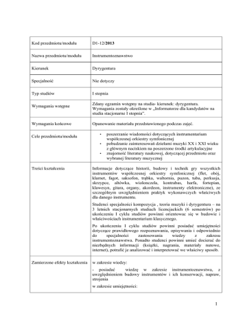 Kod przedmiotu/modułu D1-12/2013 Nazwa przedmiotu/modułu Instrumentoznawstwo Kierunek Dyrygentura Specjalność Nie dotyczy Typ studiów I stopnia Wymagania wstępne Wymagania końcowe Cele przedmiotu/modułu Zdany egzamin wstępny na studia- kierunek: dyrygentura. Wymagania zostały określone w „Informatorze dla kandydatów na studia stacjonarne I stopnia”. Opanowanie materiału przedstawionego podczas zajęć. • • • Treści kształcenia poszerzanie wiadomości dotyczących instrumentarium współczesnej orkiestry symfonicznej pobudzanie zainteresowań dziełami muzyki XX i XXI wieku z głównym naciskiem na poszerzone środki artykulacyjne znajomość literatury naukowej, dotyczącej przedmiotu oraz wybranej literatury muzycznej Informacje dotyczące historii, budowy i technik gry wszystkich instrumentów współczesnej orkiestry symfonicznej (flet, obój, klarnet, fagot, saksofon, trąbka, waltornia, puzon, tuba, perkusja, skrzypce, altówka, wiolonczela, kontrabas, harfa, fortepian, klawesyn, gitara, organy, akordeon, instrumenty elektroniczne), ze szczególnym uwzględnieniem praktyk wykonawczych właściwych dla danego instrumentu. Studenci specjalności kompozycja , teoria muzyki i dyrygentura – na 3 letnich stacjonarnych studiach licencjackich (6 semestrów) po ukończeniu I cyklu studiów powinni orientowac się w budowie i właściwościach instrumentarium klasycznego. Po ukończeniu I cyklu studiów powinni posiadać umiejętności dotyczące prawidłowego rozpoznawania, opisywania i odpowiednio do specjalności zastosowania wiedzy z zakresu instrumentoznawstwa. Ponadto studenci powinni umieć docierać do niezbędnych informacji (książki, nagrania, materiały nutowe, internet), potrafić je analizować i interpretować we właściwy sposób. Zamierzone efekty kształcenia w zakresie wiedzy: - posiadać wiedzę w zakresie instrumentoznawstwa, z uwzględnieniem budowy instrumentów i ich konserwacji, napraw, strojenia w zakresie umiejętności: 1 nie dotyczy w zakresie kompetencji społecznych: nie dotyczy Formy kształcenia (np. wykład/ćwiczenia/inne) wykład Rok I Punkty ECTS (nakład pracy studenta niezbędny do Semestr osiągnięcia zamierzonych efektów kształcenia) Punkty ECTS II 1 2 2 2 2 2 zal egz 3 III 4 5 6 Ilość godzin w tygodniu Rodzaj zaliczenia Legenda Kryteria oceny i sposoby weryfikacji Literatura zal – zaliczenie; zst – zaliczenie ze stopniem; egz – egzamin; ekm – egzamin komisyjny Student powinien wykazać się dobrą znajomością zrealizowanego na zajęciach materiału. Ocena uwzględnia również aktywność studenta w trakcie zajęć. Raz w semestrze student przedstawia referat opisujący historię, budowę i techniki gry wybranego instrumentu oraz przedstawia wybraną literaturę muzyczną. • • • • • • • • Mieczysław Drobner - „Instrumentoznawstwo i akustyka”, Warszawa 1956. Kazimierz Guzowski - „Podstawowe zagadnienia instrumentacji”, Gdańsk 1976 Józef Pawłowski - „Podstawy instrumentacji”, Warszawa 1959 Mikołaj A. Rimski-Korsakow - „Zasady instrumentacji”, Kraków 1953 Alfredo Casella - „Die Technik des modernen Orchesters”, Mediolan 1950 Witold Szalonek - „O nie wykorzystanych walorach sonorystycznych instrumentów dętych drewnianych” (Res Facta 7) Bruno Bartolozzi - „Nowe brzmienia instrumentów dętych drewnianych” (Res Facta 8) Hector Berlioz - „Grand Traité d’Instrumentation et 2 • • Język wykładowy Prowadzący d’Orchestration Modernes”, Paryż 1844 Adolf Bernhard Marx - „Die Lehre von der musikalischen Komposition (praktisch theoretisch)”, tom IV, Berlin 1852 Hector Berlioz, Richard Strauss - „Instrumentationslehre”, 1904 polski dr P. Hendrich Uwagi 3