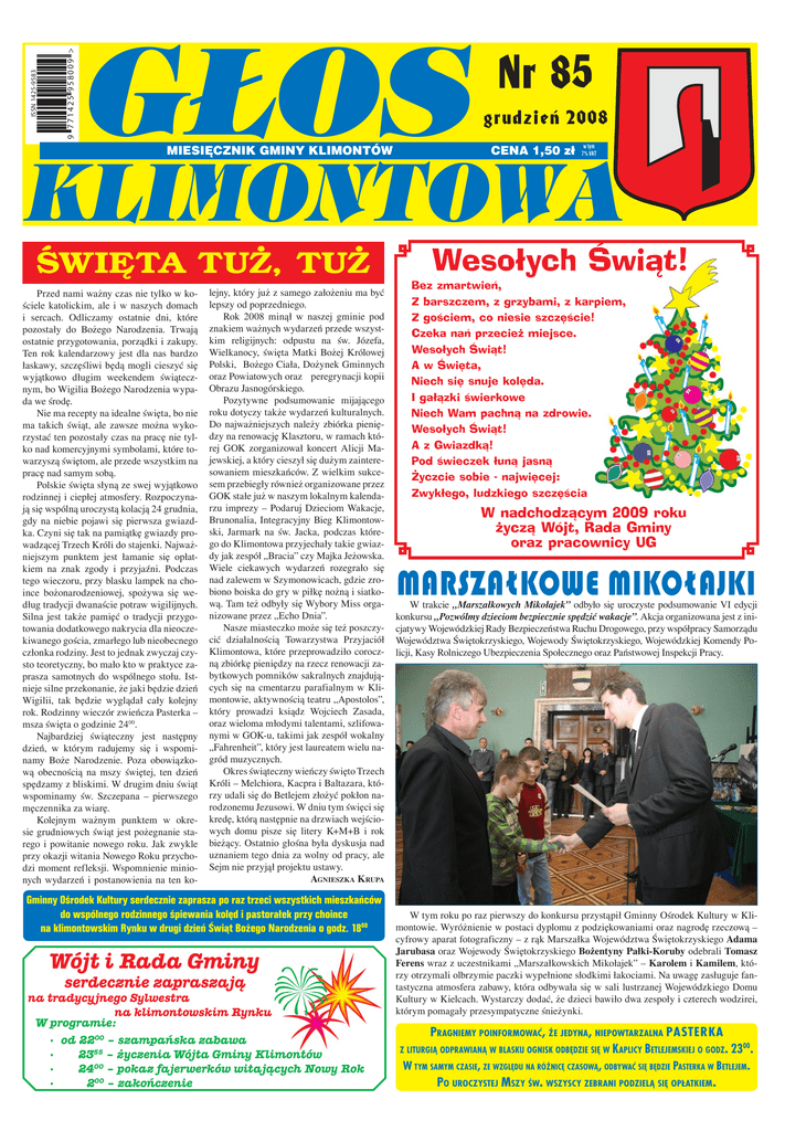 9 771425 958009 > ISSN 1425-9583 GŁOS Nr 85 grudzień 2008 KLIMONTOWA MIESIĘCZNIK GMINY KLIMONTÓW ŚWIĘTA TUŻ, TUŻ Przed nami ważny czas nie tylko w kościele katolickim, ale i w naszych domach i sercach. Odliczamy ostatnie dni, które pozostały do Bożego Narodzenia. Trwają ostatnie przygotowania, porządki i zakupy. Ten rok kalendarzowy jest dla nas bardzo łaskawy, szczęśliwi będą mogli cieszyć się wyjątkowo długim weekendem świątecznym, bo Wigilia Bożego Narodzenia wypada we środę. Nie ma recepty na idealne święta, bo nie ma takich świąt, ale zawsze można wykorzystać ten pozostały czas na pracę nie tylko nad komercyjnymi symbolami, które towarzyszą świętom, ale przede wszystkim na pracę nad samym sobą. Polskie święta słyną ze swej wyjątkowo rodzinnej i ciepłej atmosfery. Rozpoczynają się wspólną uroczystą kolacją 24 grudnia, gdy na niebie pojawi się pierwsza gwiazdka. Czyni się tak na pamiątkę gwiazdy prowadzącej Trzech Króli do stajenki. Najważniejszym punktem jest łamanie się opłatkiem na znak zgody i przyjaźni. Podczas tego wieczoru, przy blasku lampek na choince bożonarodzeniowej, spożywa się według tradycji dwanaście potraw wigilijnych. Silna jest także pamięć o tradycji przygotowania dodatkowego nakrycia dla nieoczekiwanego gościa, zmarłego lub nieobecnego członka rodziny. Jest to jednak zwyczaj czysto teoretyczny, bo mało kto w praktyce zaprasza samotnych do wspólnego stołu. Istnieje silne przekonanie, że jaki będzie dzień Wigilii, tak będzie wyglądał cały kolejny rok. Rodzinny wieczór zwieńcza Pasterka – msza święta o godzinie 2400. Najbardziej świąteczny jest następny dzień, w którym radujemy się i wspominamy Boże Narodzenie. Poza obowiązkową obecnością na mszy świętej, ten dzień spędzamy z bliskimi. W drugim dniu świąt wspominamy św. Szczepana – pierwszego męczennika za wiarę. Kolejnym ważnym punktem w okresie grudniowych świąt jest pożegnanie starego i powitanie nowego roku. Jak zwykle przy okazji witania Nowego Roku przychodzi moment refleksji. Wspomnienie minionych wydarzeń i postanowienia na ten ko- lejny, który już z samego założeniu ma być lepszy od poprzedniego. Rok 2008 minął w naszej gminie pod znakiem ważnych wydarzeń przede wszystkim religijnych: odpustu na św. Józefa, Wielkanocy, święta Matki Bożej Królowej Polski, Bożego Ciała, Dożynek Gminnych oraz Powiatowych oraz peregrynacji kopii Obrazu Jasnogórskiego. Pozytywne podsumowanie mijającego roku dotyczy także wydarzeń kulturalnych. Do najważniejszych należy zbiórka pieniędzy na renowację Klasztoru, w ramach której GOK zorganizował koncert Alicji Majewskiej, a który cieszył się dużym zainteresowaniem mieszkańców. Z wielkim sukcesem przebiegły również organizowane przez GOK stałe już w naszym lokalnym kalendarzu imprezy – Podaruj Dzieciom Wakacje, Brunonalia, Integracyjny Bieg Klimontowski, Jarmark na św. Jacka, podczas którego do Klimontowa przyjechały takie gwiazdy jak zespół „Bracia” czy Majka Jeżowska. Wiele ciekawych wydarzeń rozegrało się nad zalewem w Szymonowicach, gdzie zrobiono boiska do gry w piłkę nożną i siatkową. Tam też odbyły się Wybory Miss organizowane przez „Echo Dnia”. Nasze miasteczko może się też poszczycić działalnością Towarzystwa Przyjaciół Klimontowa, które przeprowadziło coroczną zbiórkę pieniędzy na rzecz renowacji zabytkowych pomników sakralnych znajdujących się na cmentarzu parafialnym w Klimontowie, aktywnością teatru „Apostolos”, który prowadzi ksiądz Wojciech Zasada, oraz wieloma młodymi talentami, szlifowanymi w GOK-u, takimi jak zespół wokalny „Fahrenheit”, który jest laureatem wielu nagród muzycznych. Okres świąteczny wieńczy święto Trzech Króli – Melchiora, Kacpra i Baltazara, którzy udali się do Betlejem złożyć pokłon narodzonemu Jezusowi. W dniu tym święci się kredę, którą następnie na drzwiach wejściowych domu pisze się litery K+M+B i rok bieżący. Ostatnio głośna była dyskusja nad uznaniem tego dnia za wolny od pracy, ale Sejm nie przyjął projektu ustawy. AGNIESZKA KRUPA Gminny Oœrodek Kultury serdecznie zaprasza po raz trzeci wszystkich mieszkañców do wspólnego rodzinnego œpiewania kolêd i pastora³ek przy choince na klimontowskim Rynku w drugi dzieñ Œwi¹t Bo¿ego Narodzenia o godz. 1800 Wójt i Rada Gminy serdecznie zapraszaj¹ na tradycyjnego Sylwestra na klimontowskim Rynku W programie: · od 2200 – szampañska zabawa · 2355 – ¿yczenia Wójta Gminy Klimontów · 2400 – pokaz fajerwerków witaj¹cych Nowy Rok · 200 – zakoñczenie CENA 1,50 zł w tym 7% VAT Wesołych Świąt! Bez zmartwień, Z barszczem, z grzybami, z karpiem, Z gościem, co niesie szczęście! Czeka nań przecież miejsce. Wesołych Świąt! A w Święta, Niech się snuje kolęda. I gałązki świerkowe Niech Wam pachną na zdrowie. Wesołych Świąt! A z Gwiazdką! Pod świeczek łuną jasną Życzcie sobie - najwięcej: Zwykłego, ludzkiego szczęścia W nadchodzącym 2009 roku życzą Wójt, Rada Gminy oraz pracownicy UG MARSZA£KOWE MIKO£AJKI W trakcie „Marszałkowych Mikołajek” odbyło się uroczyste podsumowanie VI edycji konkursu „Pozwólmy dzieciom bezpiecznie spędzić wakacje”. Akcja organizowana jest z inicjatywy Wojewódzkiej Rady Bezpieczeństwa Ruchu Drogowego, przy współpracy Samorządu Województwa Świętokrzyskiego, Wojewody Świętokrzyskiego, Wojewódzkiej Komendy Policji, Kasy Rolniczego Ubezpieczenia Społecznego oraz Państwowej Inspekcji Pracy. W tym roku po raz pierwszy do konkursu przystąpił Gminny Ośrodek Kultury w Klimontowie. Wyróżnienie w postaci dyplomu z podziękowaniami oraz nagrodę rzeczową – cyfrowy aparat fotograficzny – z rąk Marszałka Województwa Świętokrzyskiego Adama Jarubasa oraz Wojewody Świętokrzyskiego Bożentyny Pałki-Koruby odebrali Tomasz Ferens wraz z uczestnikami 