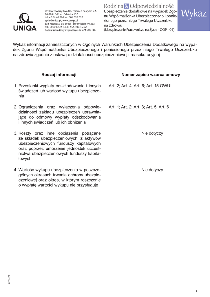 UNIQA Towarzystwo Ubezpieczeń na Życie S.A. 90-520 Łódź, ul. Gdańska 132 tel. 42 66 66 500 lub 801 597 597 [email protected], www.uniqa.pl Sąd Rejonowy dla Łodzi - Śródmieścia w Łodzi KRS 0000005751, NIP 554-100-15-22 Kapitał zakładowy i wpłacony: 42 774 700 PLN Rodzina & Odpowiedzialność Ubezpieczenie dodatkowe na wypadek Zgonu Współmałżonka Ubezpieczonego i poniesionego przez niego Trwałego Uszczerbku na zdrowiu Wykaz (Ubezpieczenie Pracownicze na Życie - GOP - 04) Wykaz informacji zamieszczonych w Ogólnych Warunkach Ubezpieczenia Dodatkowego na wypadek Zgonu Współmałżonka Ubezpieczonego i poniesionego przez niego Trwałego Uszczerbku na zdrowiu zgodnie z ustawą o działalności ubezpieczeniowej i reasekuracyjnej Rodzaj informacji Numer zapisu wzorca umowy 1.Przesłanki wypłaty odszkodowania i innych świadczeń lub wartość wykupu ubezpieczenia Art. 2; Art. 4; Art. 6; Art. 15 OWU 2.Ograniczenia oraz wyłączenia odpowiedzialności zakładu ubezpieczeń uprawniające do odmowy wypłaty odszkodowania i innych świadczeń lub ich obniżenia Art. 1; Art. 2; Art. 3; Art. 5; Art. 6 Nie dotyczy 4.Wartość wykupu ubezpieczenia w poszczególnych okresach trwania ochrony ubezpieczeniowej oraz okres, w którym roszczenie o wypłatę wartości wykupu nie przysługuje Nie dotyczy GWS-420 3.Koszty oraz inne obciążenia potrącane ze składek ubezpieczeniowych, z aktywów ubezpieczeniowych funduszy kapitałowych oraz poprzez umorzenie jednostek uczestnictwa ubezpieczeniowych funduszy kapitałowych 1