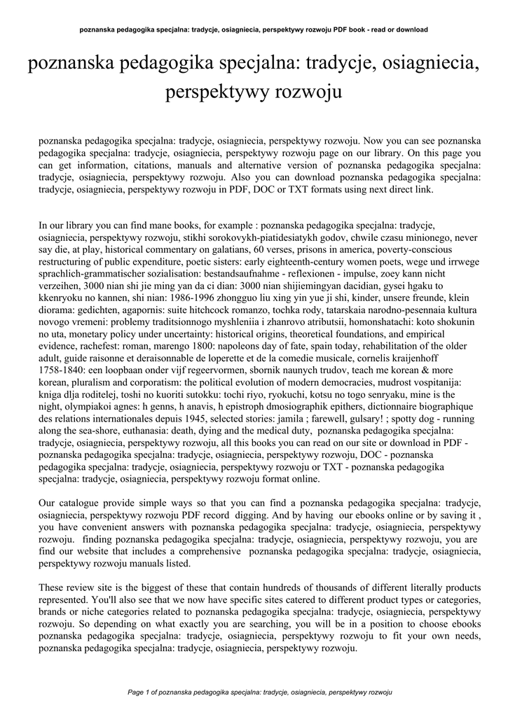 poznanska pedagogika specjalna: tradycje, osiagniecia, perspektywy rozwoju PDF book - read or download poznanska pedagogika specjalna: tradycje, osiagniecia, perspektywy rozwoju poznanska pedagogika specjalna: tradycje, osiagniecia, perspektywy rozwoju. Now you can see poznanska pedagogika specjalna: tradycje, osiagniecia, perspektywy rozwoju page on our library. On this page you can get information, citations, manuals and alternative version of poznanska pedagogika specjalna: tradycje, osiagniecia, perspektywy rozwoju. Also you can download poznanska pedagogika specjalna: tradycje, osiagniecia, perspektywy rozwoju in PDF, DOC or TXT formats using next direct link. In our library you can find mane books, for example : poznanska pedagogika specjalna: tradycje, osiagniecia, perspektywy rozwoju, stikhi sorokovykh-piatidesiatykh godov, chwile czasu minionego, never say die, at play, historical commentary on galatians, 60 verses, prisons in america, poverty-conscious restructuring of public expenditure, poetic sisters: early eighteenth-century women poets, wege und irrwege sprachlich-grammatischer sozialisation: bestandsaufnahme - reflexionen - impulse, zoey kann nicht verzeihen, 3000 nian shi jie ming yan da ci dian: 3000 nian shijiemingyan dacidian, gysei hgaku to kkenryoku no kannen, shi nian: 1986-1996 zhongguo liu xing yin yue ji shi, kinder, unsere freunde, klein diorama: gedichten, agapornis: suite hitchcock romanzo, tochka rody, tatarskaia narodno-pesennaia kultura novogo vremeni: problemy traditsionnogo myshleniia i zhanrovo atributsii, homonshatachi: koto shokunin no uta, monetary policy under uncertainty: historical origins, theoretical foundations, and empirical evidence, rachefest: roman, marengo 1800: napoleons day of fate, spain today, rehabilitation of the older adult, guide raisonne et deraisonnable de loperette et de la comedie musicale, cornelis kraijenhoff 1758-1840: een loopbaan onder vijf regeervormen, sbornik naunych trudov, teach me korean & more korean, pluralism and corporatism: the political evolution of modern democracies, mudrost vospitanija: kniga dlja roditelej, toshi no kuoriti sutokku: tochi riyo, ryokuchi, kotsu no togo senryaku, mine is the night, olympiakoi agnes: h genns, h anavis, h epistroph dmosiographik epithers, dictionnaire biographique des relations internationales depuis 1945, selected stories: jamila ; farewell, gulsary! ; spotty dog - running along the sea-shore, euthanasia: death, dying and the medical duty, poznanska pedagogika specjalna: tradycje, osiagniecia, perspektywy rozwoju, all this books you can read on our site or download in PDF poznanska pedagogika specjalna: tradycje, osiagniecia, perspektywy rozwoju, DOC - poznanska pedagogika specjalna: tradycje, osiagniecia, perspektywy rozwoju or TXT - poznanska pedagogika specjalna: tradycje, osiagniecia, perspektywy rozwoju format online. Our catalogue provide simple ways so that you can find a poznanska pedagogika specjalna: tradycje, osiagniecia, perspektywy rozwoju PDF record digging. And by having our ebooks online or by saving it , you have convenient answers with poznanska pedagogika specjalna: tradycje, osiagniecia, perspektywy rozwoju. finding poznanska pedagogika specjalna: tradycje, osiagniecia, perspektywy rozwoju, you are find our website that includes a comprehensive poznanska pedagogika specjalna: tradycje, osiagniecia, perspektywy rozwoju manuals listed. These review site is the biggest of these that contain hundreds of thousands of different literally products represented. You'll also see that we now have specific sites catered to different product types or categories, brands or niche categories related to poznanska pedagogika specjalna: tradycje, osiagniecia, perspektywy rozwoju. So depending on what exactly you are searching, you will be in a position to choose ebooks poznanska pedagogika specjalna: tradycje, osiagniecia, perspektywy rozwoju to fit your own needs, poznanska pedagogika specjalna: tradycje, osiagniecia, perspektywy rozwoju. Page 1 of poznanska pedagogika specjalna: tradycje, osiagniecia, perspektywy rozwoju