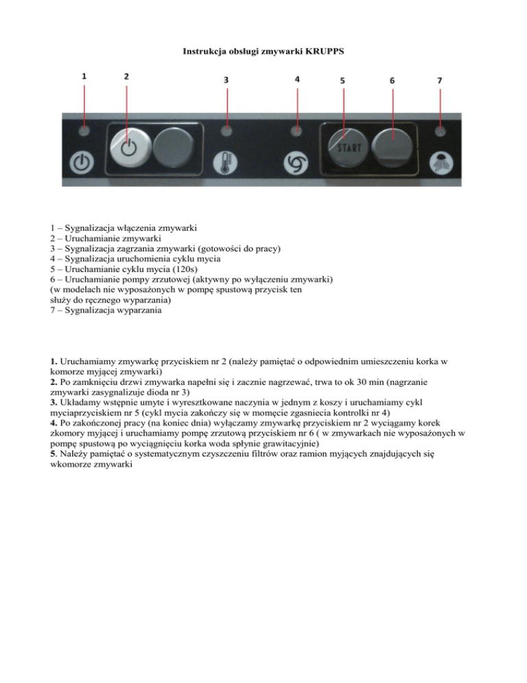 Instrukcja obsługi zmywarki KRUPPS 1 – Sygnalizacja włączenia zmywarki 2 – Uruchamianie zmywarki 3 – Sygnalizacja zagrzania zmywarki (gotowości do pracy) 4 – Sygnalizacja uruchomienia cyklu mycia 5 – Uruchamianie cyklu mycia (120s) 6 – Uruchamianie pompy zrzutowej (aktywny po wyłączeniu zmywarki) (w modelach nie wyposażonych w pompę spustową przycisk ten służy do ręcznego wyparzania) 7 – Sygnalizacja wyparzania 1. Uruchamiamy zmywarkę przyciskiem nr 2 (należy pamiętać o odpowiednim umieszczeniu korka w komorze myjącej zmywarki) 2. Po zamknięciu drzwi zmywarka napełni się i zacznie nagrzewać, trwa to ok 30 min (nagrzanie zmywarki zasygnalizuje dioda nr 3) 3. Układamy wstępnie umyte i wyresztkowane naczynia w jednym z koszy i uruchamiamy cykl myciaprzyciskiem nr 5 (cykl mycia zakończy się w momęcie zgasniecia kontrolki nr 4) 4. Po zakończonej pracy (na koniec dnia) wyłączamy zmywarkę przyciskiem nr 2 wyciągamy korek zkomory myjącej i uruchamiamy pompę zrzutową przyciskiem nr 6 ( w zmywarkach nie wyposażonych w pompę spustową po wyciągnięciu korka woda spłynie grawitacyjnie) 5. Należy pamiętać o systematycznym czyszczeniu filtrów oraz ramion myjących znajdujących się wkomorze zmywarki Instrukcja obsługi zmywarki Krupss z wyświetlaczem Wybór programu Status urządzenia Temperatura zbiornika Temperatura bojlera Przycisk włącz/wyłącz Przytrzymanie przycisku podczas ustawień w menu pozwala na wyjście z menu. Przycisk "Start" rozpoczyna cykl mycia. Strzałka "Góra" – pozwala na wybór czasu mycia/podczas ustawień w menu pozwala na zmianę wybranego parametru. Strzałka "Dół" – pozwala na wybór czasu mycia/podczas ustawień w menu pozwala na zmianę wybranego parametru. Przytrzymanie przycisku rozpoczyna dodatkowy cykl płukania/podczas ustawień w menu pozwala na przejście do poprzedniej pozycji w menu. Przytrzymanie przycisku uruchamia pompę spustową. Po zakończeniu cyklu urządzenie się wyłączy/podczas ustawień w menu pozwana na przejście do kolejnej pozycji w menu. 1. Włączamy zmywarkę przyciskiem „ON/OFF” (należy pamiętać o tym aby przed włączeniem zmywarki odpowiednio umieścić korek spustowy w komorze myjącej) 2. Zmywarka zacznie pobierać wodę oraz nagrzewać się ( w zależności od modelu trwa to ok 30 min)zmywarka zasygnalizuje gotowość do pracy w momencie gdy na wyświetlaczu w pasku „Statusu urządzenia” pojawi się napis „READY” 3. Układamy naczynia na jednym z koszy i uruchamiamy cykl mycia przyciskiem „START” (przyciskami „GÓRA”, „DÓŁ” wybieramy jeden z cykli, im krótszy cykl mycia tym mniejsze temperatury mycia i wyparzania oraz mniejsza ilość pobieranych płynów) 4. Zmywarka zasygnalizuje koniec pracy poprzez miganie wyświetlacza 5. Po zakończeniu pracy (na koniec dnia) wyciągamy korek spustowy z komory myjącej i wyłączamy zmywarkę przyciskiem „ON/OFF” (woda wypłynie ze zmywarki grawitacyjnie) 6. W przypadku zmywarek z zamontowaną pompą spustową po wyciągnięciu korka z komory myjącej należy uruchomić pompę spustową przyciskiem „MANUAL DRAIN” woda ze zmywarki zostanie automatycznie odpompowana) 7. Należy pamiętać o systematycznym czyszczeniu filtrów oraz ramion myjących znajdujących się wkomorze zmywarki PRZED PIERWSZYM UŻYCIEM URZĄDZENIA NALEŻY DOKŁADNIE ZAPOZNAĆ SIĘ Z INSTRUKCJĄ OBSŁUGI. INSTUKCJĘ POWINNO SIĘ PRZECHOWYWAĆ W BEZPIECZNYM ORAZ W DOSTĘPNYM DLA KAŻDEGO UŻYTKOWNIKA MIEJSCU. WSKAZÓWKI BEZPIECZEŃSTWA Urządzenie należy zawsze ustawiać na równym i stabilnym podłożu. Jedynie autoryzowany serwisant lub wykwalifikowany technik powinien zajmować się instalowaniem oraz naprawami, w przypadku wystąpienia usterek. Nie wolno samodzielnie demontować urządzenia. • • • • • • • • • • • • • • • • • • • ZABRANIA SIĘ zanurzania urządzenia w wodzie. Nigdy nie należy otwierać obudowy urządzenia samodzielnie. Należy zachować ostrożność podczas korzystania z urządzenia. Urządzenie należy ZAWSZE wyłączyć oraz odłączyć kabel zasilający z sieci, gdy nie jest używane. URZĄDZENIE NADAJE SIĘ TYLKO DO UŻYTKU W POMIESZCZENIACH. Urządzenie może być obsługiwane jedynie zgodnie z niniejszą instrukcją oraz przez osoby do tego przygotowane. ZABRANIA SIĘ obsługi urządzenia przez dzieci. Zawsze należy obserwować urządzenie podczas pracy. W przypadku uszkodzenia przewodu sieciowego, musi on być niezwłocznie wymieniony przez autoryzowanego serwisanta lub wykwalifikowanego technika, w celu uniknięcia porażenia prądem. Nigdy nie wolno wyciągać wtyczki z gniazdka ciągnąc za przewód! W przypadku zauważenia jakichkolwiek nieprawidłowości w działaniu urządzenia, należy je wyłączyć i skontaktować się z serwisem. Przed czynnościami związanymi z czyszczeniem i konserwacją urządzenia należy je wyłączyć i odłączyć od źródła zasilania. Nieprawidłowa obsługa i niewłaściwe użytkowanie może spowodować poważne uszkodzenia urządzenia oraz zagrożenie życia. Nie należy instalować urządzenia w pobliżu łatwopalnych gazów lub płynów. Przed podłączeniem urządzenia należy upewnić się, czy wartość napięcia w sieci, do której urządzenie będzie podłączone, są zgodne ze wskazanymi na tabliczce znamionowej. Regularnie kontrolować stan wtyczki i przewodu zasilającego. W przypadku wykrycia usterki urządzenie wyłączyć i niezwłocznie skontaktować się z wykwalifikowanym technikiem lub serwisantem. Nigdy nie naprawiać urządzenia samodzielnie. Opakowanie należy przechowywać w miejscu niedostępnym dla dzieci. Opakowania należy zachować przez okres trwania gwarancji. INFORMACJE OGÓLNE Zmywarka jest przeznaczona do zmywania naczyń (talerze, miski, sztućce, szklanki, itp.) w zakładach zbiorowego żywienia i gastronomii. Zmywarka jest urządzeniem pół automatycznym, obsługa ogranicza się do us