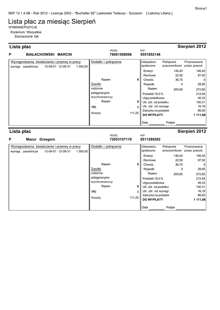 Strona1 SKP 12.1.4.0B - Rok 2012 - Licencja 2002 - "Buchalter 92" Laskowski Tadeusz - Szczecin [ Łakomy Liliana ] Lista płac za miesiąc Sierpień WYBRANE POZYCJE Kryterium: Wszystkie Zaznaczone tak Sierpień 2012 Lista płac P BIAŁACHOWSKI MARCIN Wynagrodzenia, świadczenia i przerwy w pracy wynagr. zasadnicze 12-08-01 12-08-31 PESEL NIP 76061508096 9551852146 Dodatki i potrącenia Ubezpiecz. społeczne 1 500,00 Razem 0 Zasiłki rodzinne pielęgnacyjne wychowawczy Razem 0 PPE 0 Koszty 111,25 Potrącone Finansowane pracownikowi przez pracod. Emeryt. Rentowe Chorob. Wypadk. Razem 146,40 22,50 36,75 0 146,40 97,50 0 28,95 205,65 272,85 212,94 46,33 100,31 16,18 66,00 1 111,86 Podatek 18,0 % Ulga podatkowa Ub. zdr. od podatku Ub. zdr. od wynagr. Zaliczka na podatek DO WYPŁATY Data Podpis Sierpień 2012 Lista płac P Mazur Grzegorz Wynagrodzenia, świadczenia i przerwy w pracy wynagr. zasadnicze 12-08-01 12-08-31 PESEL NIP 72053107119 8511289282 Dodatki i potrącenia Ubezpiecz. społeczne 1 500,00 Razem 0 Zasiłki rodzinne pielęgnacyjne wychowawczy Razem PPE Koszty 0 0 111,25 Potrącone Finansowane pracownikowi przez pracod. Emeryt. Rentowe Chorob. Wypadk. Razem 146,40 22,50 36,75 0 146,40 97,50 0 28,95 205,65 272,85 212,94 46,33 100,31 16,18 66,00 1 111,86 Podatek 18,0 % Ulga podatkowa Ub. zdr. od podatku Ub. zdr. od wynagr. Zaliczka na podatek DO WYPŁATY Data Podpis