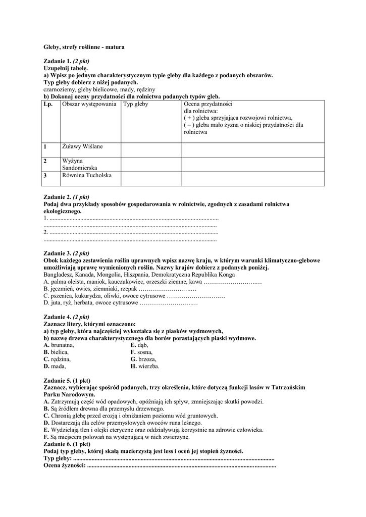Gleby, strefy roślinne - matura Zadanie 1. (2 pkt) Uzupełnij tabelę. a) Wpisz po jednym charakterystycznym typie gleby dla każdego z podanych obszarów. Typ gleby dobierz z niżej podanych. czarnoziemy, gleby bielicowe, mady, rędziny b) Dokonaj oceny przydatności dla rolnictwa podanych typów gleb. Obszar występowania Typ gleby Ocena przydatności Lp. dla rolnictwa: ( + ) gleba sprzyjająca rozwojowi rolnictwa, ( – ) gleba mało żyzna o niskiej przydatności dla rolnictwa 1 Żuławy Wiślane 2 Wyżyna Sandomierska Równina Tucholska 3 Zadanie 2. (1 pkt) Podaj dwa przykłady sposobów gospodarowania w rolnictwie, zgodnych z zasadami rolnictwa ekologicznego. 1. .............................................................................................................. ................................................................................................................. 2. .............................................................................................................. ................................................................................................................. Zadanie 3. (2 pkt) Obok każdego zestawienia roślin uprawnych wpisz nazwę kraju, w którym warunki klimatyczno-glebowe umożliwiają uprawę wymienionych roślin. Nazwy krajów dobierz z podanych poniżej. Bangladesz, Kanada, Mongolia, Hiszpania, Demokratyczna Republika Konga A. palma oleista, maniok, kauczukowiec, orzeszki ziemne, kawa ………………….….… B. jęczmień, owies, ziemniaki, rzepak ………………….….… C. pszenica, kukurydza, oliwki, owoce cytrusowe ………………….….… D. juta, ryż, herbata, owoce cytrusowe ………………….….… Zadanie 4. (2 pkt) Zaznacz litery, którymi oznaczono: a) typ gleby, która najczęściej wykształca się z piasków wydmowych, b) nazwę drzewa charakterystycznego dla borów porastających piaski wydmowe. A. brunatna, E. dąb, B. bielica, F. sosna, C. rędzina, G. brzoza, D. mada, H. wierzba. Zadanie 5. (1 pkt) Zaznacz, wybierając spośród podanych, trzy określenia, które dotyczą funkcji lasów w Tatrzańskim Parku Narodowym. A. Zatrzymują część wód opadowych, opóźniają ich spływ, zmniejszając skutki powodzi. B. Są źródłem drewna dla przemysłu drzewnego. C. Chronią glebę przed erozją i obniżaniem poziomu wód gruntowych. D. Dostarczają dla celów przemysłowych owoców runa leśnego. E. Wydzielają tlen i olejki eteryczne oraz oddziaływują korzystnie na zdrowie człowieka. F. Są miejscem polowań na występującą w nich zwierzynę. Zadanie 6. (1 pkt) Podaj typ gleby, której skałą macierzystą jest less i oceń jej stopień żyzności. Typ gleby: ................................................................................................................................... Ocena żyzności: ........................................................................................................................... Zadanie 7. (3pkt) Uzupełnij brakujące elementy tabeli ilustrującej współzależność elementów środowiska. Wykorzystaj niżej zamieszczone dane. Klimat Gleby Roślinność step subpolarny lasy dębowe i makia Klimat: zwrotnikowy suchy, umiarkowany ciepły suchy, podzwrotnikowy śródziemnomorski Roślinność: tajga, tundra Gleby: bielicowe, tundrowe, cynamonowe, czarnoziem Zadanie 8. (6 pkt) Na profilach glebowych przedstawiono pięć typów gleb występujących w Polsce. Źródło: A. Żołnierz, Typy gleb, Geografia w Szkole 3/83 Oznaczenia poziomów glebowych: A0 - poziom ściółki leśnej, A1 - poziom akumulacyjny próchnicy, A2 - poziom wymywania, B - poziom wmywania, (B) - poziom brunatnienia, C - skała macierzysta. Oznaczenia barw podane w nawiasach: bi . białawy, p . popielaty, bsz . brunatnoszary, b - brunatny, br - brunatnordzawy, cz - czarny, csz . ciemnoszary, sz . szary. Na podstawie zamieszczonych profili glebowych i własnej wiedzy uzupełnij tabelę. Przydatność rolniczą gleb określ w skali ocen: niska, średnia, wysoka, bardzo wysoka. Numer profilu Typ gleby Podłoże geologiczne Przydatność rolnicza glebowego (skały) brunatna wapienie bielicowa less Zadanie 9. (3 pkt) Wybierając z podanych przykładów, uzupełnij tabelę, wpisując: literę oznaczajacą właściwy typ gleby, jej charakterystykę i obszar występowania. Typy gleb: a) bielicoziemne, b) brunatnoziemne, c) czarnoziemne. Charakterystyka gleb: A. Cechuje ja czerwona barwa całego profilu. Poziom próchniczny o małej miąższości mimo dużego przyrostu masy roślinnej; wykorzystywane pod uprawę np. kawy, trzciny cukrowej. B. Mają dobrze rozwinięty poziom próchniczny, dużą żyzność, powstają na skałach zawierających węglan wapnia, w lecie wymagają nawodnień; wykorzystywane do uprawy winnej latorośli, owoców cytrusowych. C. Dobrze wykształcony poziom próchniczny o dużej miąższości dochodzący do 1 m, bardzo zasobne w składniki pokarmowe, powstają na skałach zawierających związki wapnia, głównie na podłożu lessowym; wykorzystywane do uprawy np.: pszenicy, buraków cukrowych. Obszary występowania: a) Nizina Zachodniosyberyjska, b) Indonezja, c) Nizina Francuska. Lp. Typ gleby Charakterystyka typu gleby 1 W profilu wyróżnia się: poziom próchniczny słabo wykształcony o jasnej barwie, poziom wymycia, rdzawy poziom wmycia; powstają w środowisku kwaśnym, na piaskach i żwirach; ze względu na małą żyzność często porastają je lasy iglaste. 2 3 Przykładowy obszar występowania Prerie amerykańskie Czerwone Gleby laterytowe Zadanie 10. (1 pkt) Podkreśl dwa regiony (spośród wymienionych), które charakteryzują się stosunkowo dużym udziałem żyznych gleb w Polsce. Pojezierze Lubuskie, Nizina Podlaska, Kujawy, Polesie Lubelskie, Wyżyna Sandomierska, Wyżyna Lubelska, Wyżyna Śląska, Nizina Mazowiecka. Zadanie 11. (2 pkt) Na podstawie danych zawartych w tabeli scharakteryzuj i oceń: a) strukturę wartości użytkow