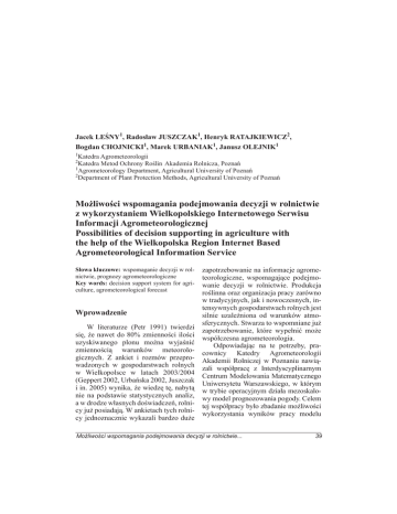 Jacek LEŚNY1, Radosław JUSZCZAK1, Henryk RATAJKIEWICZ2, Bogdan CHOJNICKI1, Marek URBANIAK1, Janusz OLEJNIK1 1 Katedra Agrometeorologii Katedra Metod Ochrony Roślin Akademia Rolnicza, Poznań 1 Agrometeorology Department, Agricultural University of Poznań 2 Department of Plant Protection Methods, Agricultural University of Poznań 2 Możliwości wspomagania podejmowania decyzji w rolnictwie z wykorzystaniem Wielkopolskiego Internetowego Serwisu Informacji Agrometeorologicznej Possibilities of decision supporting in agriculture with the help of the Wielkopolska Region Internet Based Agrometeorological Information Service Słowa kluczowe: wspomaganie decyzji w rolnictwie, prognozy agrometeorologiczne Key words: decision support system for agriculture, agrometeorological forecast Wprowadzenie W literaturze (Petr 1991) twierdzi się, że nawet do 80% zmienności ilości uzyskiwanego plonu można wyjaśnić zmiennością warunków meteorologicznych. Z ankiet i rozmów przeprowadzonych w gospodarstwach rolnych w Wielkopolsce w latach 2003/2004 (Geppert 2002, Urbańska 2002, Juszczak i in. 2005) wynika, że wiedzę tę, nabytą nie na podstawie statystycznych analiz, a w drodze własnych doświadczeń, rolnicy już posiadają. W ankietach tych rolnicy jednoznacznie wykazali bardzo duże zapotrzebowanie na informacje agrometeorologiczne, wspomagające podejmowanie decyzji w rolnictwie. Produkcja roślinna oraz organizacja pracy zarówno w tradycyjnych, jak i nowoczesnych, intensywnych gospodarstwach rolnych jest silnie uzależniona od warunków atmosferycznych. Stwarza to wspomniane już zapotrzebowanie, które wypełnić może współczesna agrometeorologia. Odpowiadając na te potrzeby, pracownicy Katedry Agrometeorologii Akademii Rolniczej w Poznaniu nawiązali współpracę z Interdyscyplinarnym Centrum Modelowania Matematycznego Uniwersytetu Warszawskiego, w którym w trybie operacyjnym działa mezoskalowy model prognozowania pogody. Celem tej współpracy było zbadanie możliwości wykorzystania wyników pracy modelu Możliwości wspomagania podejmowania decyzji w rolnictwie... 39 do stworzenia serwisu informacji agrometeorologicznej. Praktycznym efektem podjętych działań był projekt finansowany przez KBN „Zastosowanie cyfrowych prognoz pogody do konstrukcji lokalnych prognoz agrometeorologicznych oraz ocena jakości ich aplikacji w agrometeorologicznej osłonie rolnictwa” (Projekt KBN Nr 3P06R 013 25), realizowany w Katedrze Agrometeorologii AR Poznań. Wynikiem realizacji projektu jest Wielkopolski Internetowy Serwis Informacji Agrometeorologicznej (WISIA). Prace nad określeniem konsekwencji wpływu warunków meteorologicznych na wzrost, rozwój i plonowanie roślin uprawnych, jak również na prawdopodobieństwo wystąpienia określonych chorób i szkodników roślin prowadzone są na całym świecie od dawna, ale rozwój nauki i techniki sprawia, że ich wyniki są ciągle doskonalone i coraz efektywniej stosowane w praktyce (Hoogenboom 2000, Strand 2000, Rijks i Baradas 2000, Stigter i in. 2000, Weiss i in. 2000). Serwis WISIA został skierowany do rolników gospodarujących na terenie województwa wielkopolskiego, południowo-zachodniej i centralnej części województwa kujawsko-pomorskiego, południowo-wschodniej części województwa zachodniopomorskiego, zachodniej części województwa lubuskiego i północnej części województwa dolnośląskiego. W serwisie udostępniana jest 60-godzinna prognoza meteorologiczna (przygotowywana przez ICM UW) oraz wiele informacji o charakterze zaleceń dla rolników wygenerowanych na podstawie wspomnianej prognozy pogody i danych pochodzących z trzech automatycznych stacji meteorologicznych umiejscowio40 nych wśród pól uprawnych w krajobrazie typowym dla Wielkopolski. Tego typu zestaw informacji składa się na prognozę agrometeorologiczną, zawierającą następujące elementy: prognozy sum wartości temperatury efektywnej i wyznaczonych na ich podstawie terminów pojawienia się szkodników roślin uprawnych i sadowniczych; opady – suma dobowa i opad kumulowany; ewapotranspiracja potencjalna i rzeczywista, klimatyczny bilans wodny; sygnalizacja występowania rosy; promieniowanie całkowite i usłonecznienie; warunki wykonywania zabiegów chemicznej ochrony roślin oraz sygnalizacja zarazy ziemniaka (przygotowywana przez IUNG Puławy). Wszystkie informacje są przygotowywane dla każdego z punktów siatki funkcjonowania modelu pogody, co w praktyce oznacza rozdzielczość gminy. Dodatkowo dzięki uprzejmości Deutscher Wetterdienst Agrometeorologische Forschung Braunschweig (DWD AMF) w serwisie udostępniana jest prognoza agrometeorologiczna tej instytucji, ale już tylko dla okolic Poznania. Ponadto jako uzupełnienie powyższych informacji zamieszczone są opisy metodyki tworzenia prognoz agrometeorologicznych oraz bogata baza stron internetowych, zawierająca najważniejsze serwisy meteorologiczne i rolnicze w Polsce i Europie. Serwis WISIA dostępny jest bezpłatnie na stronie www.agrometeo.pl od początku 2006 roku (wówczas tylko w ograniczonym zakresie). W niniejszym artykule przedstawiono najważniejsze informacje udostępniane w serwisie w kontekście możliwości ich praktycznego wykorzystywania w rolnictwie, a przede wszystkim w organizacji prac w gospodarstwach rolnych. J. Leśny i in. Informacje wykorzystywane do tworzenia serwisu WISIA meteorologicznych z wartościami pomierzonymi. Otrzymano stosunkowo dużą sprawdzalność prognoz generowaJednym z kluczowych elementów nych przez model UMPL (Lubik 2003, wykorzystywanych w przygotowaniu Leśny i in. 2004, Juszczak i in. 2005). Kolejnym, istotnym elementem syinformacji agrometeorologicznych jest prognoza pogody. Przy czym bardzo stemu wspomagającego decyzje w rolistotne jest, aby wykorzystywana pro- nictwie są pomierzone dane meteorognoza była dostępna w formie numerycz- logiczne, a w szczególności sposób ich nej, ponieważ tylko wówczas może ona ud