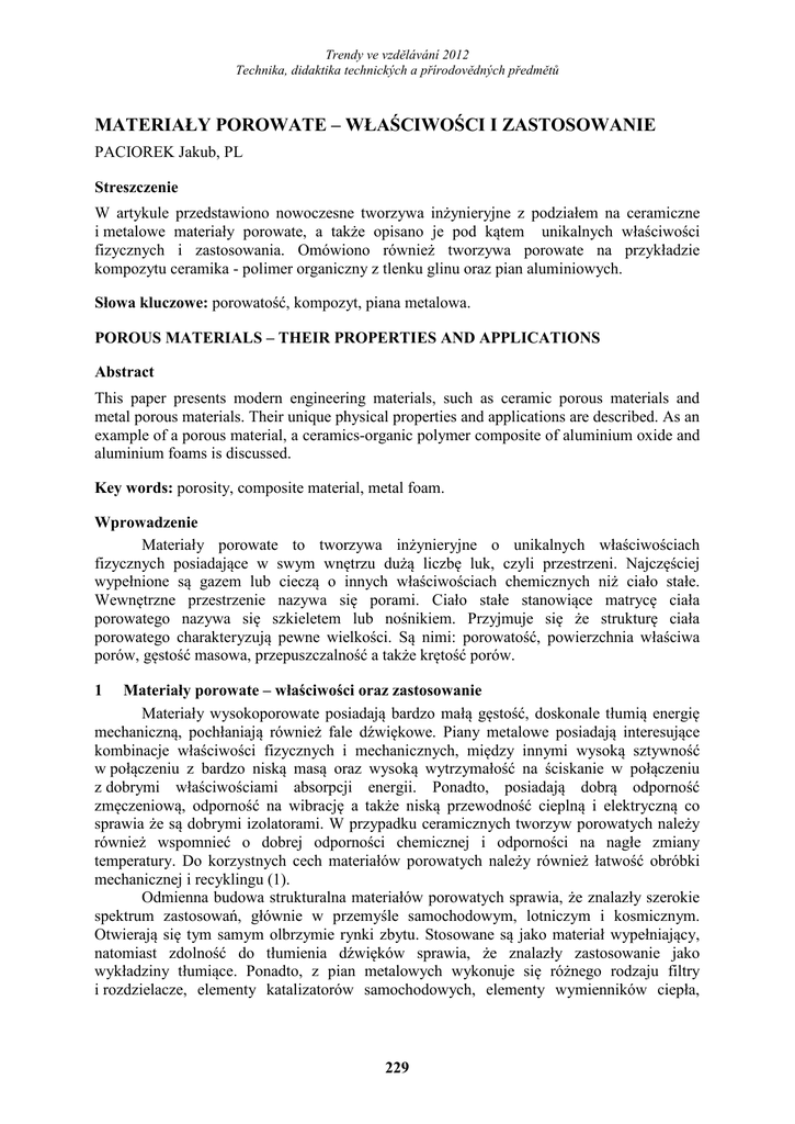 Trendy ve vzdělávání 2012 Technika, didaktika technických a přírodovědných předmětů MATERIAŁY POROWATE – WŁAŚCIWOŚCI I ZASTOSOWANIE PACIOREK Jakub, PL Streszczenie W artykule przedstawiono nowoczesne tworzywa inżynieryjne z podziałem na ceramiczne i metalowe materiały porowate, a także opisano je pod kątem unikalnych właściwości fizycznych i zastosowania. Omówiono również tworzywa porowate na przykładzie kompozytu ceramika - polimer organiczny z tlenku glinu oraz pian aluminiowych. Słowa kluczowe: porowatość, kompozyt, piana metalowa. POROUS MATERIALS – THEIR PROPERTIES AND APPLICATIONS Abstract This paper presents modern engineering materials, such as ceramic porous materials and metal porous materials. Their unique physical properties and applications are described. As an example of a porous material, a ceramics-organic polymer composite of aluminium oxide and aluminium foams is discussed. Key words: porosity, composite material, metal foam. Wprowadzenie Materiały porowate to tworzywa inżynieryjne o unikalnych właściwościach fizycznych posiadające w swym wnętrzu dużą liczbę luk, czyli przestrzeni. Najczęściej wypełnione są gazem lub cieczą o innych właściwościach chemicznych niż ciało stałe. Wewnętrzne przestrzenie nazywa się porami. Ciało stałe stanowiące matrycę ciała porowatego nazywa się szkieletem lub nośnikiem. Przyjmuje się że strukturę ciała porowatego charakteryzują pewne wielkości. Są nimi: porowatość, powierzchnia właściwa porów, gęstość masowa, przepuszczalność a także krętość porów. Materiały porowate – właściwości oraz zastosowanie Materiały wysokoporowate posiadają bardzo małą gęstość, doskonale tłumią energię mechaniczną, pochłaniają również fale dźwiękowe. Piany metalowe posiadają interesujące kombinacje właściwości fizycznych i mechanicznych, między innymi wysoką sztywność w połączeniu z bardzo niską masą oraz wysoką wytrzymałość na ściskanie w połączeniu z dobrymi właściwościami absorpcji energii. Ponadto, posiadają dobrą odporność zmęczeniową, odporność na wibrację a także niską przewodność cieplną i elektryczną co sprawia że są dobrymi izolatorami. W przypadku ceramicznych tworzyw porowatych należy również wspomnieć o dobrej odporności chemicznej i odporności na nagłe zmiany temperatury. Do korzystnych cech materiałów porowatych należy również łatwość obróbki mechanicznej i recyklingu (1). Odmienna budowa strukturalna materiałów porowatych sprawia, że znalazły szerokie spektrum zastosowań, głównie w przemyśle samochodowym, lotniczym i kosmicznym. Otwierają się tym samym olbrzymie rynki zbytu. Stosowane są jako materiał wypełniający, natomiast zdolność do tłumienia dźwięków sprawia, że znalazły zastosowanie jako wykładziny tłumiące. Ponadto, z pian metalowych wykonuje się różnego rodzaju filtry i rozdzielacze, elementy katalizatorów samochodowych, elementy wymienników ciepła, 1 229 Trendy ve vzdělávání 2012 Technika, didaktika technických a přírodovědných předmětů a także różnego rodzaju maty. Właściwości materiałów o strukturze komórkowej ukierunkowują ich zastosowanie w programach kosmicznych, wykorzystywane są do budowy elementów rakiet i silników odrzutowych. Materiały porowate znalazły dość szerokie zastosowanie jako elementy stref zgniotu w pojazdach samochodowych, a także w lekkich i sztywnych konstrukcjach mechanicznych i budowlanych (2). Ceramiczne materiały porowate Ceramiczne materiały porowate to tworzywa, które w swojej objętości zawierają puste przestrzenie zwane porami, a ich objętość wynosi od 20 do ponad 90%. Projektowanie ceramicznych materiałów porowatych jest bardzo złożonym zagadnieniem, a ich przyszłe zastosowanie i warunki pracy są ściśle związane z wyborem surowców i parametrów technologicznych. O właściwościach ceramicznych tworzyw porowatych decydują: wielkość i kształt ziarna, skład i ilość dodanego spoiwa a także ciśnienie prasowania oraz temperatura i czas prasowania (3). Porowate tworzywa ceramiczne otrzymywane metodą osadzania ceramicznej masy lejnej na podłożu polimerowym od lat wykorzystywane są jako biomateriały i znajdują rosnące zastosowanie w medycynie. Ceramika porowata zaprojektowana na wzór struktury kości służy do wykonywania implantów ortopedycznych w chirurgii kostnej. Pory porowatego tworzywa ceramicznego wypełnione biodegradowalnym polimerem, na przykład laktydem, po wszczepieniu do żywego organizmu, w miarę stopniowej degradacji polimeru w organizmie, mogą przerastać tkanką biologiczną, doskonale zastępującą naturalną kość. Wysokoporowate materiały ceramiczne wytwarzane metodą spieniania są doskonałym podłożem dla katalizatorów w urządzeniach dla katalitycznego dopalania spalin silników samochodowych. Materiały takie mogą być również stosowane do filtracji lub wydzielania z cieczy lub gazów odpowiednich związków, na przykład witamin czy enzymów. Intensywne prace badawcze prowadzone są nad ceramicznymi membranami filtracyjnymi stosowanymi do mikro- i ultrafiltracji, jak również odwróconej osmozy (4). 2 2.1 Kompozyty ceramika – polimer organiczny W celu otrzymania porowatego tworzywa ceramicznego z tlenku glinu stosuje się metodę osadzania ceramicznej masy lejnej na podłożu polimerowym. Do sporządzenia mas lejnych używa się akrylopochodnych spoiw wodorozcienczalnych. W charakterze podłoża polimerowego stosuje się gąbkę poliuretanową o określonej gęstości i wielkości porów. Otrzymuje się w ten sposób tworzywo porowate na bazie którego sporządza się kompozyt ceramika – polimer organiczny. Polimerem wprowadzanym do wnętrza porów porowatego materiału ceramicznego jest poli (metakrylan metylu). Ceramiczne tworzywo porowate z tlenku glinu otrzymuje się metodą biomimetyczną odwzorowania struktur