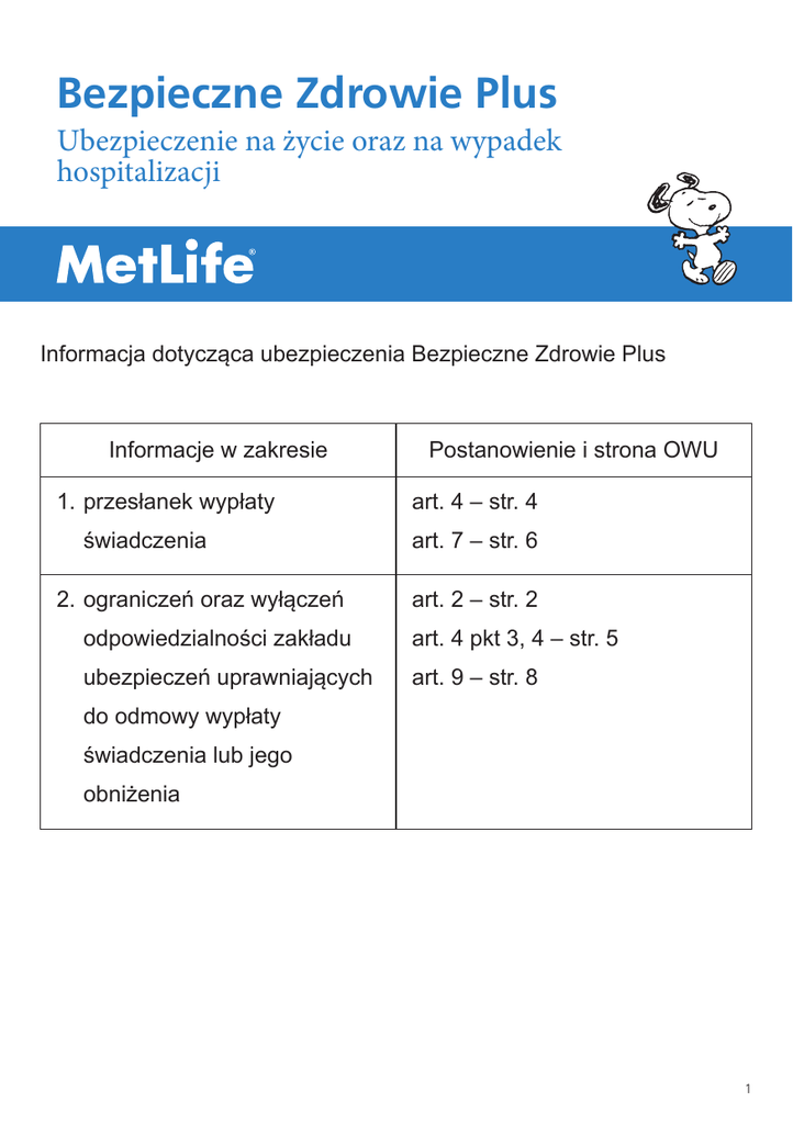 Bezpieczne Zdrowie Plus Ubezpieczenie na życie oraz na wypadek hospitalizacji Informacja dotycząca ubezpieczenia Bezpieczne Zdrowie Plus Informacje w zakresie 1.przesłanek wypłaty świadczenia 2.ograniczeń oraz wyłączeń Postanowienie i strona OWU art. 4 – str. 4 art. 7 – str. 6 art. 2 – str. 2 odpowiedzialności zakładu art. 4 pkt 3, 4 – str. 5 ubezpieczeń uprawniających art. 9 – str. 8 do odmowy wypłaty świadczenia lub jego obniżenia 1 Bezpieczne Zdrowie Plus Ogólne Warunki Ubezpieczenia nr 8001ST16 Znajdujące się w ramkach w treści OWU komentarze i wyjaśnienia nie stanowią treści OWU. Pełnią one jedynie funkcję informacyjną. POMOC Szanowni Państwo, w ramkach umieszczonych w treści OWU pojawiają się nasze komentarze zawierające podsumowanie najistotniejszych zagadnień. Mamy nadzieję, że SNOOPY – ambasador marki MetLife przybliży i objaśni Państwu trudne sformułowania użyte w OWU. Dodatkowo, słowa wyróżnione kursywą zostały zdefiniowane na początku dokumentu. Dla Państwa wygody wprowadziliśmy trzy rodzaje wyróżnień: WAŻNE Zwracamy Państwa uwagę na kluczowe kwestie dotyczące Umowy. WYJAŚNIENIA Objaśniamy niektóre postanowienia Umowy oraz trudne sformułowania użyte w treści OWU. PRZYKŁADY Wyjaśniamy, jak w praktyce stosowane są postanowienia Umowy i jakie mają znaczenie dla osoby objętej ubezpieczeniem. Drawn by LoBianco Studios for Life Advice "Protecting Your Child" Brochure 4/97 ARTYKUŁ 1. WSTĘP Niniejsze Ogólne Warunki Ubezpieczenia (dalej OWU) mają zastosowanie do Umowy Ubezpieczenie na życie oraz na wypadek hospitalizacji zawartej pomiędzy Towarzystwem a Ubezpieczonym i stanowią integralną część tej Umowy. ARTYKUŁ 2. DEFINICJE Definicje określeń użytych w niniejszych OWU: 1. Abonent mobilnej sieci Orange – osoba fizyczna, która jest stroną zawartej z Operatorem Umowy o świadczenie usług telekomunikacyjnych i która korzysta z usług Operatora w mobilnej sieci Orange w celu niezwiązanym bezpośrednio z jej działalnością gospodarczą lub zawodową (konsument), 2. Abonent stacjonarnej sieci Orange – osoba fizyczna, która jest stroną zawartej z Operatorem Umowy o świadczenie usług telekomunikacyjnych i która korzysta z usług Operatora w stacjonarnej sieci Orange w celu niezwiązanym bezpośrednio z jej działalnością gospodarczą lub zawodową (konsument), 3.choroba – reakcja organizmu na działanie czynnika chorobotwórczego lub urazu, prowadząca do zaburzeń czynnościowych, zmian organicznych w tkankach, narządach, układach lub całym ustroju, 4. data zawarcia Umowy – data opłacenia pierwszej składki, 5. dzień hospitalizacji – każdy dzień kalendarzowy, w którym Ubezpieczony podlegał hospitalizacji, WYJAŚNIENIE: Pierwszym dniem hospitalizacji jest dzień przyjęcia do szpitala, niezależnie od tego, o której godzinie przyjęcie nastąpiło. Natomiast ostatnim dniem hospitalizacji jest dzień wypisu ze szpitala. Jeżeli Ubezpieczony został przyjęty do szpitala w poniedziałek o godzinie 17, a został wypisany w czwartek o godzinie 10 w tym samym tygodniu, to hospitalizacja trwała 4 dni. 6. dzień roboczy – każdy dzień od poniedziałku do piątku włącznie, z wyłączeniem dni wolnych od pracy, zgodnie z Ustawą z dnia 18 stycznia 1951 r. o dniach wolnych od pracy (Dz.U. z 1951 r. Nr 4, poz. 28 z późn. zm.) oraz dni wolnych od pracy ustanowionych przez Zarząd Operatora, 7.hospitalizacja – pobyt w szpitalu służący zachowaniu, przywracaniu lub poprawie zdrowia chorych na zlecenie lekarza. Hospitalizacją nie jest w rozumieniu niniejszych OWU pobyt w szpitalu w celach opiekuńczych, pielęgnacyjnych, paliatywnych, hospicyjnych, z zakresu opieki długoterminowej, rehabilitacji, leczenia uzależnień, psychiatrycznej opieki zdrowotnej oraz lecznictwa uzdrowiskowego, 2 Bezpieczne Zdrowie Plus 8. Infolinia MetLife – telefoniczne centrum obsługi Klienta, odpowiedzialne za obsługę Umowy. Podmiotem odpowiedzialnym za prowadzenie Infolinii MetLife może być osoba trzecia działająca na zlecenie Towarzystwa, WYJAŚNIENIE: W przypadku jakichkolwiek pytań dotyczących Umowy prosimy o kontakt z Infolinią MetLife pod numerem (+48) 22 558 00 48 (koszt połączenia zgodny z taryfą operatora). 9. mobilna sieć Orange – ruchoma publiczna sieć telekomunikacyjna wykorzystująca między innymi takie standardy jak GSM 900/1800 lub UMTS, obsługiwana przez Operatora, 10.niepoczytalność – utrata przez Ubezpieczonego możliwości kierowania swoim postępowaniem wskutek choroby psychicznej, niedorozwoju umysłowego albo innego rodzaju zaburzeń psychicznych, w szczególności alkoholizmu lub narkomanii, potwierdzona prawomocnym orzeczeniem sądu o całkowitym lub częściowym ubezwłasnowolnieniu Ubezpieczonego, 11.nieszczęśliwy wypadek (NW) – niezależne od woli Ubezpieczonego, gwałtowne i nagłe zdarzenie wywołane przyczyną zewnętrzną, niezwiązane z jakimkolwiek istniejącym stanem chorobowym, WAŻNE: Prosimy o zwrócenie uwagi, iż zdarzenia takie jak zawał serca, udar lub wylew nie są wywołane przyczyną zewnętrzną, a zatem nie są nieszczęśliwym wypadkiem w rozumieniu Umowy. Drawn by LoBianco Studios for Life Advice "Protecting Your Child" Brochure 4/97 Pierwszy 12.okres obowiązywania Umowy – okres, na który Umowa zostaje zawarta lub przedłużona. okres obowiązywania Umowy trwa od daty zawarcia Umowy do ostatniego dnia okresu rozliczeniowego rozpoczynającego się po dacie zawarcia Umowy. Każdy kolejny okres obowiązywania Umowy odpowiada kolejnemu okresowi rozliczeniowemu, 13. okres rozliczeniowy – okres, za który dokonywane są rozliczenia zobowiązań Abonenta mobilnej lub stacjonarnej sieci Orange wobec Operatora z tytułu świadczonych usług telekomunikacyjnych, 14.Operator – Orange Polska Spółka Akcyjna z siedzibą i adresem w Warszawie (02-326) przy Al. Jerozolimskich 160, wpisana do Rejestru Przedsiębiorców pr