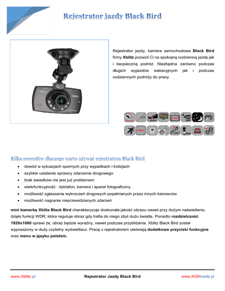 Rejestrator jazdy, kamera samochodowa Black Bird firmy Xblitz pozwoli Ci na spokojną codzienną jazdę jak i bezpieczną podróż. Niezbędna zarówno podczas długich wyjazdów wakacyjnych jak i podczas codziennych podróży do pracy. dowód w sytuacjach spornych przy wypadkach i kolizjach szybkie ustalenie sprawcy zdarzenia drogowego brak świadków nie jest już problemem wielofunkcyjność : dyktafon, kamera i aparat fotograficzny możliwość zgłaszania wykroczeń drogowych popełnianych przez innych kierowców możliwość nagrania nieprzewidzianych zdarzeń mini kamerkę Xblitz Black Bird charakteryzuje doskonała jakość obrazu nawet przy dużym naświetleniu dzięki funkcji WDR, która reguluje obraz gdy trafia do niego zbyt dużo światła. Ponadto rozdzielczość 1920x1080 sprawi że, obraz będzie wyraźny, nawet podczas przybliżania. Xblitz Black Bird został wyposażony w duży czytelny wyświetlacz. Pracę z rejestratorem ułatwiają dodatkowe przyciski funkcyjne oraz menu w języku polskim. www.Xblitz.pl Rejestrator Jazdy Black Bird www.KGKtrade.pl Wysoka rozdzielczość obrazu wideo – FULL HD 1920x1080p przy 30 klatkach/sek, zarejestrowany obraz można wygodnie odtwarzać nawet na telewizorach o wysokiej przekątnej obrazu. Funkcja WDR (Wide Dynamic Range) – dzięki użyciu odpowiednich algorytmów do analizy naświetlenia obrazu oraz na dynamicznej zmianie wartości niedoświetlonych i prześwietlonych pikseli rejestrowanych scen w celu uwidocznienia na obrazie niedoświetlonych elementów. Dzięki temu mamy możliwość dokładnej rejestracji sceny mimo dużego kontrastu. Solidny uchwyt samochodowy – kamera posiada stabilny i wygodny system mocowania do szyby pojazdu. Mocna przyssawka pozwala na pewny i trwały montaż kamery w aucie. Wbudowany mikrofon – bardzo czuły, rejestruje dźwięk wewnątrz auta, można wyłączyć funkcję zapisu dźwięku. Wbudowany głośnik – sygnalizacja dźwiękowa wciskanych klawiszy, odtwarzanie zarejestrowanych filmów z dźwiękiem. Tryb kamery internetowej – rejestrator można wykorzystać jako prostą kamerkę internetową podczas wideo-rozmów (np. Skype), po podłączeniu przewodem USB do komputera/laptopa. Tryb pamięci masowej – rejestrator z zainstalowaną wewnątrz kartą pamięci po podłączeniu przewodem USB do laptopa można wykorzystać jako przenośny dysk. W tym trybie można również skopiować pliki wideo oraz zdjęcia z karty pamięci na dysk twardy komputera / laptopa. www.Xblitz.pl Rejestrator Jazdy Black Bird www.KGKtrade.pl Nagrywanie cykliczne – jedna z głównych i najważniejszych cech rejestratorów samochodowych, włączenie tej funkcji pozwala ustawić długość nagrywanych pojedynczych materiałów wideo (2min, 3 min, 5 min). Wyłączenie tej opcji spowoduje rejestrację ciągłą materiału wideo (nie zaleca się), jednak należy pamiętać, że maksymalna długość filmu jest ograniczona wielkością pliku 2GB wynikającą z ograniczeń formatu plików. Typ obsługiwanych kart pamięci – Trans Flash czyli popularne karty micro SD stosowane także w telefonach komórkowych. Zaleca się używanie kart klasy 10, maksymalna obsługiwana pojemność to aż 32GB. Wbudowana bateria – zastosowana bateria wewnętrzna (niewymienna) posiada niewielką pojemność, służy ona do zapewnienia zasilania przez kilka minut po wyłączeniu zapłonu. Materiały – wysokiej jakości, trwała i odporna metalowa obudowa, wykonana ze stopów magnezu, aluminiowe wykończenie. Funkcja SOS – automatyczne zabezpieczanie aktualnie nagrywanego pliku przed nadpisaniem lub przypadkowym usunięciem, uruchamiane poprzez naciśnięcie odpowiedniego klawisza. Zoom cyfrowy – 4-krotne cyfrowe zbliżenie obrazu (należy go ustawić przed rozpoczęciem ngarywania). G-sensor – jest to czujnik grawitacyjny, służy on do wykrywania zderzenia lub gwałtownego hamowania. W takiej sytuacji rejestrator automatycznie zabezpieczy nagrywany aktualnie plik, aby nie został on nadpisany lub przypadkowo usunięty. Detekcja ruchu – kamera będąc w stanie czuwania analizuje obraz i jeśli wykryje nagłą zmianę obrazu (czyli ruch) to uruchamia nagrywanie, które trwa aż do ustania ruchu plus kilka sekund. Automatyczny start nagrywania – rejestrator uruchamia się automatycznie i zaczyna nagrywać w momencie włączenia zapłonu auta, oraz automatycznie się wyłączy po wyłączeniu zapłonu (z kilkusekundowym opóźnieniem). Rejestrator musi być cały czas podłączony do zasilania z gniazda zapalniczki samochodowej, oraz gniazdo zapalniczki musi być pod napięciem w momencie włączonego zapłonu. Tryb monitorowania parkingu – rejestrator w stanie czuwania w zaparkowanym aucie, w momencie wykrycia uderzenia (regulowana czułość) kamera zaczyna nagrywać. www.Xblitz.pl Rejestrator Jazdy Black Bird www.KGKtrade.pl www.Xblitz.pl Rejestrator Jazdy Black Bird www.KGKtrade.pl Xblitz BLACK BIRD Rozdzielczość WIDEO Rozdzielczość PHOTO 1920x1080p FULL HD 30kl/s1080x720p FULL HD 30kl/s 12M 4032 x 3024 24bpp Format plików wideo MOV H.264 Rozmiar wyświetlacza 2.7 cala Obrotowy wyświetlacz NIE Soczewka, optyka kąt 170 stopni Tryb nocny TAK Wbudowany mikrofon TAK Wbudowany głośnik TAK Tryb kamerki internetowej PC TAK Nagrywanie cykliczne TAK / lub nagrywanie ciągłe Typ obsługiwanych kart pamięci micro SD / 32GB max Gniazda, złącza micro SD / mini USB / AV OUT / mini HDMI Detektor ruchu TAK Automatyczny start nagrywania TAK Język menu polish, english, chinese, japan, russian, spanish, portugese, french, italian, korean, german Zasilanie bateria wbudowana / ładowarka samochodowa 12V-24V G-sensor, czujnik grawitacyjny TAK Odbiornik GPS NIE Pilot NIE Druga kamera NIE www.Xblitz.pl Rejestrator Jazdy Black Bird www.KGKtrade.pl - Xblitz Black Bird - Ładowarka samochodowa z kablem ok 3,4m - Uchwyt z przyssawką - kabel USB - Polska instrukcja obsługi www.Xblitz.pl Rejestrator Jazdy Black Bird www.KGKtrade.pl