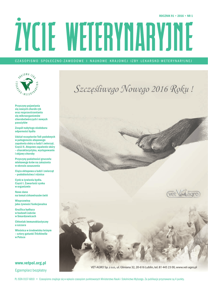 ROCZNIK 91 • 2016 • NR 1 CZASOPISMO SPOŁECZNO-ZAWODOWE I NAUKOWE KRA JOWEJ IZBY LEKARSKO-WETERYNARYJNEJ O– WETERY YJNA LEKARS AR K JOW A IZB A RA K N Przyczyny pojawiania się nowych chorób ryb oraz rozprzestrzeniania się mikroorganizmów chorobotwórczych i nowych pasożytów Zespół nabytego niedoboru odporności bydła Udział receptorów Toll-podobnych w patogenezie atopowego zapalenia skóry u ludzi i zwierząt. Część II. Atopowe zapalenie skóry – charakterystyka, występowanie i objawy choroby Przyczyny podatności gruczołu mlekowego krów na zakażenia w okresie zasuszenia Ciąża ektopowa u ludzi i zwierząt – podobieństwa i różnice Cynk w żywieniu bydła. Część I. Zawartość cynku w organizmie Nowe dane na temat cirkowirusów świń Wieprzowina jako żywność funkcjonalna Gruźlica bydlęca w hodowli żubrów w Smardzewicach Chłoniak immunoblastyczny u szczura Włośnica w środowisku leśnym – cztery gatunki Trichinella w Polsce www.vetpol.org.pl Egzemplarz bezpłatny PL ISSN 0137-6810 • Czasopismo znajduje się w wykazie czasopism punktowanych Ministerstwa Nauki i Szkolnictwa Wyższego. Za publikacje przyznawane są 4 punkty. Spis treści Działalność Krajowej Izby Lekarsko-Weterynaryjnej 2Od redakcji 4Kalendarium Krajowej Rady Lekarsko-Weterynaryjnej 5XII posiedzenie Prezydium Krajowej Rady Lekarsko-Weterynaryjnej – J. Krzemiński 7Uchwały i stanowiska Krajowej Rady Lekarsko-Weterynaryjnej U chwała nr 59/2011/V z 18 października 2011 r. w sprawie założenia i prowadzenia rejestru ukaranych lekarzy weterynarii (tekst jednolity); Uchwała nr 61/2015/VI z 10 grudnia 2015 r. w sprawie podziału kwoty stanowiącej część opłaty za wydanie dla przemieszczanych w celach niehandlowych zwierząt domowych towarzyszących podróżnym pomiędzy Krajową Izbą Lekarsko-Weterynaryjną a okręgowymi izbami lekarskoweterynaryjnymi oraz sposobu i częstotliwości przekazywania przez lekarzy weterynarii okręgowym izbom lekarsko‑weterynaryjnym kwoty stanowiącej różnicę między wysokością opłaty a wynagrodzeniem przysługującym im za wydanie paszportu; Uchwała nr 63/2015/VI z 10 grudnia 2015 r. w sprawie wprowadzenia wzorów upoważnienia do przeprowadzenia kontroli zakładu leczniczego dla zwierząt, protokołów kontroli oraz wystąpienia pokontrolnego do dobrowolnego stosowania; Uchwała nr 65/2015/VI z 10 grudnia 2015 r. w sprawie wzorcowego regulaminu zakładów leczniczych dla zwierząt i powiadomienia o zmianie regulaminu 11Pisma i opinie Krajowej Rady Lekarsko-Weterynaryjnej 13Porozumienie Wielkopolskie Sprawy społeczno-zawodowe 16Komunikat Krajowej Komisji do spraw Specjalizacji Lekarzy Weterynarii Prace poglądowe 19Przyczyny pojawiania się nowych chorób ryb oraz rozprzestrzeniania się mikroorganizmów chorobotwórczych i nowych pasożytów – J. Antychowicz 26Zespół nabytego niedoboru odporności bydła – Z. Gliński, K. Kostro 31Udział receptorów Toll-podobnych w patogenezie atopowego zapalenia skóry u ludzi i zwierząt. Część II. Atopowe zapalenie skóry – charakterystyka, występowanie i objawy choroby – M. Bossowska, K. Dembele, F.N. Toka 36Przyczyny podatności gruczołu mlekowego krów na zakażenia w okresie zasuszenia – H. Markiewicz, Z. Gajewski 39Ciąża ektopowa u ludzi i zwierząt – podobieństwa i różnice – A. Max 42Cynk w żywieniu bydła. Część I. Zawartość cynku w organizmie – A. Mirowski 44Nowe dane na temat cirkowirusów świń – M. Truszczyński, Z. Pejsak 46Wieprzowina jako żywność funkcjonalna – T. Kubiński, A. Wojtasik, E. Matczuk, E. Pietraś Prace kliniczne i kazuistyczne 50Gruźlica bydlęca w hodowli żubrów w Smardzewicach – M. Krajewska, B. Orłowska, K. Anusz, M. Welz, W. Bielecki, M. Wojciechowska, M. Lipiec, K. Szulowski 53Chłoniak immunoblastyczny u szczura – R. Sapierzyński Historia żywności i pasz 55Włośnica w środowisku leśnym – cztery gatunki Trichinella w Polsce – J. Gawor Historia weterynarii 58Pomór świń w Polsce w okresie międzywojennym – J. Wnęk 62Leki Miscellanea 64Parazytolodzy z SGGW rozwijają laboratoria w Tanzanii – M. Klockiewicz 66Jubileusz gdańskiej weterynarii – M. Kamionowski 67Zjazd rocznika 1964–1970 Wydziału Weterynaryjnego we Wrocławiu – A. Dudziński 68Pieszy Maraton Górski Izby Opolskiej – M. Wisła 69Jubileuszowa XX „Pejsakówka” w Puławach – P. Kneblewski Recenzje 71Włodzimierz Andrzej Gibasiewicz: Okruchy godnego życia – J. Tropiło, P. Sysa 72Grzegorz Domański: Zapiski (nie)ludzkiego lekarza – J. Kita CZASOPISMO SPOŁECZNO-ZAWODOWE I NAUKOWE K R A J O W E J I Z B Y L E K A R S K O - W E T E R Y N A R YJ N E J ROCZNIK 91 • 2016 • NR 1 Komitet Redakcyjny: Antoni Schollenberger (redaktor naczelny), Danuta Trafalska (sekretarz redakcji), Joanna Czarnecka (redakcja techniczna). Rada Programowa: prof. dr hab. Stanisław Winiarczyk – przewodniczący, dr hab. Łukasz Adaszek, prof. dr Alfonso Carbonero‑Martinez (Hiszpania), prof. dr hab. Beata Cuvelier-Mizak, prof. dr Antoni Gamota (Ukraina), prof. dr Ignacio García-Bocanegra (Hiszpania), lek. wet. Maciej Gogulski, prof. dr hab. Zbigniew Grądzki, lek. wet. Tomasz Grupiński, prof. dr Marian Horzinek (Holandia), prof. dr hab. Tomasz Janowski, prof. dr hab. Andrzej Koncicki, prof. dr hab. Roman Lechowski, lek. wet. Andrzej Lisowski, lek. wet. Wiesław Łada, lek. wet. Jacek Mamczur, prof. dr Karin Möstl (Austria), prof. dr hab. Wojciech Niżański, prof. dr hab. Jacek Osek, prof. dr hab. Urszula Pasławska, prof. dr hab. Zygmunt Pejsak, dr hab. Jarosław Popiel, lek. wet. Marek Radzikowski, prof. dr hab. Tadeusz Rotkiewicz, prof. dr hab. Piotr Silmanowicz, prof. dr Vasyl Stefanyk (Ukraina), prof. dr hab. Paweł Sysa, prof. dr hab. Józef Szarek, prof. dr hab. Piotr Szeleszczuk, lek. wet. Zbigniew Wróblewski, dr n. wet. Jan Żelazny. Prace poglądowe, prace kliniczno-kazuistyczne i dotyczące leków są recenzowane. Redakcja 
