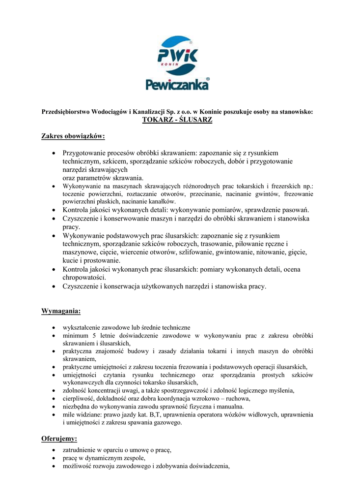Przedsiębiorstwo Wodociągów i Kanalizacji Sp. z o.o. w Koninie poszukuje osoby na stanowisko: TOKARZ - ŚLUSARZ Zakres obowiązków: Przygotowanie procesów obróbki skrawaniem: zapoznanie się z rysunkiem technicznym, szkicem, sporządzanie szkiców roboczych, dobór i przygotowanie narzędzi skrawających oraz parametrów skrawania. Wykonywanie na maszynach skrawających różnorodnych prac tokarskich i frezerskich np.: toczenie powierzchni, roztaczanie otworów, przecinanie, nacinanie gwintów, frezowanie powierzchni płaskich, nacinanie kanałków. Kontrola jakości wykonanych detali: wykonywanie pomiarów, sprawdzenie pasowań. Czyszczenie i konserwowanie maszyn i narzędzi do obróbki skrawaniem i stanowiska pracy. Wykonywanie podstawowych prac ślusarskich: zapoznanie się z rysunkiem technicznym, sporządzanie szkiców roboczych, trasowanie, piłowanie ręczne i maszynowe, cięcie, wiercenie otworów, szlifowanie, gwintowanie, nitowanie, gięcie, kucie i prostowanie. Kontrola jakości wykonanych prac ślusarskich: pomiary wykonanych detali, ocena chropowatości. Czyszczenie i konserwacja użytkowanych narzędzi i stanowiska pracy. Wymagania: wykształcenie zawodowe lub średnie techniczne minimum 5 letnie doświadczenie zawodowe w wykonywaniu prac z zakresu obróbki skrawaniem i ślusarskich, praktyczna znajomość budowy i zasady działania tokarni i innych maszyn do obróbki skrawaniem, praktyczne umiejętności z zakresu toczenia frezowania i podstawowych operacji ślusarskich, umiejętności czytania rysunku technicznego oraz sporządzania prostych szkiców wykonawczych dla czynności tokarsko ślusarskich, zdolność koncentracji uwagi, a także spostrzegawczość i zdolność logicznego myślenia, cierpliwość, dokładność oraz dobra koordynacja wzrokowo – ruchowa, niezbędna do wykonywania zawodu sprawność fizyczna i manualna. mile widziane: prawo jazdy kat. B,T, uprawnienia operatora wózków widłowych, uprawnienia i umiejętności z zakresu spawania gazowego. Oferujemy: zatrudnienie w oparciu o umowę o pracę, pracę w dynamicznym zespole, możliwość rozwoju zawodowego i zdobywania doświadczenia, Osoby zainteresowane ofertą i spełniające powyższe wymagania prosimy o przesłanie CV ze zdjęciem, listu motywacyjnego i ewentualnie referencji tylko drogą elektroniczną na adres: [email protected] z dopiskiem w temacie wiadomości: Tokarz - ślusarz W treści ogłoszenia prosimy umieścić następującą formułę: „ Wyrażam zgodę na przetwarzanie danych osobowych zawartych w mojej ofercie pracy dla potrzeb niezbędnych do realizacji procesu rekrutacji ( zgodnie z Ustawą z dn. 28.08.97 o Ochronie Danych Osobowych Dz. U. Nr 133 poz. 883 z późn. zmianami)". Uprzejmie informujemy, że skontaktujemy się tylko z wybranymi kandydatami. Nadesłanych ofert nie zwracamy.
