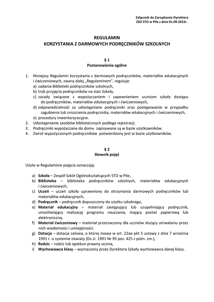 Załącznik do Zarządzenia Dyrektora ZSO STO w Pile z dnia 01.09.2015r. REGULAMIN KORZYSTANIA Z DARMOWYCH PODRĘCZNIKÓW SZKOLNYCH §1 Postanowienia ogólne 1. 2. 3. 4. Niniejszy Regulamin korzystania z darmowych podręczników, materiałów edukacyjnych i ćwiczeniowych, zwany dalej „Regulaminem”, reguluje: a) zadania Biblioteki podręczników szkolnych, b) tryb przyjęcia podręczników na stan Szkoły, c) zasady związane z wypożyczaniem i zapewnieniem uczniom szkoły dostępu do podręczników, materiałów edukacyjnych i ćwiczeniowych, d) odpowiedzialność za udostępniane podręczniki oraz postępowanie w przypadku zagubienia lub zniszczenia podręcznika, materiałów edukacyjnych i ćwiczeniowych, e) procedury inwentaryzacyjne. Udostępnianie zasobów bibliotecznych podlega rejestracji. Podręczniki wypożyczane do domu zapisywane są w bazie użytkowników. Zwrot wypożyczonych podręczników potwierdzony jest w bazie użytkowników. §2 Słownik pojęć Użyte w Regulaminie pojęcia oznaczają: a) Szkoła – Zespół Szkół Ogólnokształcących STO w Pile, b) Biblioteka – biblioteka podręczników szkolnych, materiałów edukacyjnych i ćwiczeniowych, c) Uczeń – uczeń szkoły uprawniony do otrzymania darmowych podręczników lub materiałów edukacyjnych, d) Podręcznik – podręcznik dopuszczony do użytku szkolnego, e) Materiał edukacyjny – materiał zastępujący lub uzupełniający podręcznik, umożliwiający realizację programu nauczania, mający postać papierową lub elektroniczną. f) Materiał ćwiczeniowy – materiał przeznaczony dla uczniów służący utrwalaniu przez nich wiadomości i umiejętności. g) Dotacja – dotacja celowa, o której mowa w art. 22ae pkt 5 ustawy z dnia 7 września 1991 r. o systemie oświaty (Dz.U. 1991 Nr 95 poz. 425 z późn. zm.), h) Rodzic – rodzic lub opiekun prawny ucznia, i) Wychowawca klasy – wyznaczony przez Dyrektora Szkoły wychowawca danej klasy. §3 Zadania Biblioteki podręczników szkolnych 1. 2. 3. Biblioteka podręczników szkolnych, zwana dalej Biblioteką, gromadzi podręczniki, materiały edukacyjne, materiały ćwiczeniowe i inne materiały biblioteczne. Biblioteka nieodpłatnie: a) wypożycza uczniom podręczniki lub materiały edukacyjne, mające postać papierową, b) zapewnia uczniom dostęp do podręczników lub materiałów edukacyjnych, mających postać elektroniczną, c) przekazuje uczniom materiały ćwiczeniowe lub je udostępnia. Dołączona do podręcznika lub materiałów edukacyjnych płyta CD stanowi Integralną część podręcznika lub materiałów edukacyjnych i należy ją zwrócić wraz z podręcznikiem lub materiałem edukacyjnym. Zagubienie płyty CD skutkuje koniecznością zwrotu kosztów całego podręcznika lub materiałów edukacyjnych. §4 Przyjęcie podręczników na stan szkoły 1. 2. 3. Podręczniki, materiały edukacyjne i materiały ćwiczeniowe przekazane Szkole w ramach dotacji zostają przekazane na stan Biblioteki na podstawie stosownego protokołu, którego wzór stanowi Załącznik nr 1 do niniejszego Regulaminu. Podręczniki, materiały edukacyjne, materiały ćwiczeniowe i inne materiały biblioteczne stanowią własność Szkoły. Podręczniki, materiały edukacyjne i materiały ćwiczeniowe przekazane Szkole w ramach dotacji winny być użytkowane przez okres minimum trzech lat. §5 Użytkownicy Biblioteki podręczników szkolnych 1. 2. 3. Do wypożyczania podręczników lub materiałów edukacyjnych uprawnieni są wszyscy uczniowie Szkoły Podstawowej oraz uczniowie Gimnazjum uczęszczający do klas korzystających z podręczników, na które została przeznaczona dotacja celowa z MEN. Użytkownicy Biblioteki przed rozpoczęciem korzystania z jej zbiorów podlegają rejestracji. Uczniowie są rejestrowani na podstawie dostarczonych do Biblioteki list zgodnych z listą klasy zamieszczoną w dzienniku lekcyjnym. §6 Okres trwania wypożyczenia 1. 2. 3. Wypożyczanie podręczników odbywa się na początku każdego roku szkolnego. Podręczniki wypożyczane są na okres 10 miesięcy, a termin ich zwrotu mija 20 czerwca danego roku szkolnego. Biblioteka w uzasadnionych okolicznościach ma prawo zażądać zwrotu wypożyczonych materiałów przed upływem ustalonego terminu. 4. Uczeń, który został skreślony z listy uczniów w trakcie roku szkolnego, zobowiązany jest niezwłocznie zwrócić otrzymane podręczniki lub materiały edukacyjne. §7 Procedura wypożyczania podręcznika 1. 2. 3. Na początku roku szkolnego wychowawca klasy pobiera z Biblioteki podręczniki lub materiały edukacyjne w liczbie równej liczbie uczniów swojej klasy. Wraz z pobraniem podręczników i materiałów ćwiczeniowych (Załącznik nr 2) wychowawca klasy ma obowiązek przygotować protokół przekazania materiałów ćwiczeniowych oraz wypożyczenia podręczników (Załącznik nr 3). Wychowawca ma obowiązek poinformować rodziców, aby przed wypożyczeniem sprawdzili stan podręczników, materiałów edukacyjnych i ćwiczeniowych, a ewentualne uszkodzenia natychmiast zgłosili wychowawcy. §8 Obowiązki ucznia związane z wypożyczeniem 1. 2. 3. 4. 5. Przez cały okres użytkowania podręczników uczeń dba o nie - podręczniki, materiały edukacyjne i materiały ćwiczeniowe są przez rodziców dzieci zabezpieczone przed zniszczeniem poprzez nałożenie na każdy z egzemplarzy okładki z folii lub obłożenie papierem, celem zapewnienia ich wieloletniego użytkowania. Uczeń ma obowiązek na bieżąco dokonywać drobnych napraw czy ewentualnej wymiany okładki. Zabrania się dokonywania jakichkolwiek wpisów i notatek w podręcznikach. Dopuszcza się używania ołówka w celu zaznaczenia (np. pracy domowej). Wraz z upływem terminu zwrotu (koniec roku szkolnego) uczeń powinien uporządkować podręczniki, tj. powycierać wszystkie wpisy ołówka, podkleić, obłożyć nową okładką, jeśli wcześniejsza ulegnie zniszczeniu, a następnie oddać do biblioteki wszys