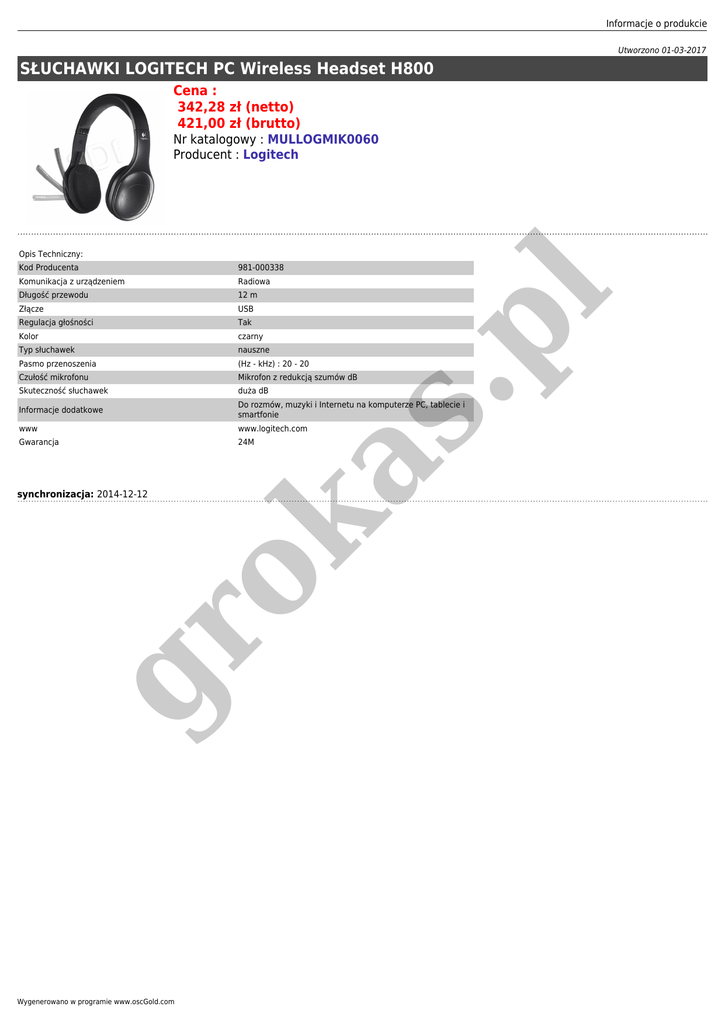 Informacje o produkcie Utworzono 01-03-2017 SŁUCHAWKI LOGITECH PC Wireless Headset H800 Cena : 342,28 zł (netto) 421,00 zł (brutto) Nr katalogowy : MULLOGMIK0060 Producent : Logitech Opis Techniczny: 981-000338 Komunikacja z urządzeniem Radiowa Długość przewodu 12 m Złącze USB Regulacja głośności Tak Kolor czarny Typ słuchawek nauszne Pasmo przenoszenia (Hz - kHz) : 20 - 20 Czułość mikrofonu Mikrofon z redukcją szumów dB Skuteczność słuchawek duża dB Informacje dodatkowe Do rozmów, muzyki i Internetu na komputerze PC, tablecie i smartfonie www www.logitech.com Gwarancja 24M gr as ok synchronizacja: 2014-12-12 Wygenerowano w programie www.oscGold.com .p l Kod Producenta