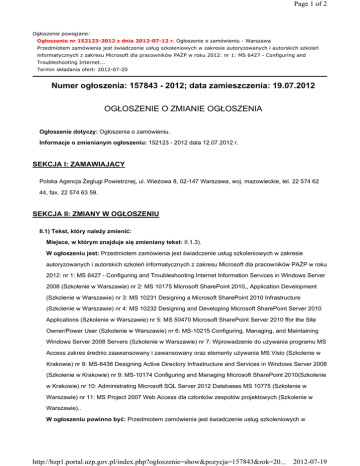 Page 1 of 2 Ogłoszenie powiązane: Ogłoszenie nr 152123-2012 z dnia 2012-07-12 r. Ogłoszenie o zamówieniu - Warszawa Przedmiotem zamówienia jest świadczenie usług szkoleniowych w zakresie autoryzowanych i autorskich szkoleń informatycznych z zakresu Microsoft dla pracowników PAŻP w roku 2012: nr 1: MS 6427 - Configuring and Troubleshooting Internet... Termin składania ofert: 2012-07-20 Numer ogłoszenia: 157843 - 2012; data zamieszczenia: 19.07.2012 OGŁOSZENIE O ZMIANIE OGŁOSZENIA Ogłoszenie dotyczy: Ogłoszenia o zamówieniu. Informacje o zmienianym ogłoszeniu: 152123 - 2012 data 12.07.2012 r. SEKCJA I: ZAMAWIAJĄCY Polska Agencja Żeglugi Powietrznej, ul. Wieżowa 8, 02-147 Warszawa, woj. mazowieckie, tel. 22 574 62 44, fax. 22 574 63 59. SEKCJA II: ZMIANY W OGŁOSZENIU II.1) Tekst, który należy zmienić: Miejsce, w którym znajduje się zmieniany tekst: II.1.3). W ogłoszeniu jest: Przedmiotem zamówienia jest świadczenie usług szkoleniowych w zakresie autoryzowanych i autorskich szkoleń informatycznych z zakresu Microsoft dla pracowników PAŻP w roku 2012: nr 1: MS 6427 - Configuring and Troubleshooting Internet Information Services in Windows Server 2008 (Szkolenie w Warszawie) nr 2: MS 10175 Microsoft SharePoint 2010,, Application Development (Szkolenie w Warszawie) nr 3: MS 10231 Designing a Microsoft SharePoint 2010 Infrastructure (Szkolenie w Warszawie) nr 4: MS 10232 Designing and Developing Microsoft SharePoint Server 2010 Applications (Szkolenie w Warszawie) nr 5: MS 50470 Microsoft SharePoint Server 2010 ffor the Site Owner/Power User (Szkolenie w Warszawie) nr 6: MS-10215 Configuring, Managing, and Maintaining Windows Server 2008 Servers (Szkolenie w Warszawie) nr 7: Wprowadzenie do używania programu MS Access zakres średnio zaawansowany i zawansowany oraz elementy używania MS Visio (Szkolenie w Krakowie) nr 8: MS-6436 Designing Active Directory Infrastructure and Services in Windows Server 2008 (Szkolenie w Krakowie) nr 9: MS-10174 Configuring and Managing Microsoft SharePoint 2010(Szkolenie w Krakowie) nr 10: Administrating Microsoft SQL Server 2012 Datebases MS 10775 (Szkolenie w Warszawie) nr 11: MS Project 2007 Web Access dla członków zespołów projektowych (Szkolenie w Warszawie).. W ogłoszeniu powinno być: Przedmiotem zamówienia jest świadczenie usług szkoleniowych w http://bzp1.portal.uzp.gov.pl/index.php?ogloszenie=show&pozycja=157843&rok=20... 2012-07-19 Page 2 of 2 zakresie autoryzowanych i autorskich szkoleń informatycznych z zakresu Microsoft dla pracowników PAŻP w roku 2012: nr 1: MS 6427 - Configuring and Troubleshooting Internet Information Services in Windows Server 2008 (Szkolenie w Warszawie) nr 2: MS 10175 Microsoft SharePoint 2010,, Application Development (Szkolenie w Warszawie) nr 3: MS 10231 Designing a Microsoft SharePoint 2010 Infrastructure(Szkolenie w Warszawie) nr 4: MS 10232 Designing and Developing Microsoft SharePoint Server 2010 Applications (Szkolenie w Warszawie) nr 5: MS 50470 Microsoft SharePoint Server 2010 ffor the Site Owner/Power User (Szkolenie w Warszawie) nr 6: MS-10215 Configuring, Managing, and Maintaining Windows Server 2008 Servers (Szkolenie w Warszawie) nr 7: Wprowadzenie do używania programu MS Access zakres średnio zaawansowany i zawansowany oraz elementy używania MS Visio (Szkolenie w Krakowie) nr 8: MS-6436 Designing Active Directory Infrastructure and Services in Windows Server 2008 (Szkolenie w Krakowie) nr 9: MS-10174 Configuring and Managing Microsoft SharePoint 2010(Szkolenie w Warszawie) nr 10: Administrating Microsoft SQL Server 2012 Datebases MS 10775 (Szkolenie w Warszawie) nr 11: MS Project 2010 Web Access dla członków zespołów projektowych (Szkolenie w Warszawie).. http://bzp1.portal.uzp.gov.pl/index.php?ogloszenie=show&pozycja=157843&rok=20... 2012-07-19