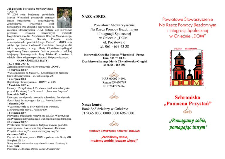 Jak powstało Powiatowe Stowarzyszenie "DOM"? W 2004 roku bezdomny gnieźnianin Marian Wierzbicki postanowił pomagać innym bezdomnym i potrzebującym. Zmobilizował środowisko osób bezdomnych oraz ubogich i doprowadził do założenia Stowarzyszenia DOM, zostając jego pierwszym prezesem. Działania bezdomnych wspierało błogosławieństwo Ks. Arcybiskupa Henryka Muszyńskiego, pomoc Prezydenta, Starosty Powiatu, władz samorządowych, gnieźnieńskiego Caritas", MOPS oraz wielka życzliwość i ofiarność Gnieźnian. Szeregi zasilili także sympatycy z mgr Marią Chwiałkowską-Grygiel współtwórcą Stowarzyszenia. Dziś to powstałe z oddolnej inicjatywy Stowarzyszenie liczy blisko 40 członków i udziela różnorakiego wsparcia ponad 100 podopiecznym. NAJWAŻNIEJSZE DATY: 10, 31 maja 2004 r. Zebrania założycielskie Stowarzyszenia „DOM”. 15 czerwca 2004 r. Wynajem lokalu od Starosty J. Kowalskiego na pierwsze biuro Stowarzyszenia – ul. Sobieskiego 20. 16 sierpnia 2004 Rejestracja Stowarzyszenia „DOM” w KRS. 12 kwietnia 2005 r. Umowy z Prezydentem J. Dzielem - przekazaniu budynku przy ul. Pocztowej 6 na Schronisko „Pomocna Przystań” 9 września 2005 r. Uroczyste poświęcenie i otwarcie schroniska. Poświęcenie figury Serca Jezusowego – dar o.o. Franciszkanów. 1 sierpnia 2006 Wydzierżawienie od PKP budynku na warsztaty Stowarzyszenia przy ul. Pocztowej 9. 18 stycznia 2007 Pozyskanie mieszkania rotacyjnego (ul. Św. Wawrzyńca) dla Programu Indywidualnego Wchodzenia z Bezdomności. 25 stycznia 2007 r. Przekazanie Stowarzyszeniu budynku i terenu poszklarniowego na ul. Kawiary na filię schroniska „Pomocna Przystań –Kawiary” – teren rekreacyjny i ogród. 4 czerwca 2009 r. Pięciolecie Stowarzyszenia DOM – poświęcenie Groty MB Sierpień 2011 r. Nowy pawilon warsztatów przy schronisku na ul. Pocztowej 6 Lipiec 2014 r. Powstanie „Rodzinnego Ogrodu Zabaw „Marianówka” NASZ ADRES: Powiatowe Stowarzyszenie Na Rzecz Pomocy Bezdomnym i Integracji Społecznej w Gnieźnie „DOM” ul. Pocztowa 6 tel. 061 - 633 43 38 Powiatowe Stowarzyszenie Na Rzecz Pomocy Bezdomnym i Integracji Społecznej w Gnieźnie „DOM” Kierownik Ośrodka Marian Wierzbicki –Prezes kom. 508 75 60 33 Z-ca kierownika mgr Maria Chwiałkowska-Grygiel kom. 661 263 009 KRS 0000214496, Regon 634609799 NIP 7842274569 Nasze konto: Bank Spółdzielczy w Gnieźnie 71 9065 0006 0000 0000 6969 0001 PROSIMY O WSPARCIE NASZYCH DZIAŁAŃ „Zrobiliśmy wiele, możemy zrobić jeszcze więcej” Schronisko „Pomocna Przystań” „Pomagamy sobie, pomagając innym" Schronisko „Pomocna Przystań” , ul. Pocztowa 6 Stowarzyszenie DOM otworzyło 9 września 2005 r. pierwszy dom przy ul. Pocztowej 6 dla 25-35 bezdomnych z terenu miasta i powiatu gnieźnieńskiego. Budynek PKP pozyskano dzięki władzom miasta, po wyremontowaniu go i zagospodarowaniu przyległego terenu, zaadaptowano dla potrzeb schroniska. Dokonano tego przede wszystkim pracą samych bezdomnych, którzy nie szczędzili trudu i poświęcenia. Schronisko ma charakter domu rodzinnego w którym jego mieszkańcy stanowią wspólnotę domu. W schronisku realizujemy od 10 lat program „Terapii i reintegracji osób bezdomnych uzależnionych od alkoholu” (lekarz, psycholog, pielęgniarka, dwie terapeutki i pięciu opiekunów) finansowany przez Urząd Miasta Gniezna. Pomagamy podopiecznym w rozwiązywaniu problemów życiowych, próbach poszukiwania pracy (warsztat). Prowadzony jest tutaj także punkt charytatywny, na który składają się: punkt wydawania odzieży i jedzenia, łaźnia i pralnia dla osób bezdomnych spoza schroniska, którym udziela się pomocy doraźnej. W schroniskach Stowarzyszenia prowadzony jest Indywidualny Program Wychodzenia z Bezdomności, którego ważnym elementem jest mieszkanie rotacyjne dla najbardziej zaawansowanych pozyskane dzięki Urzędowi Miasta Gniezna. Filia schroniska „Pomocna Przystań-Kawiary” ul. Kawiary 40 Od lutego 2007 roku posiadamy także w Gnieźnie filię naszego schroniska. Dzięki przychylności Prezydenta i władz miasta otrzymaliśmy w użytkowanie od Spółki „Urbis” budynek z rozległym terenem rekreacyjnym i ogrodowym. Filia Kawiary może pomieścić 15 osób (w okresie zimowym do 25 osób). Na terenie schroniska realizowane są takie same programy jak w schronisku przy ul. Pocztowej. Dodatkowym walorem filii jest duży teren poszklarniowy, gdzie nasi podopieczni prowadzą intensywne uprawy warzyw. Praca w ogrodzie jest bardzo ważnym elementem wspomagania terapii AA oraz wspomaga proces rehabilitacji zarówno fizycznej jak i psychicznej naszych mieszkańców. W ramach programu integracji społecznej, razem z naszymi mieszkańcami realizujemy wiele spotkań integracyjnych (Dzień Dziecka, Święto Pyry, spotkania z władzami miasta, przyjaciółmi Stowarzyszenia, itd.). Służy temu teren rekreacyjny rozbudowany w 2014 r. na który składa się przygotowany dla społeczności lokalnej Rodzinny Ogród Zabaw „Marianówka”, teren rekreacji sportowej, kawiarenka letnia a przy Grocie M.B. z Lourdes główne miejsce imprez, oraz mini zwierzyniec – 2 konie, świnki, kotki, pieski, gołębie (zooterapia). W ramach programu integracji odbyły się także wyjazdy naszych podopiecznych z obu schroniska na pielgrzymki do Częstochowy, Lichenia, Łagiewnik, Bolechowa i Słupcy. Warsztaty Stowarzyszenia, ul. Pocztowa 6. Przy schronisku, wysiłkiem bezdomnych i Stowarzyszenia powstały warsztaty: usługoworemontowy i artystycznorzemieślniczy, gdzie nasi podopieczni pracują zarobkowo, oraz rozwijają swoje uzdolnienia artystyczne. Wyposażenie warsztatów było możliwe dzięki dotacjom konkursowym Urzędu Miasta Gniezna, Starostwa Powiatu Gnieźnieńskiego, Urzędu Wojewody Wielkopolskiego oraz Ministerstwa Pracy i Polityki Społecznej (FIO). Pomagali nam także liczni darczyńcy i sponsorzy. Obecnie działa ślusarnia, stolarnia, brygada remontowa oraz warsztat artystyczn