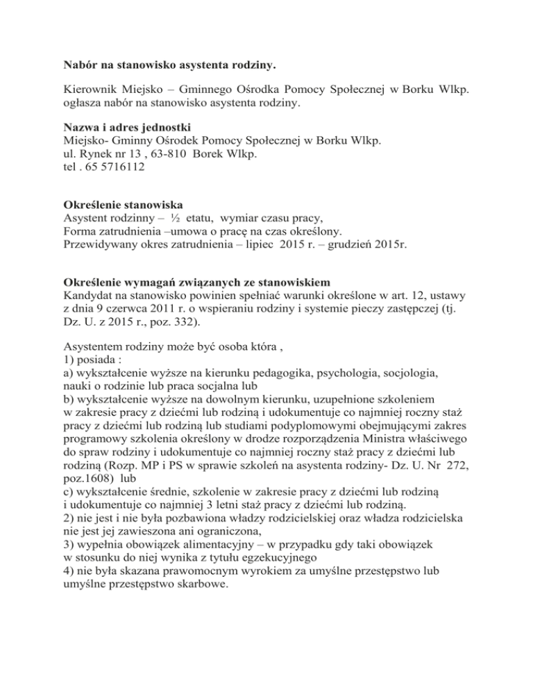 Nabór na stanowisko asystenta rodziny. Kierownik Miejsko – Gminnego Ośrodka Pomocy Społecznej w Borku Wlkp. ogłasza nabór na stanowisko asystenta rodziny. Nazwa i adres jednostki Miejsko- Gminny Ośrodek Pomocy Społecznej w Borku Wlkp. ul. Rynek nr 13 , 63-810 Borek Wlkp. tel . 65 5716112 Określenie stanowiska Asystent rodzinny – ½ etatu, wymiar czasu pracy, Forma zatrudnienia –umowa o pracę na czas określony. Przewidywany okres zatrudnienia – lipiec 2015 r. – grudzień 2015r. Określenie wymagań związanych ze stanowiskiem Kandydat na stanowisko powinien spełniać warunki określone w art. 12, ustawy z dnia 9 czerwca 2011 r. o wspieraniu rodziny i systemie pieczy zastępczej (tj. Dz. U. z 2015 r., poz. 332). Asystentem rodziny może być osoba która , 1) posiada : a) wykształcenie wyższe na kierunku pedagogika, psychologia, socjologia, nauki o rodzinie lub praca socjalna lub b) wykształcenie wyższe na dowolnym kierunku, uzupełnione szkoleniem w zakresie pracy z dziećmi lub rodziną i udokumentuje co najmniej roczny staż pracy z dziećmi lub rodziną lub studiami podyplomowymi obejmującymi zakres programowy szkolenia określony w drodze rozporządzenia Ministra właściwego do spraw rodziny i udokumentuje co najmniej roczny staż pracy z dziećmi lub rodziną (Rozp. MP i PS w sprawie szkoleń na asystenta rodziny- Dz. U. Nr 272, poz.1608) lub c) wykształcenie średnie, szkolenie w zakresie pracy z dziećmi lub rodziną i udokumentuje co najmniej 3 letni staż pracy z dziećmi lub rodziną. 2) nie jest i nie była pozbawiona władzy rodzicielskiej oraz władza rodzicielska nie jest jej zawieszona ani ograniczona, 3) wypełnia obowiązek alimentacyjny – w przypadku gdy taki obowiązek w stosunku do niej wynika z tytułu egzekucyjnego 4) nie była skazana prawomocnym wyrokiem za umyślne przestępstwo lub umyślne przestępstwo skarbowe. 1 ) Wymagane kwalifikacje: a) obywatelstwo polskie, b) pełna zdolność do czynności prawnych oraz korzystanie z pełni praw publicznych. 2 ) Dodatkowo a) znajomość obsługi komputera i programów biurowych, b) doświadczenie w pracy na podobnym stanowisku, c) znajomość lokalnego środowiska oraz umiejętność nawiązywania współpracy z jednostkami i instytucjami pomocy społecznej, d) wysoka kultura osobista, obowiązkowość i punktualność, e) komunikatywność, empatia, zaangażowanie, asertywność, f) umiejętność współpracy w zespole, g) odporność na sytuacje stresowe, h) umiejętność zachowania bezstronności w kontakcie z rodziną, i) dyspozycyjność, j) kreatywność, k) prawo jazdy kat. „B” ,własny środek transportu, l) znajomość przepisów ustawy z dnia 12 marca 2004 r. o pomocy społecznej i innych aktów normatywnych związanych z pomocą społeczną. Zakres zadań wykonywanych na stanowisku : Głównym obowiązkiem asystenta rodziny będzie wsparcie i aktywizacja rodzin zagrożonych wykluczeniem społecznym oraz kierowanie procesem zmiany postaw życiowych członków rodziny. (opis stanowiska pracy – załącznik nr 1). Wymagane dokumenty: - list motywacyjny z CV, - kwestionariusz osobowy z uwzględnieniem dokładnego przebiegu kariery zawodowej,(załącznik) - kserokopię świadectw pracy, - kserokopię dokumentów potwierdzających posiadane wykształcenie, - kserokopię dokumentów potwierdzających posiadanie wymaganych uprawnień i umiejętności, - podpisane pisemne oświadczenie o niekaralności za przestępstwa umyślne i korzystanie w pełni praw publicznych, - oświadczenie, że kandydat nie jest i nie był pozbawiony władzy rodzicielskiej oraz , że władza nie jest ograniczona, - oświadczenie, że kandydat wypełnia obowiązek alimentacyjny w przypadku gdy taki obowiązek został nałożony na podstawie tytułu wykonawczego. Terminy i miejsce składania wymaganych dokumentów. Wymagane dokumenty aplikacyjne należy składać w siedzibie MiejskoGminnego Ośrodka Pomocy Społecznej, ul Rynek nr 13, 63-810 Borek Wlkp., osobiście lub drogą pocztową w kopercie z dopiskiem „Nabór na stanowisko asystenta rodziny” w terminie do 29 czerwca 2015 r. do godz.14.00 Aplikacje, które wpłyną po upływie terminu nie będą rozpatrywane. Kandydaci, których oferty spełnią wymagania formalne i zostaną złożone w wyznaczonym terminie, będą zaproszeni na rozmowę kwalifikacyjną. Informacje o wyniku naboru będzie umieszczona w Biuletynie Informacji Publicznej / www.bip.borekwlkp.pl / oraz na stronie internetowej MGOPS w Borku Wlkp. /www.borek.ops.org.pl/ a także na tablicy informacyjnej w siedzibie Miejsko - Gminnego Ośrodka Pomocy Społecznej w Borku Wlkp. Wymagane dokumenty aplikacyjne: list motywacyjny ,szczegółowe CV ( z uwzględnieniem dokładnego przebiegu kariery zawodowej) powinny być opatrzone klauzulą: „Wyrażam zgodę na przetwarzanie moich danych osobowych zawartych w ofercie pracy dla potrzeb niezbędnych do realizacji procesu rekrutacji zgodnie z ustawą z dnia 29 sierpnia 1997 r. o ochronie danych osobowych ( Dz. U. z 2014 r. ,poz. 1662) oraz ustawą z dnia 21 listopada 2008 r. o pracownikach samorządowych ( Dz. U. z 2014 r., poz. 1202)” Szczegółowych informacji udziela Dorota Dutkowiak - kierownik Miejsko Gminnego Ośrodka Pomocy Społecznej w Borku Wlkp. , telefon ( 65 5716112 ) Kierownik MGOPS w Borku Wlkp. Dorota Dutkowiak Załączniki : - Opis stanowiska pracy, - Kwestionariusz osobowy dla osoby ubiegającej się o zatrudnienie. Borek Wlkp., dnia 18.06 2015 r. Opis stanowiska pracy asystenta rodziny - zał.1 1) opracowanie i realizacja planu pracy z rodziną we współpracy z członkami rodziny i w konsultacji z pracownikiem socjalnym, 2) opracowanie, we współpracy z członkami rodziny i koordynatorem rodzinnej pieczy zastępczej, planu pracy z rodziną, który jest skoordynowany z planem pomocy dziecku umieszczonemu w pieczy zastępczej; 3) udzielanie pomocy rodzinom w poprawie ich sytuacji życiowej, w tym w zdobywaniu umiejętności 