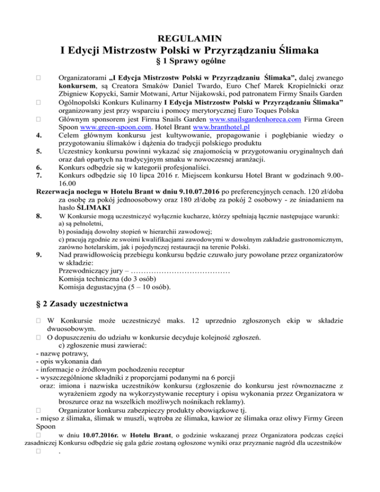 REGULAMIN I Edycji Mistrzostw Polski w Przyrządzaniu Ślimaka § 1 Sprawy ogólne Organizatorami „I Edycja Mistrzostw Polski w Przyrządzaniu Ślimaka”, dalej zwanego konkursem, są Creatora Smaków Daniel Twardo, Euro Chef Marek Kropielnicki oraz Zbigniew Kopycki, Samir Motwani, Artur Nijakowski, pod patronatem Firmy Snails Garden Ogólnopolski Konkurs Kulinarny I Edycja Mistrzostw Polski w Przyrządzaniu Ślimaka” organizowany jest przy wsparciu i pomocy merytorycznej Euro Toques Polska Głównym sponsorem jest Firma Snails Garden www.snailsgardenhoreca.com Firma Green Spoon www.green-spoon.com. Hotel Brant www.branthotel.pl 4. Celem głównym konkursu jest kultywowanie, propagowanie i pogłębianie wiedzy o przygotowaniu ślimaków i dążenia do tradycji polskiego produktu 5. Uczestnicy konkursu powinni wykazać się znajomością w przygotowaniu oryginalnych dań oraz dań opartych na tradycyjnym smaku w nowoczesnej aranżacji. 6. Konkurs odbędzie się w kategorii profesjonaliści. 7. Konkurs odbędzie się 10 lipca 2016 r. Miejscem konkursu Hotel Brant w godzinach 9.0016.00 Rezerwacja noclegu w Hotelu Brant w dniu 9.10.07.2016 po preferencyjnych cenach. 120 zł/doba za osobę za pokój jednoosobowy oraz 180 zł/dobę za pokój 2 osobowy - ze śniadaniem na hasło ŚLIMAKI 8. W Konkursie mogą uczestniczyć wyłącznie kucharze, którzy spełniają łącznie następujące warunki: a) są pełnoletni, b) posiadają dowolny stopień w hierarchii zawodowej; c) pracują zgodnie ze swoimi kwalifikacjami zawodowymi w dowolnym zakładzie gastronomicznym, zarówno hotelarskim, jak i pojedynczej restauracji na terenie Polski. 9. Nad prawidłowością przebiegu konkursu będzie czuwało jury powołane przez organizatorów w składzie: Przewodniczący jury – ………………………………… Komisja techniczna (do 3 osób) Komisja degustacyjna (5 – 10 osób). § 2 Zasady uczestnictwa W Konkursie może uczestniczyć maks. 12 uprzednio zgłoszonych ekip w składzie dwuosobowym. O dopuszczeniu do udziału w konkursie decyduje kolejność zgłoszeń. c) zgłoszenie musi zawierać: - nazwę potrawy, - opis wykonania dań - informacje o źródłowym pochodzeniu receptur - wyszczególnione składniki z proporcjami podanymi na 6 porcji oraz: imiona i nazwiska uczestników konkursu (zgłoszenie do konkursu jest równoznaczne z wyrażeniem zgody na wykorzystywanie receptury i opisu wykonania przez Organizatora w broszurce oraz na wszelkich możliwych nośnikach reklamy). Organizator konkursu zabezpieczy produkty obowiązkowe tj. - mięso z ślimaka, ślimak w muszli, wątroba ze ślimaka, kawior ze ślimaka oraz oliwy Firmy Green Spoon w dniu 10.07.2016r. w Hotelu Brant, o godzinie wskazanej przez Organizatora podczas części zasadniczej Konkursu odbędzie się gala gdzie zostaną ogłoszone wyniki oraz przyznanie nagród dla uczestników . Zgłoszenia drużyn należy przysyłać na e-mail: [email protected] [email protected] do 19 czerwca 2016 lista uczestników zostanie ogłoszona 27 czerwca 2016 lub W sprawach merytorycznych i technicznych prosimy o kontakt: [email protected] , [email protected] tel. HARMONOGRAM IMPREZY 9 lipca 2016 r sobota Godz 16.00 zakwaterowanie uczestników Godz 18.00 odprawa sędziów i ekip biorących udział w konkursie (preludium na temat ślimaków) omówienie konkursu, losowanie ekip i stanowisk Godz 19.30 wydawanie ślimaków Godz 20.00-23.00 kolacja chata grilowa 10 lipca 2016 r niedziela Godz 6.00 do 11.00 śniadanie Godz 8.30 przywitanie przez organizatorów ekip kucharskich Przedstawienie składu sędziowskiego, przedstawienie startujących ekip Godz 8.50 wejście na stanowiska pierwszych ekip Godzina 9.00-15.00 KONKURS KULINARNY Godzina 9.00-15.00 live cooking, pokazy na stanowiskach sponsorów, premiera książki ''Ślimaka Kulinarna Podróż'' Godz 19.00 Gala Dinner Ogłoszenie wyników konkursu oraz wręczanie nagród Zabawa do białego rana 11 lipca 2016 r poniedziałek Godz 6.00-11.00 śniadanie w hotelu Do godz 12.00 wymeldowanie z hotelu § 3 Zasady Konkursu 1. Przedmiotem konkursu jest wykonanie dania głównego: a) obowiązkowymi produktami do przygotowania potrawy są: - mięso z ślimaka, ślimak w muszli, wątroba ze ślimaka, kawior ze ślimaka oraz oliwy Firmy Green Spoon (wszystkie dania wykonane muszą być w 6 porcjach) 3. Organizator zapewnia: a) grill gazowy firmy Weber b) stanowisko stół roboczy ze zlewem c) piec konwekcyjno parowy d) 2 indukcje e) cyrkulator sous vide, vakowarka f) talerze od firmy Tom Gast (można wykorzystać swoje) 4. Wszystkie pozostałe produkty i sprzęty potrzebne do przygotowania dań konkursowych, warzywa, przyprawy, drobny sprzęt kuchenny (garnki, patelnie – przystosowane do kuchenek indukcyjnych) każda z ekip przywozi ze sobą. 5. Ekipy startują w dowolnym ubraniu kucharskim (bluza, zapaska, czapka). 6. Na przygotowanie potraw uczestnicy mają 60 minut. Dopuszcza się wcześniejsze przygotowanie (marynowanie) produktów, tj. warzyw i ryb, ale nie wcześniej niż 40 minut 7. przed rozpoczęciem konkursu. Każda ze startujących ekip przygotowuje: a) 1 talerz dania konkursowego do ekspozycji * 5 talerzy dania konkursowego dla jury degustacyjnego; Jury techniczne będzie kontaktowało się w trakcie oceny dań konkursowych z jury degustacyjnym. Zabrania się: stosowania sztucznych dekoracji DODATKÓW TAKIE JAK MIESO, RYBA !!!!!!!!!!! przygotowanych wcześniej dekoracji i dodatków (wszelkie elementy dekoracyjne powinny być wykonane podczas konkursu w regulaminowym czasie konkursowym) stosowania gotowych sosów stosowania gotowych farszów Dopuszcza się: używania dodatkowych źródeł energii cieplnej (np.; frytkownica, thermomix, schładzarka itp.) zastosowanie przygotowanych w następujący sposób produktów: warzywa i owoce – umyte, obrane, nie krojone grzyby - umyte, blanszowane, nie krojone ziemniaki / cebula - obrane, nie krojone ciasto podstawowe – neutralny smak. § 4 Sposób punk
