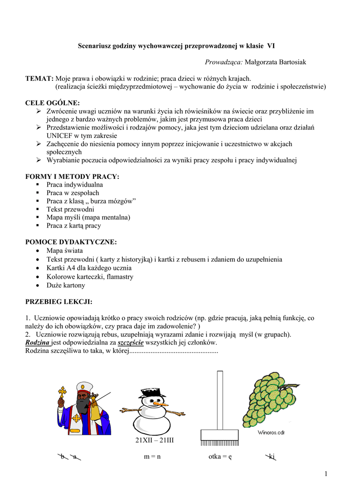 Scenariusz godziny wychowawczej przeprowadzonej w klasie VI Prowadząca: Małgorzata Bartosiak TEMAT: Moje prawa i obowiązki w rodzinie; praca dzieci w różnych krajach. (realizacja ścieżki międzyprzedmiotowej – wychowanie do życia w rodzinie i społeczeństwie) CELE OGÓLNE: Zwrócenie uwagi uczniów na warunki życia ich rówieśników na świecie oraz przybliżenie im jednego z bardzo ważnych problemów, jakim jest przymusowa praca dzieci Przedstawienie możliwości i rodzajów pomocy, jaka jest tym dzieciom udzielana oraz działań UNICEF w tym zakresie Zachęcenie do niesienia pomocy innym poprzez inicjowanie i uczestnictwo w akcjach społecznych Wyrabianie poczucia odpowiedzialności za wyniki pracy zespołu i pracy indywidualnej FORMY I METODY PRACY: Praca indywidualna Praca w zespołach Praca z klasą „ burza mózgów” Tekst przewodni Mapa myśli (mapa mentalna) Praca z kartą pracy POMOCE DYDAKTYCZNE: • Mapa świata • Tekst przewodni ( karty z historyjką) i kartki z rebusem i zdaniem do uzupełnienia • Kartki A4 dla każdego ucznia • Kolorowe karteczki, flamastry • Duże kartony PRZEBIEG LEKCJI: 1. Uczniowie opowiadają krótko o pracy swoich rodziców (np. gdzie pracują, jaką pełnią funkcję, co należy do ich obowiązków, czy praca daje im zadowolenie? ) 2. Uczniowie rozwiązują rebus, uzupełniają wyrazami zdanie i rozwijają myśl (w grupach). Rodzina jest odpowiedzialna za szczęście wszystkich jej członków. Rodzina szczęśliwa to taka, w której.................................................. 21XII – 21III b a m=n otka = ę ki 1 1. „ Burza mózgów”. Uczniowie wpisują na małych karteczkach obowiązki rodziców wobec rodziny (np. zapewnienie jedzenia, ubrania, mieszkania, snu i odpoczynku; troska o bezpieczeństwo; pomoc w trudnych sytuacjach; dbanie o rozwój umysłowy, fizyczny i społeczny dziecka itp.) oraz swoje obowiązki wobec rodziny (np. pomoc w codziennych pracach domowych, okazywanie szacunku rodzicom, rodzeństwu itp.) i naklejają na dużym kartonie. 2. Rozmowa z dziećmi na temat ich codziennego dnia. Samodzielne opracowanie przez uczniów w postaci mapy myśli ( mapy mentalnej) pracy nt. „Mój wczorajszy dzień”. Uczniowie od głównego słowa wyprowadzają promienie rozgałęziające się. Wzdłuż linii głównych i rozgałęzień wpisują słowa lub obrazki kluczowe (czynności) porządkując je wg hierarchii ważności (od centrum do obrzeży). 3. Nauczyciel krótko opisuje dzieciom sytuacje na świecie i mówi, czym jest przymusowa praca dzieci, ile dzieci musi pracować, w jakich krajach itp. 4. Praca w grupach. Każda grupa otrzymuje kartę z tekstem przewodnim historyjką i dołączonymi pytaniami, na które udziela odpowiedzi. (Brazylia. Ruben ma osiem lat. Codziennie spędza kilkanaście godzin na plantacji sizalu (roślina uprawna) w Brazylii. Cieszy się, że może pomóc swoim rodzicom, chociaż wpalałby chodzić do szkoły. Jego praca jest bardzo ciężka, często kaleczy sobie ręce o włókna sizalu. Wieczorem jest tak bardzo zmęczony, że nie ma ochoty nawet na zabawę. Zwłaszcza, że następnego dnia musi wstać przed wszystkimi i zaprowadzić zwierzęta, do wodopoju. Przy pracy na plantacji często zdarzają się wypadki, wiele dzieci zostaje okaleczonych na całe życie. Najbliższy lekarz jest za daleko, a poza tym za wizytę trzeba zapłacić. Rodzice Rubena nie mają tyle pieniędzy. Może, jeśli zbiory będą dobre, chłopiec będzie mógł pójść do szkoły by nauczyć się pisać, czytać, liczyć. Chyba wystarczy na to rok chodzenia do szkoły... Uczniowie wskazują region i kraj na mapie. Odpowiadają na pytania: Dlaczego Ruben i inne dzieci z Brazylii nie chodzą do szkoły? Jaki to może mieć wpływ na dzieci? Uczniowie zastanawiają się, jaki wpływ na dzieci ma konieczność ciężkiej, fizycznej pracy w rolnictwie? Uczniowie tworzą plan zajęć Rubena i porównują go ze swoim rozkładem dnia. Dzieci zastanawiają się w jaki sposób można sprawić, żeby dzieci zmuszane do pracy mogły zamiast tego chodzić do szkoły, mieć czas na zabawę i odpoczynek. Podają przykłady takich działań ( np. wsparcie finansowe, opieka medyczna, zapewnienie edukacji itp.)Jakie są przyczyny tego, że dzieci na świecie są zmuszane do pracy? (np. choroby i śmierć rodziców, klęski żywiołowe, bieda, brak wykształcenia, trudna sytuacja materialna itp.). Dlaczego dzieci w Polsce są w lepszej sytuacji niż dziecko opisane w historyjce? 5. Prezentowanie wyników, podsumowanie i rozmowa o odczuciach dzieci, o tym co myślą, czy dzieci przymusowo pracujące są szczęśliwe? Kila słów o działalności UNICEF. 6. Zachęcenie dzieci do włączania się w pomoc, zbiórkę, pracę społeczną. Klasa zorganizuje akcję „ I Ty możesz zostać Św. Mikołajem (zbiórka : ubrania , książki, słodycze, artykuły papiernicze) na rzecz Domu Dziecka. 7. Praca domowa dla chętnych: wykonanie plakatu i haseł nawołujących do walki z przymusową pracą dzieci. 2