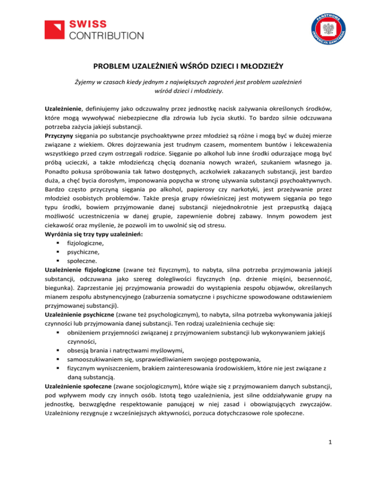 PROBLEM UZALEŻNIEŃ WŚRÓD DZIECI I MŁODZIEŻY Żyjemy w czasach kiedy jednym z największych zagrożeń jest problem uzależnień wśród dzieci i młodzieży. Uzależnienie, definiujemy jako odczuwalny przez jednostkę nacisk zażywania określonych środków, które mogą wywoływać niebezpieczne dla zdrowia lub życia skutki. To bardzo silnie odczuwana potrzeba zażycia jakiejś substancji. Przyczyny sięgania po substancje psychoaktywne przez młodzież są różne i mogą być w dużej mierze związane z wiekiem. Okres dojrzewania jest trudnym czasem, momentem buntów i lekceważenia wszystkiego przed czym ostrzegali rodzice. Sięganie po alkohol lub inne środki odurzające mogą być próbą ucieczki, a także młodzieńczą chęcią doznania nowych wrażeń, szukaniem własnego ja. Ponadto pokusa spróbowania tak łatwo dostępnych, aczkolwiek zakazanych substancji, jest bardzo duża, a chęć bycia dorosłym, imponowania popycha w stronę używania substancji psychoaktywnych. Bardzo często przyczyną sięgania po alkohol, papierosy czy narkotyki, jest przeżywanie przez młodzież osobistych problemów. Także presja grupy rówieśniczej jest motywem sięgania po tego typu środki, bowiem przyjmowanie danej substancji niejednokrotnie jest przepustką dającą możliwość uczestniczenia w danej grupie, zapewnienie dobrej zabawy. Innym powodem jest ciekawość oraz myślenie, że pozwoli im to uwolnić się od stresu. Wyróżnia się trzy typy uzależnień: fizjologiczne, psychiczne, społeczne. Uzależnienie fizjologiczne (zwane też fizycznym), to nabyta, silna potrzeba przyjmowania jakiejś substancji, odczuwana jako szereg dolegliwości fizycznych (np. drżenie mięśni, bezsenność, biegunka). Zaprzestanie jej przyjmowania prowadzi do wystąpienia zespołu objawów, określanych mianem zespołu abstynencyjnego (zaburzenia somatyczne i psychiczne spowodowane odstawieniem przyjmowanej substancji). Uzależnienie psychiczne (zwane też psychologicznym), to nabyta, silna potrzeba wykonywania jakiejś czynności lub przyjmowania danej substancji. Ten rodzaj uzależnienia cechuje się: obniżeniem przyjemności związanej z przyjmowaniem substancji lub wykonywaniem jakiejś czynności, obsesją brania i natręctwami myślowymi, samooszukiwaniem się, usprawiedliwianiem swojego postępowania, fizycznym wyniszczeniem, brakiem zainteresowania środowiskiem, które nie jest związane z daną substancją. Uzależnienie społeczne (zwane socjologicznym), które wiąże się z przyjmowaniem danych substancji, pod wpływem mody czy innych osób. Istotą tego uzależnienia, jest silne oddziaływanie grupy na jednostkę, bezwzględne respektowanie panującej w niej zasad i obowiązujących zwyczajów. Uzależniony rezygnuje z wcześniejszych aktywności, porzuca dotychczasowe role społeczne. 1 Uzależnić może wiele substancji, do najpopularniejszych zalicza się: nikotynę, alkohol, narkotyki. ALKOHOL Jest to najbardziej rozpowszechniona substancja psychoaktywna używana przez młodzież. Picie i upijanie się młodych ludzi stanowi duży problemem, bardzo często uzależnienie spowodowane jest zbyt wczesnym spróbowaniem alkoholu1. Wg danych GUS z roku 2009 r. w grupie młodzieży w wieku 15-19 lat, aż 42% badanych spożywało alkohol w ciągu 12 miesięcy poprzedzających badanie, w tym odsetek chłopców stanowił 48,4% i dziewcząt 35,3%. Analizując częstotliwość picia alkoholu - wśród młodych ludzi dominuje okazjonalne picie. Picie alkoholu przed okresem dojrzewania i w jego trakcie może znacznie wpłynąć na jego rozwój zarówno psychiczny jak i fizyczny, utrudniać uczenie się, a także zaburzać prawidłowe relacje interpersonalne. NIKOTYNA Papierosy są jedynym legalnie sprzedawanym na całym świecie produktem o udowodnionym działaniu rakotwórczym. Miliony dorosłych Polaków jest uzależnionych od nikotyny, ponieważ pierwszy papieros zapalili w bardzo młodym wieku. Można twierdzić, że gdyby sytuacji tej udało się uniknąć, najprawdopodobniej nie zaczęliby oni palić tytoniu2. Badania wykazują, że aż ok. 20% nastoletnich palaczy jest uzależnionych od nikotyny. Mózg młodego człowieka jest znacznie bardziej podatny na uzależnienie od nikotyny w porównaniu do osób starszych, a czas trwania palenia i liczba wypalonych papierosów wymaganych do powstania uzależnienia u młodzieży jest znacznie niższa niż u dorosłych. Badania dowodzą, że młody człowiek, już po kilku tygodniach od zapalenia pierwszego papierosa traci kontrolę nad paleniem3. Według danych GUS, w roku 2009 11,8% młodzieży w wieku 15-19 lat przyznało, że paliło papierosy. Spośród nich znacząca większość (7,3%) paliła codziennie, natomiast 4,5% osób paliło okazjonalnie. Ponadto zaobserwowano, że znacznie częściej palą mężczyźni niż kobiety. Odsetek nastoletnich mężczyzn palących powyżej 20 papierosów dziennie wynosi 19%, a dziewcząt w tym samym wieku – 7,4% 4. 1 Błaziński Z., Uzależnienia wśród młodzieży. Dok. elekt. [http://sod.ids.czest.pl/publikacje/l626/l626.pdf]. Blaziński Z., Uzależnienia wśród młodzieży. Dok. elekt. [http://sod.ids.czest.pl/publikacje/l626/l626.pdf]. 3 Biliński P., Bojar I, Wojtyła A. PALENIE TYTONIU WŚRÓD MŁODZIEŻY GIMNAZJALNEJ W POLSCE. Medycyna Ogólna (2010). Dok. elekt. [monz.pl/fulltxt.php?ICID=976963]. 4 GUS. Zdrowie dzieci i młodzieży w Polsce w 2009r. 2 2 NARKOTYKI Narkotyki, leki i inne środki chemiczne są dużym zagrożeniem dla młodzieży, a nawet dla dzieci. Każdy narkotyk oddziałuje inaczej na organizm różnych osób, jego przyjmowanie może wywoływać diametralnie różne efekty, nawet przy takiej samej dawce przyjętej substancji (od euforii, po paniczny lęk czy nawet próby samobójcze). Jednym ze wskaźników wykorzystywanym przy badaniu problemu używaniu narkotyków przez młode osoby jest wskaźnik obecności tego rodzaju substancji w ich otoczeniu. W badaniu przeprowad